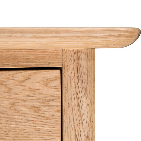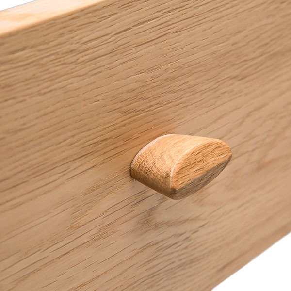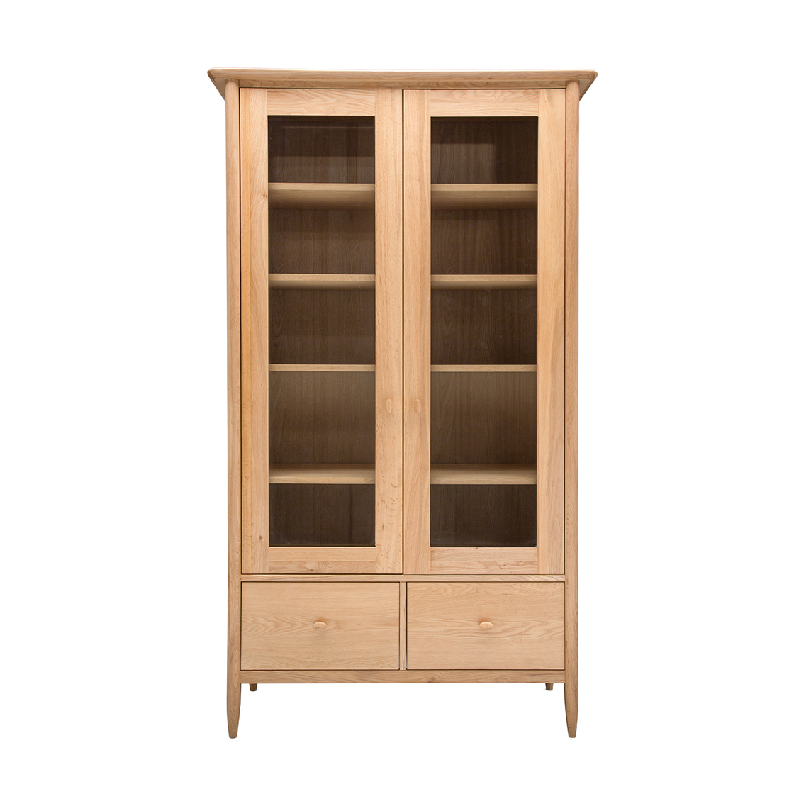The teramo display cabinet in pale oak is elegant and contemporary in design, with some classic elements such as its overhanging top. It has deep adjustable shelves, ideal for displaying treasured items behind the glass panelled doors. Below are two very useful deep drawers. The ercol design flair shows in the detailing, including distinctive oval handles and elegantly turned legs.