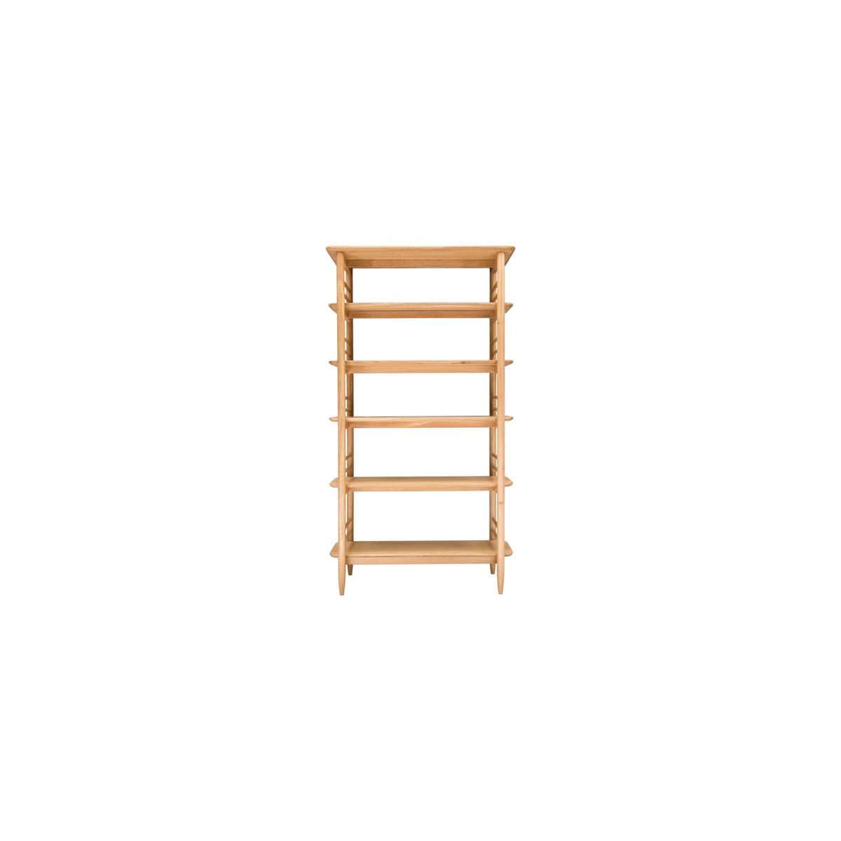 A beautifully designed, contemporary dining collection from ercol, inspired by the simplicity of the ‘Shaker’ style and handcrafted from pale oak. Elegant features include turned, tapered legs, overhanging tops and distinctive oval handles. The collection includes two different styles of dining chair, and an oval or rectangular dining table. Stylish shelving, cabinets, coffee and side table complete the range. Displaying ercol’s signature craftsmanship, the contemporary ercol Teramo shelving unit combines clean and simple Shaker-inspired style with distinctive design elements. Handcrafted from solid pale oak and oak veneers that are hand matched for grain and colour and finished with a durable matt lacquer, this display cabinet offers plenty of space on five broad protruding shelves. Distinctive side spindles are an attractive design detail – and also ensure that you can use these shelves to display books. Perfect for the modern home, its light and contemporary open design means this piece won’t overpower a smaller space while still providing exceptional storage capacity. The ercol Teramo shelving unit is part of the extensive ercol Teramo range. Offering a wide selection of living, dining and bedroom furniture, this charming range is characterised by classic ercol style and traditional furniture-making skills.