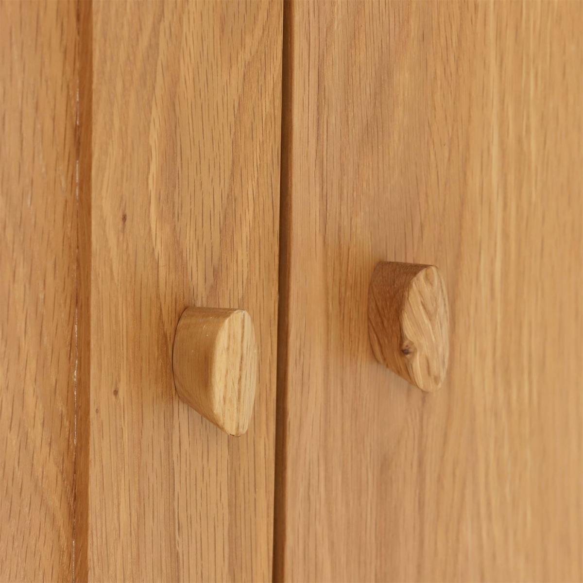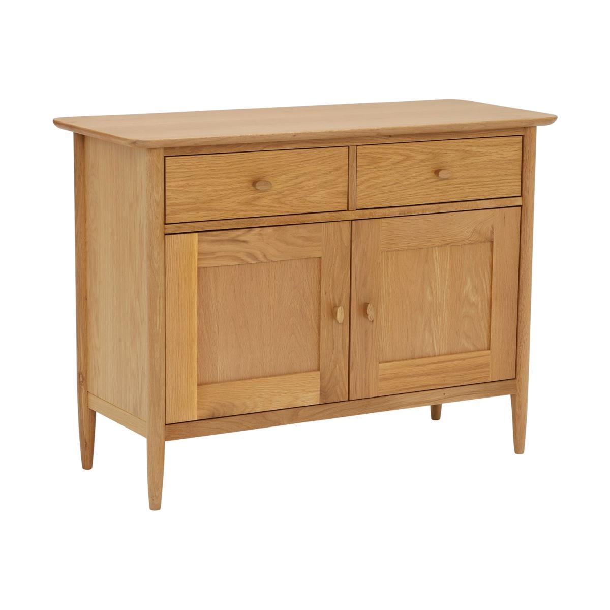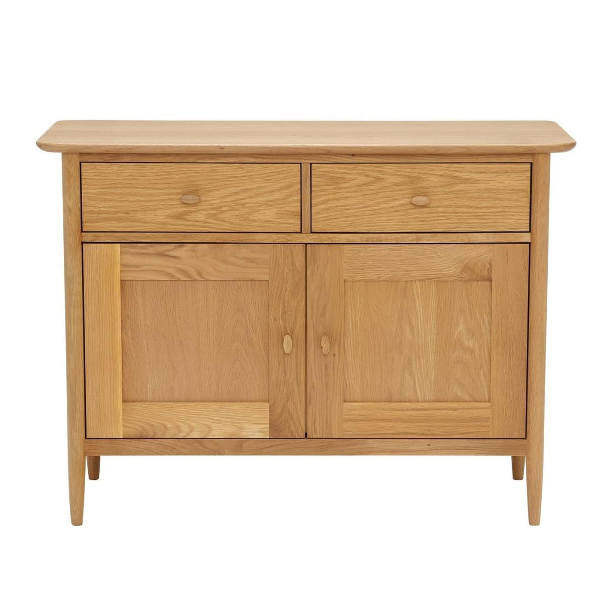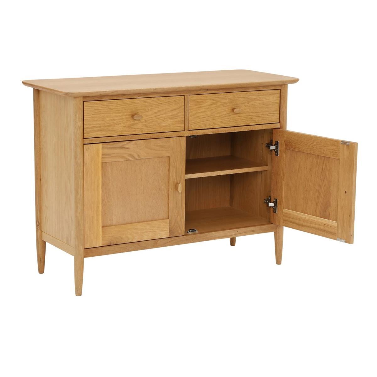 Design. The Teramo small sideboard in pale oak is elegantly designed, inspired by the purity of Shaker style, yet incorporating traditional elements such as dovetail jointed drawers and an overhanging top. There are two drawers above, with two cupboard doors below opening to show a spacious cupboard with a single deep adjustable shelf. The Ercol design ethos shows in the detailing, such as the distinctive oval handles and elegant turned legs. A contemporary design classic.