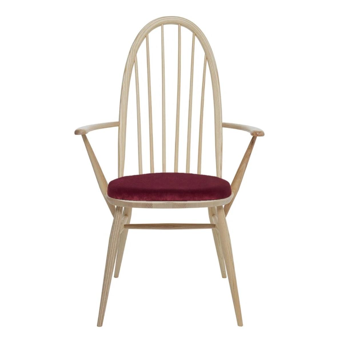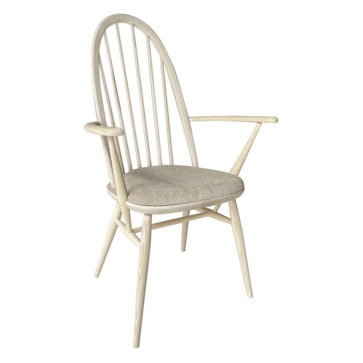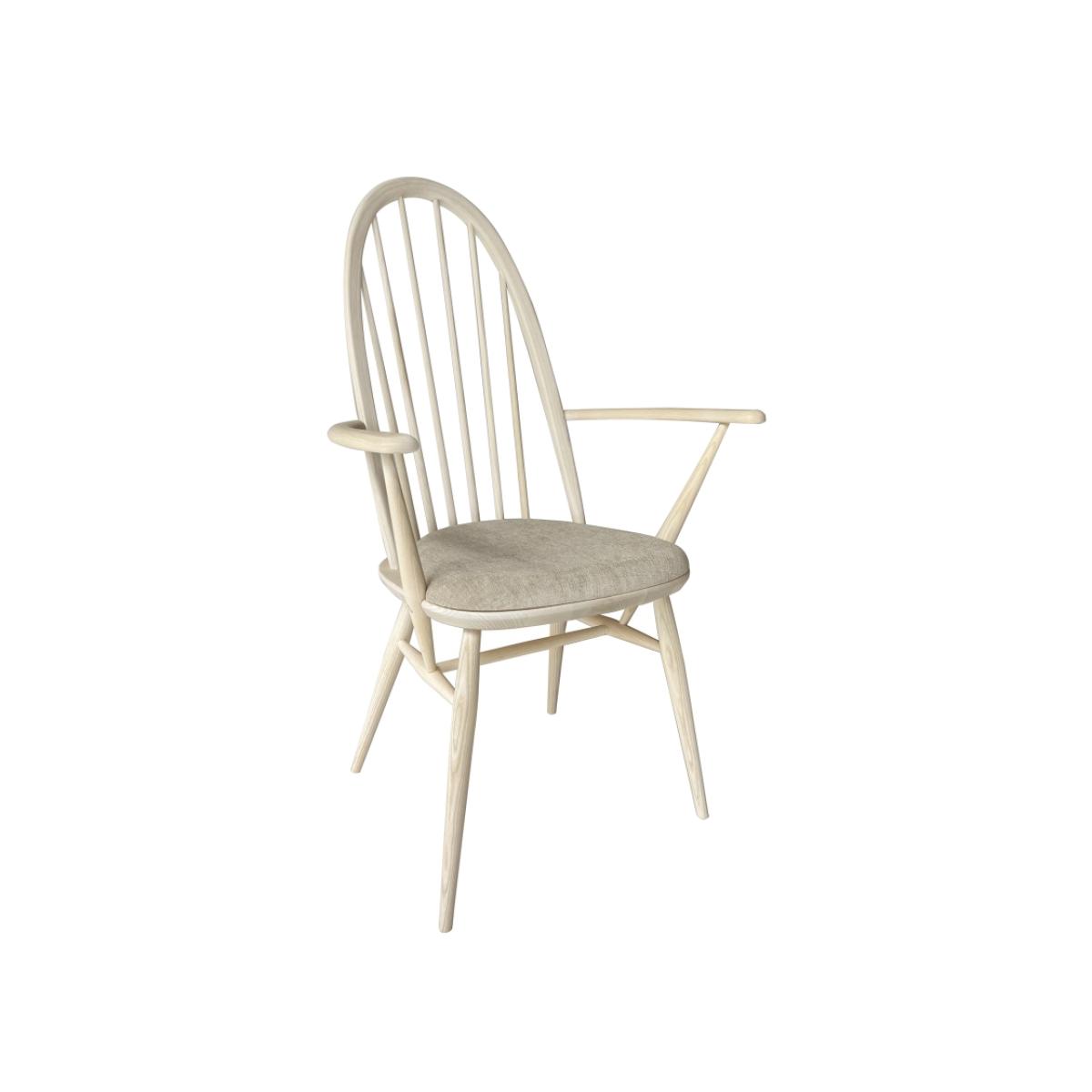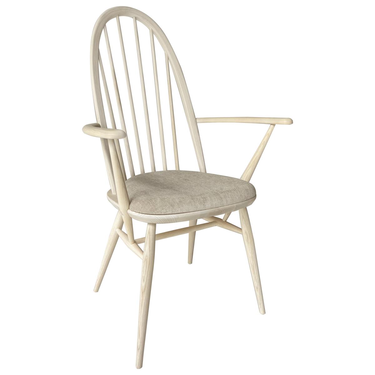 This distinctive Quaker Dining Armchair combines strength and durability with classic elegance. The six ash spindles and curved seatback, alongside the sculpted saddle seat and supportive armrests provide a comfortable and stylish sit. The chair bow is steam bent from a single straight ash rail and then sanded and shaped to give its subtle and elegant profile. Traditional wedge joints, where the legs come right through the seat and a wedge is then inserted into a cut, before the leg stump is hand sanded flush with the seat, both provide a lovely design detail and a very strong joint. Further strength is provided by the H-underframe. This Quaker dining room furniture will be finished in your choice from a selection of lacquer colours that both protects the timber, whilst enabling you to choose the look to match your style and decor. Complete with a seat pad made in your choice from the ercol collection of fabrics. Features: Arrives Fully Assembled Finished in your choice of lacquer colours Upholstered in your choice of stunning fabrics Solid Ash construction Country of origin UK Dimensions: Width: 64cm Depth: 60cm Height: 103cm Seat Height: 49cm Seat Width: 41cm Weight: 6kg Wood finishes and colour samples are shown for guidance only as screen colours may vary. We would recommend ordering a sample in your chosen finish. However, wood is a natural material and varies in colour, grain and structure.