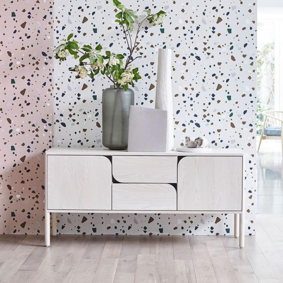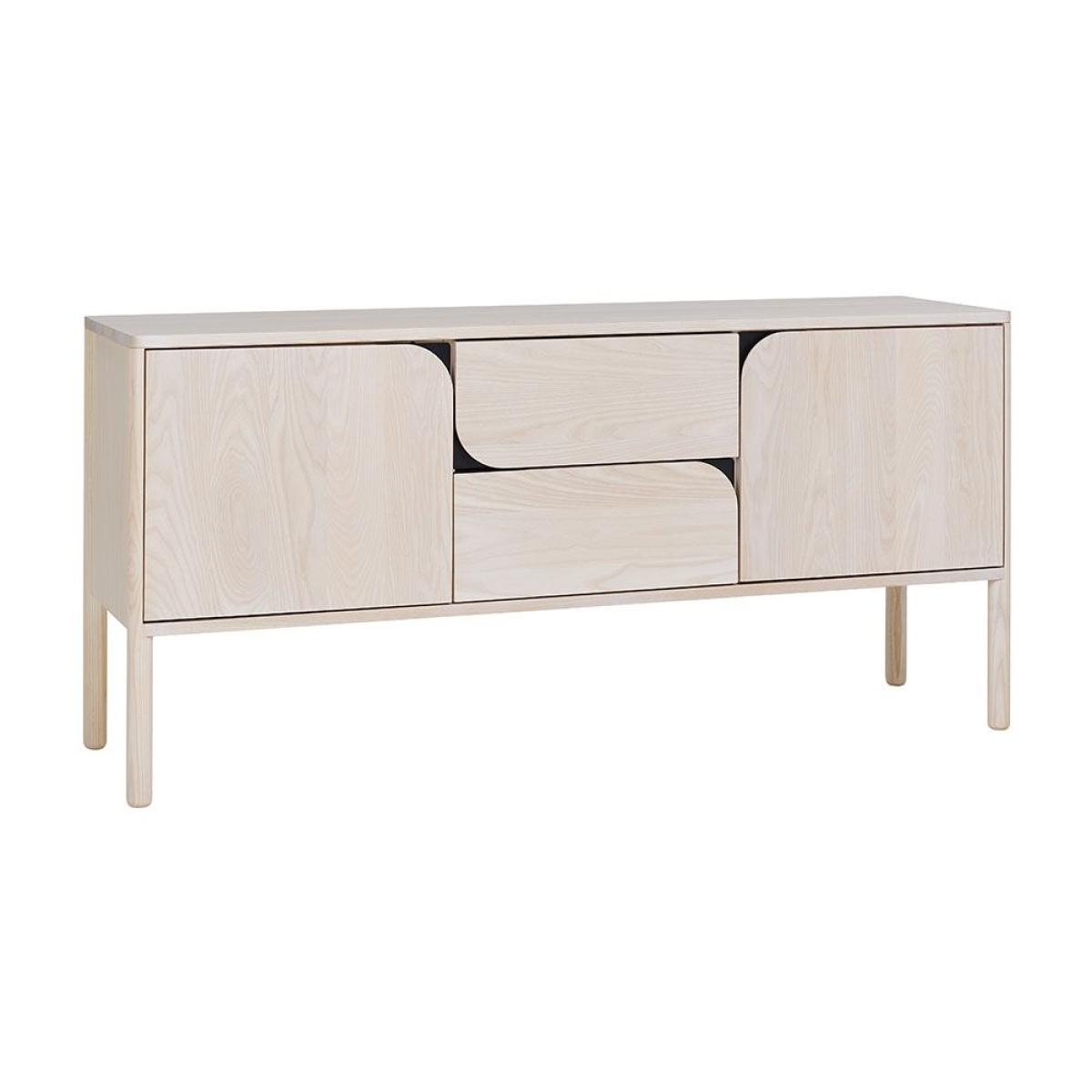 A substantial side board that is definitely a statement piece of furniture, the largest of the three Verso cabinets it has a light graceful appearance created through its elegant balanced proportions. The curved door and drawer pulls are finished in black steel or brass and form interesting shapes around the spacious soft close cupboards and drawers. Whilst the rounding of the cabinet feet emphasise a lightness and are an attractive design feature. The large sideboard is also practical with deep drawers and an adjustable shelf behind each door. Available in our standard ash finishes along with the new NM lightened or DA darkened finishes which highlight the beauty of the solid ash grain.