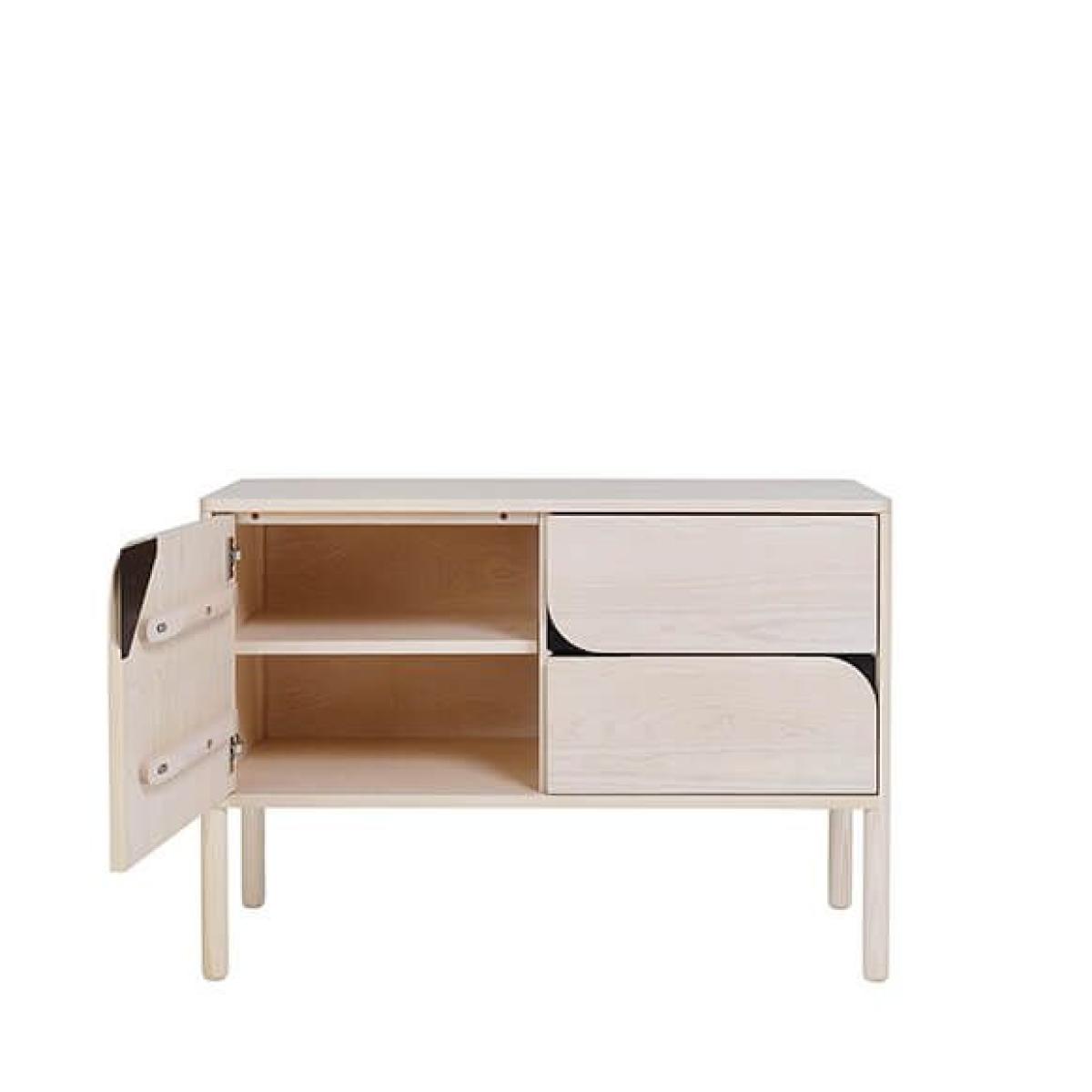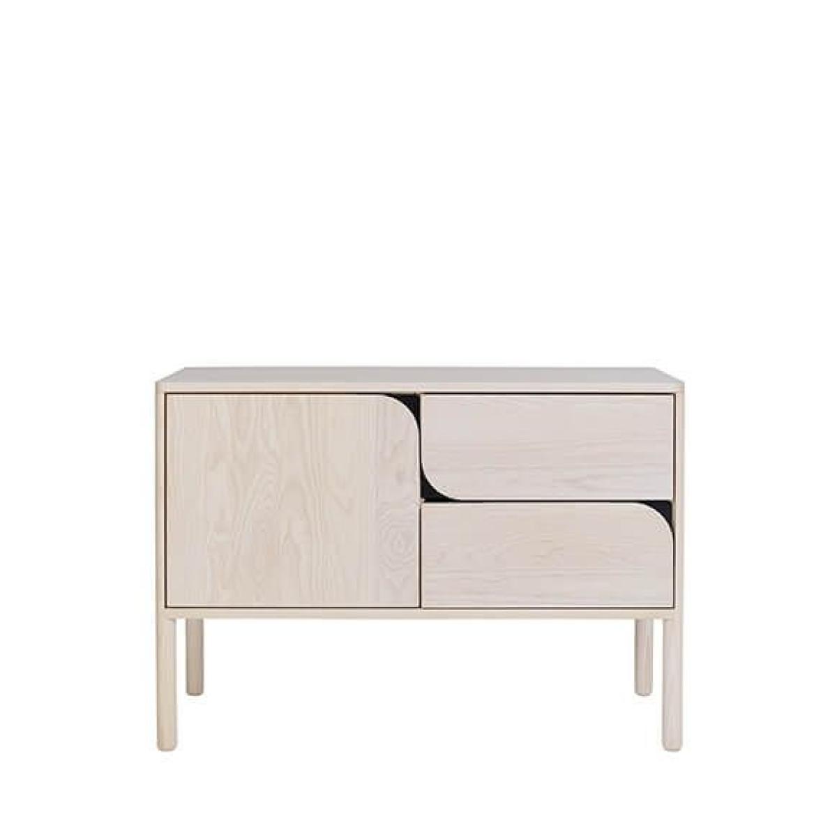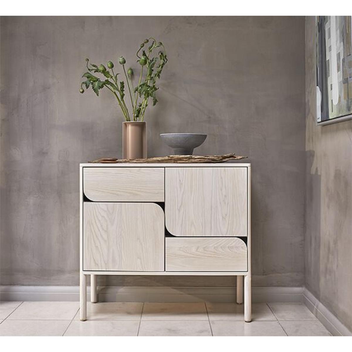 The small sideboard was the first cabinet designed in the collection. The design was inspired by a single flowing line in a sketch of the cabinet which triggered the idea for the distinctive rounded corners that form the cabinet drawer and door handles, these have become the key identity of Verso. This contemporary design crafted in solid ash, offers deep practical storage, with a cupboard that has an adjustable shelf and two deep and robust drawers. The sideboard is available in our standard ash finishes which are highlighted by the door pulls in contrasting black steel on lighter finishes and brushed brass on dark finishes. W 100cm D 42cm H 70cm. Wood Solid Ash. Country of origin UK. Fully assembled. Wood finishes and colour samples are shown for guidance only as screen colours may vary. We would recommend ordering a sample in your chosen finish. However, wood is a natural material and varies in colour, grain and structure
