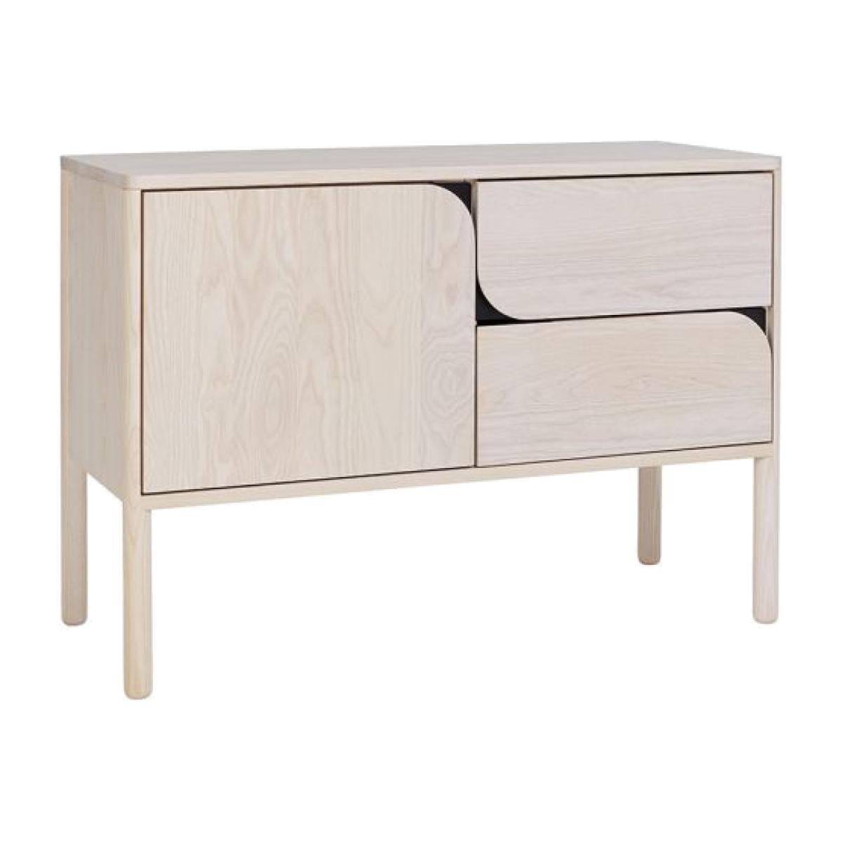 The small sideboard was the first cabinet designed in the collection. The design was inspired by a single flowing line in a sketch of the cabinet which triggered the idea for the distinctive rounded corners that form the cabinet drawer and door handles, these have become the key identity of Verso. This contemporary design crafted in solid ash, offers deep practical storage, with a cupboard that has an adjustable shelf and two deep and robust drawers. The sideboard is available in our standard ash finishes which are highlighted by the door pulls in contrasting black steel on lighter finishes and brushed brass on dark finishes. Solid Ash. Dimensions: W100cm x D42cm x H70cm. No Assembly Required