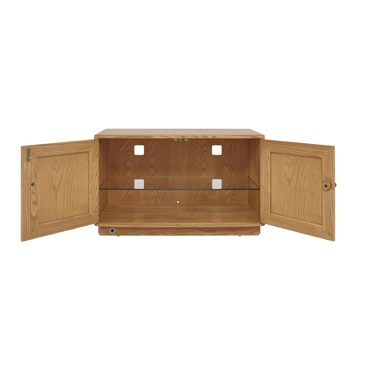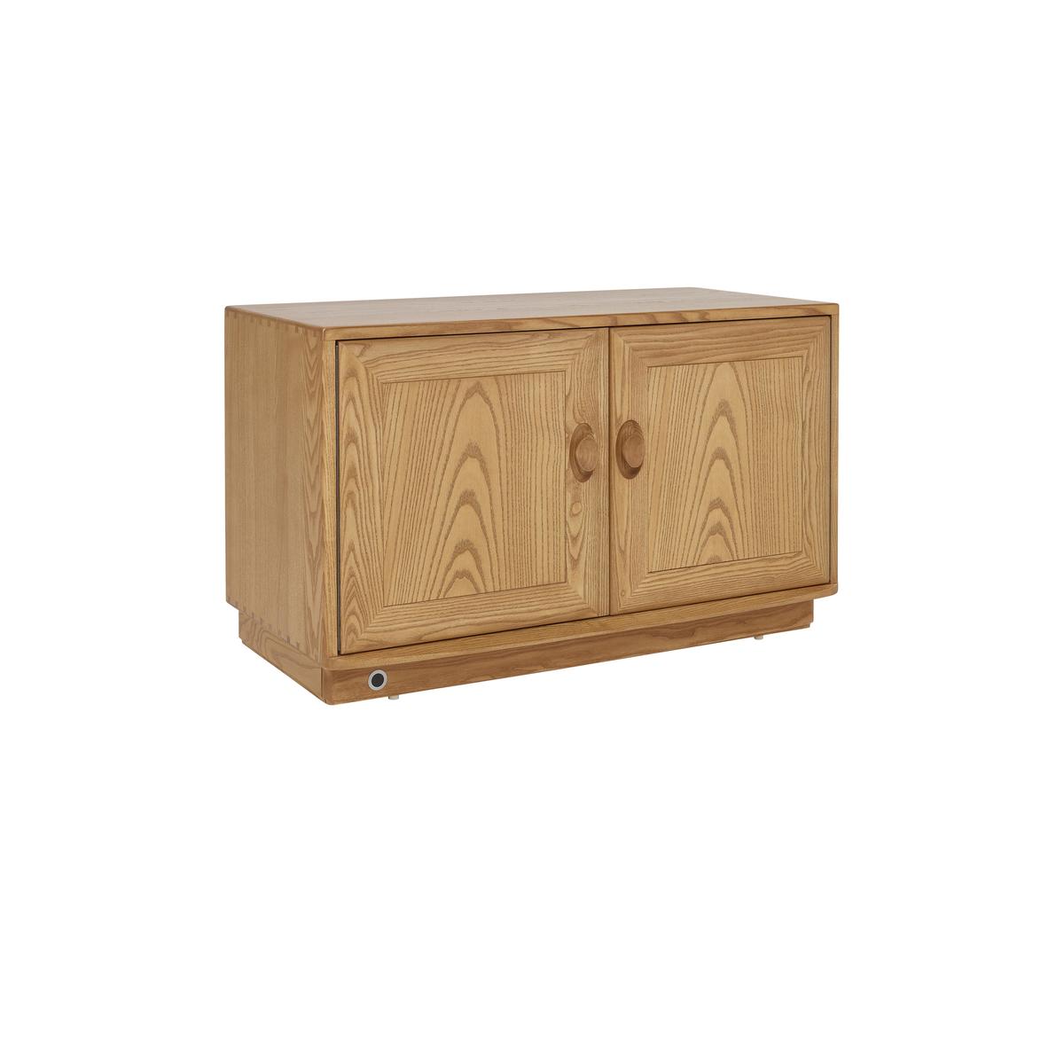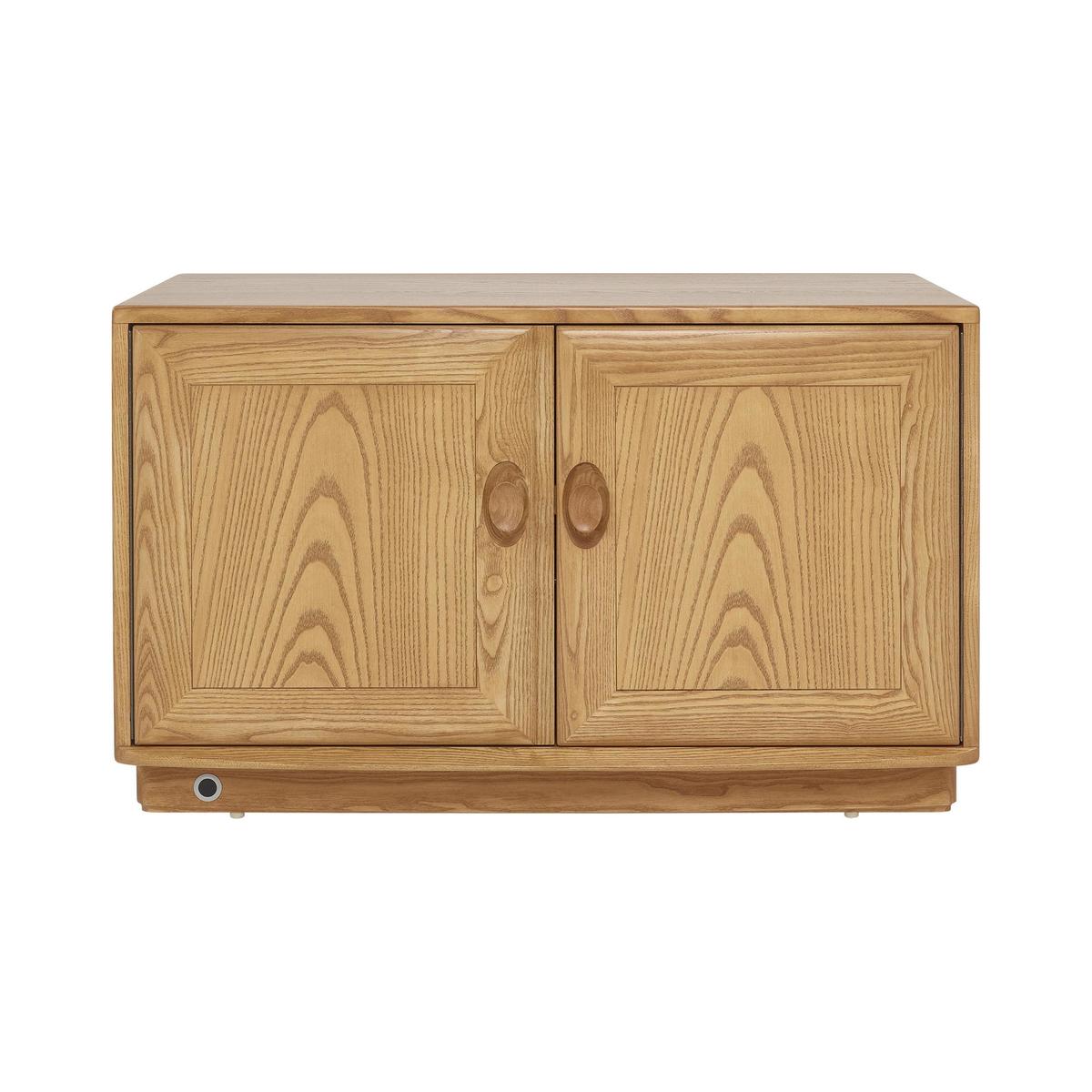 This Windsor collection of dining and occasional furniture has all the craftsmanship, design excellence and functionality you expect from ercol. The collection includes complementary styles of dining table and chair, including the iconic Windsor chair. The cabinets feature distinctive, attractively retro inset handles. Crafted from solid ash, with a choice of lacquer finishes. The ercol Windsor IR TV cabinet is classic ercol in style and craftsmanship. And with its high-tech functionality it will fit seamlessly into all kinds of homes. The IR part of the name refers to the fantastic built-in feature that allows your remote controls to work perfectly even through the wooden doors, so you can enjoy high-tech convenience and still maintain the stylish ercol look that you love. And this piece is definitely worth putting on show. Crafted from solid ash and finished with a soft-sheen lacquer, this compact media cabinet comprises a cupboard with two panelled doors finished with statement oval-shaped door handles set into oval recesses – a classic ercol finishing touch. The spacious compartment has an adjustable glass shelf, and there are four cut outs at the back to help keep cables and leads under control. The ercol Windsor IR TV cabinet is one of several media cabinets in the ercol Windsor collection of living and dining furniture. Shop the collection at Furniture Village. Did you know?. Natural wood has unique markings, with some colour variation. The colour and tone of wood improves with age.