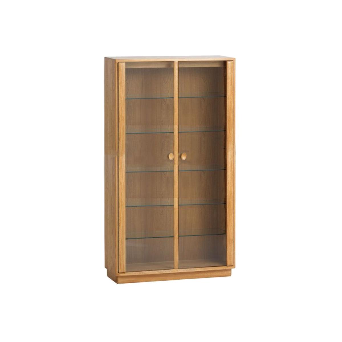 Through combining traditional craft techniques with modern machining the Ercol Windsor Medium Display Cabinet truly is a design classic. Through the use of traditional techniques and modern machinery Lucian Ercolani designed and made the Windsor Medium Display Cabinet with his signature dovetail joints and iconic oval handles.   Tremendous craftsmanship is apparent throughout this simple yet beautifully elegant furniture collection. Using solid traditional timbers with a clear lacquer finish Lucian Ercolani has crafted a truly beautiful display cabinet. Ash Wood Shown Here In Light Wood Finish Dimensions: 91 x 33 x 152cm