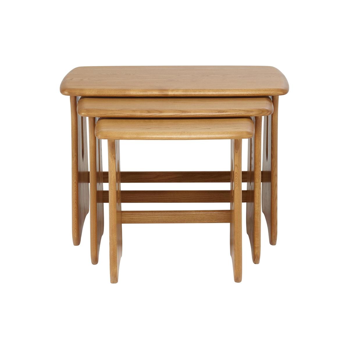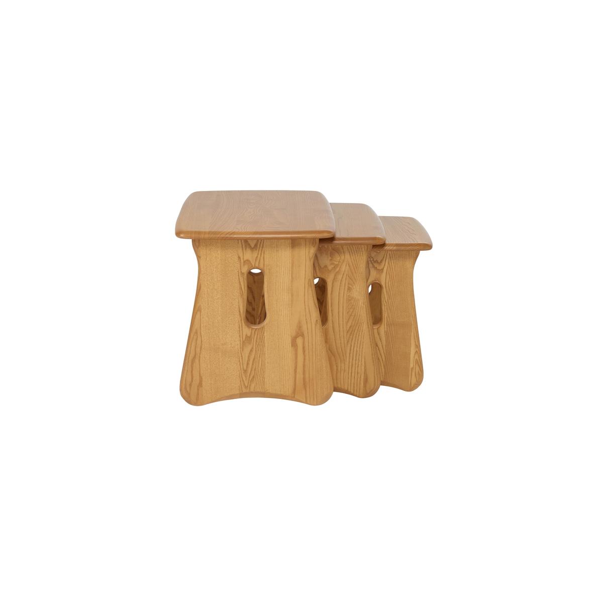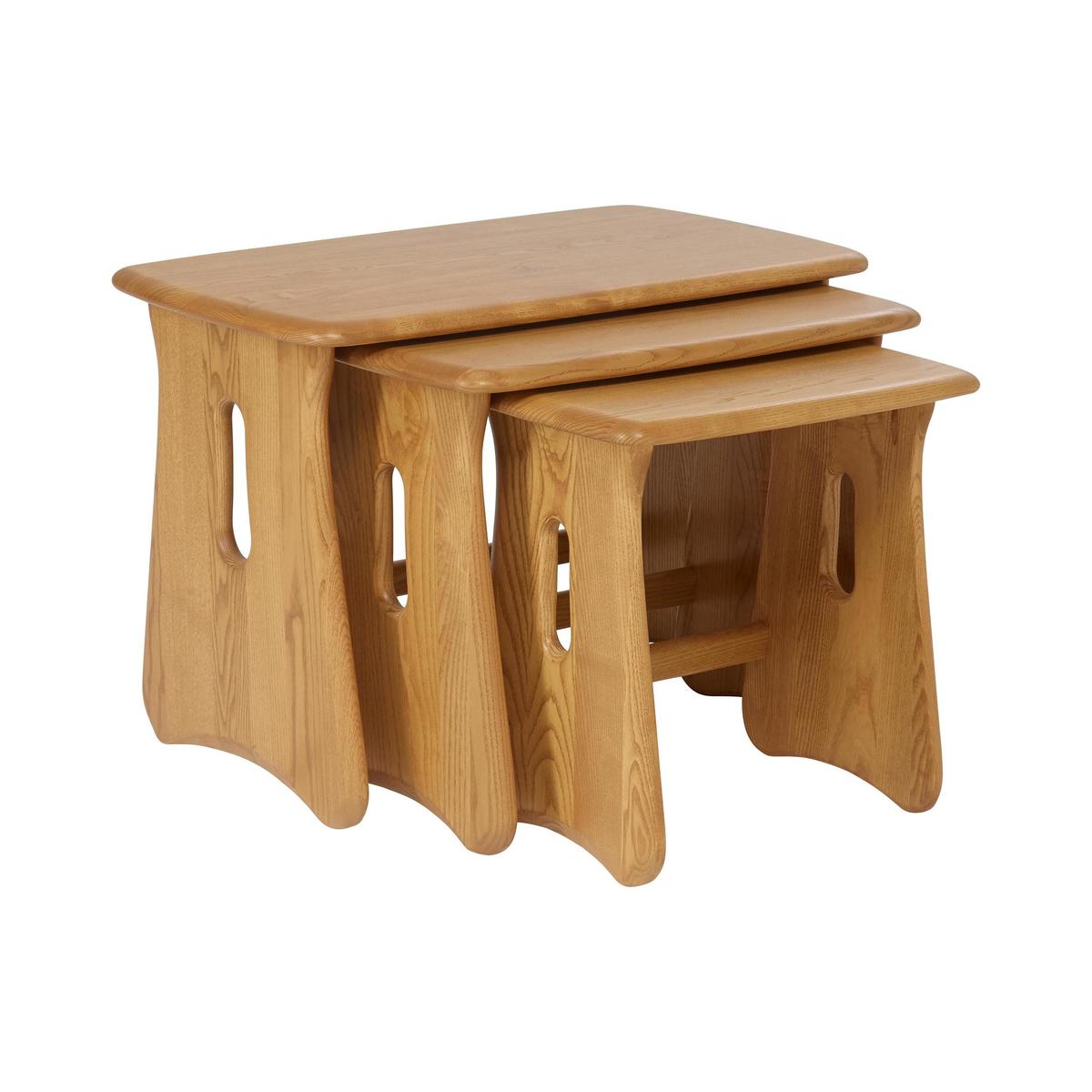 Featuring the classic Windsor leg distinctively curved and embellished with a cut- out detail the ercol Windsor nest of tables is a superbly well designed and crafted compact set of occasional tables. This set of three tables, which conveniently stack on top of each other, have rectangular rounded- end tops and are made from solid ash with a smooth soft- sheen lacquer finish. Offering maximum versatility and a useful addition to any compact living space, these three tables can be used as lamp tables, to support a tray of beverages or a handful of framed photos, or even as supper tables. Simply stack them neatly away when not in use. The ercol Windsor nest of tables is part of the ercol Windsor collection of beautifully crafted solid wood dining and living room furniture. The ercol Windsor coffee table shares the same smooth rounded edges and functional design. Did you know? Natural wood has unique markings, with some colour variation. The colour and tone of wood improves with age.