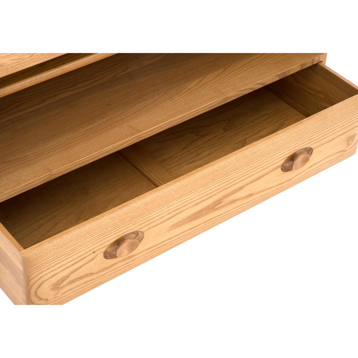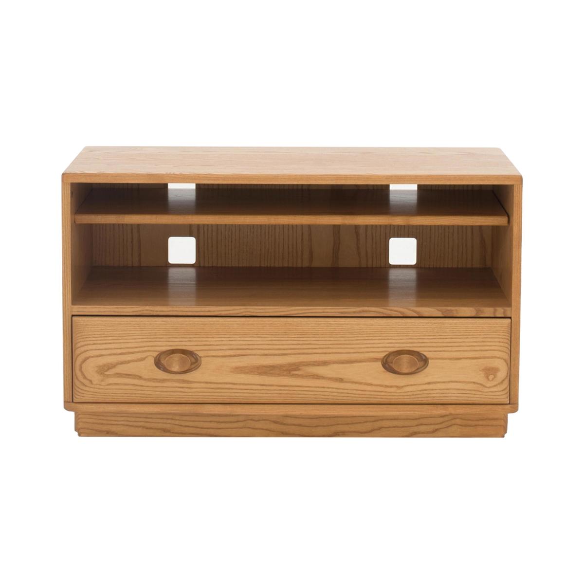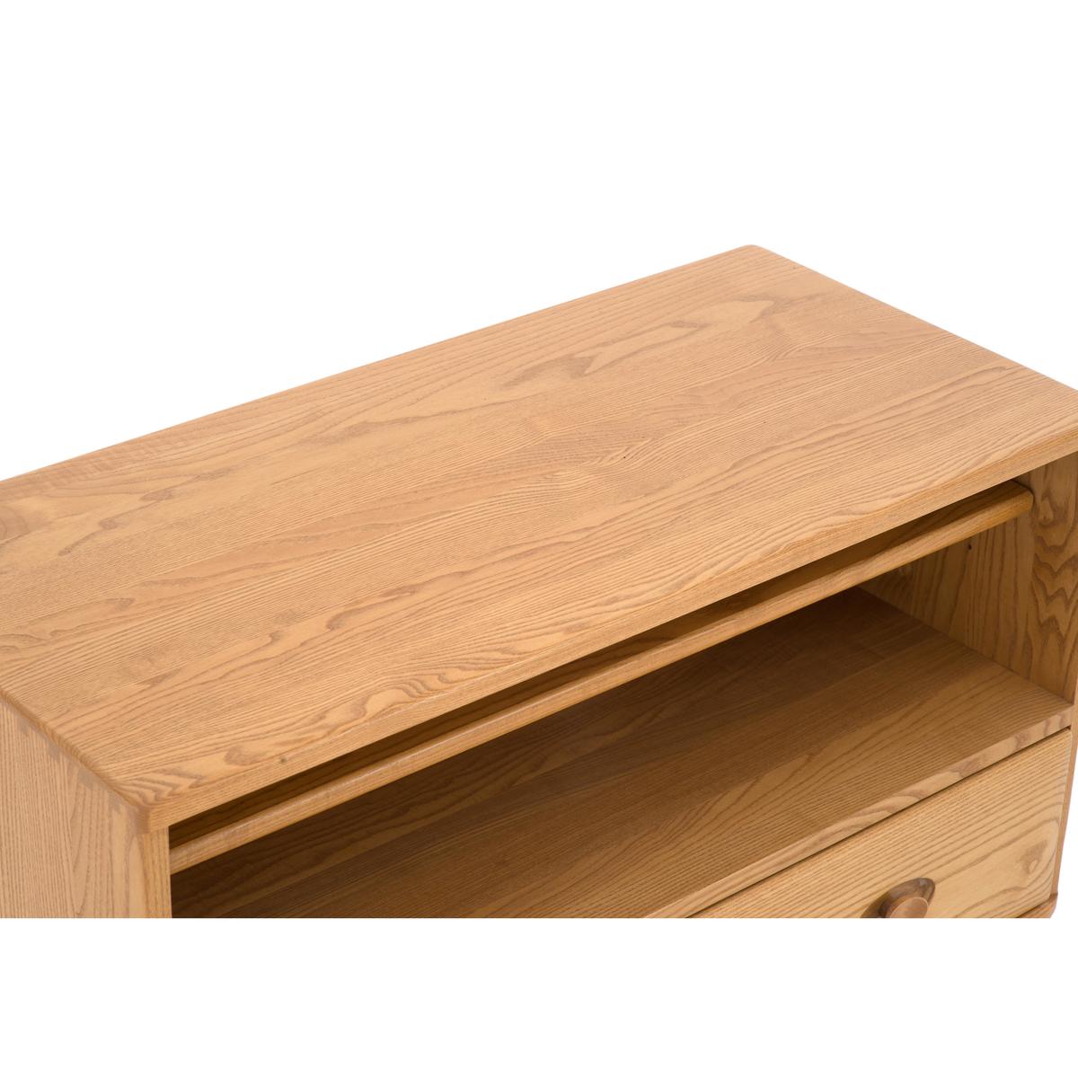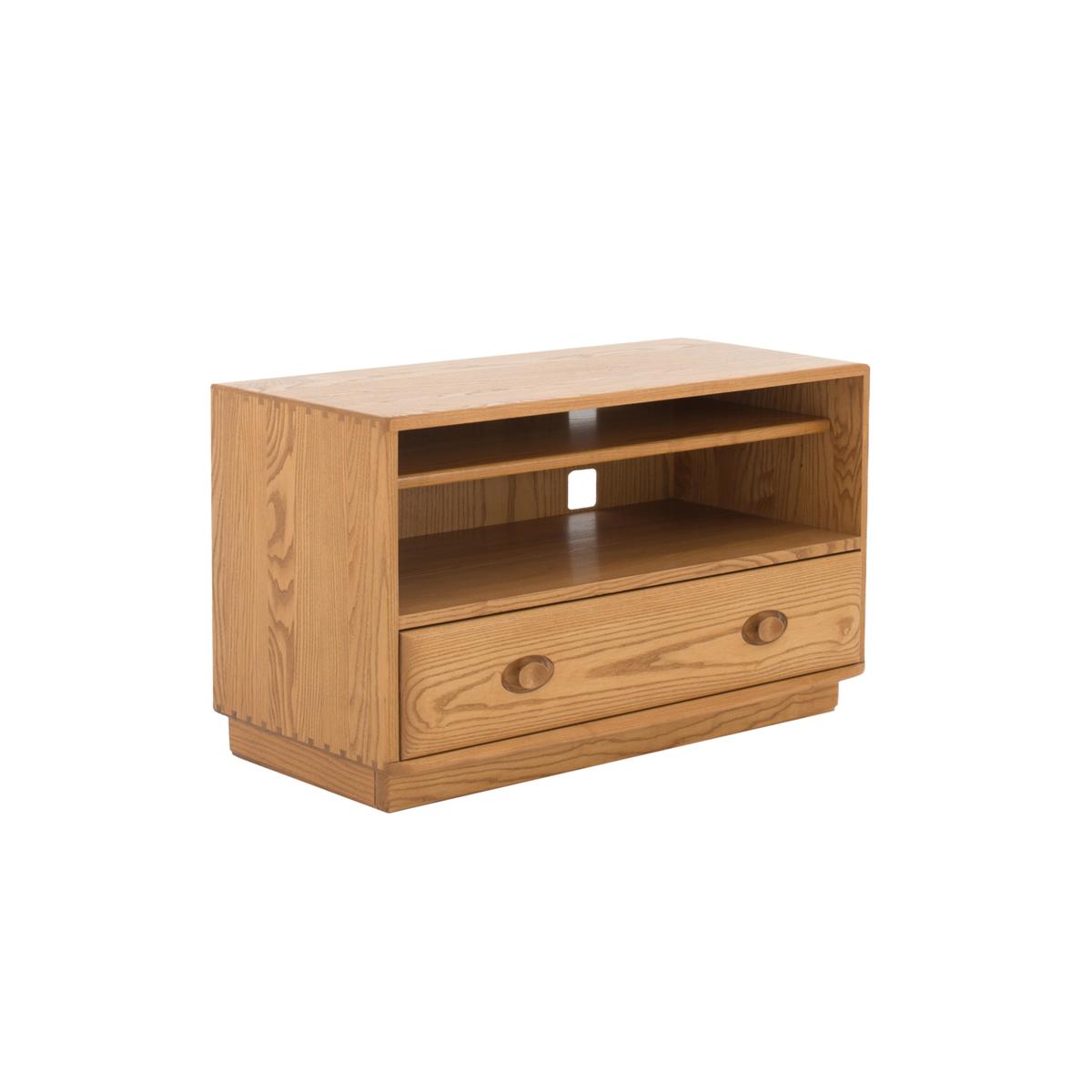 This Windsor collection of dining and occasional furniture has all the craftsmanship, design excellence and functionality you expect from ercol. The collection includes complementary styles of dining table and chair, including the iconic Windsor chair. The cabinets feature distinctive, attractively retro inset handles. Crafted from solid ash, with a choice of lacquer finishes. Simple and stylish, the ercol Windsor TV cabinet is a perfect example of what ercol does best – beautiful furniture designed for both function and beauty. This compact TV cabinet is crafted from solid ash and is finished with a soft-sheen lacquer that enhances the true beauty of the wood. As well as elegant lines and wonderfully smooth surfaces, it offers spacious storage. The upper open compartment has a shelf for all your media components. Below is a spacious drawer, a great space for remote controls and games consoles. The details are classic ercol – the drawer has oval-shaped wooden handles set into shallow oval recesses, a feature that’s both ergonomic and stylish. Part of the extensive ercol Windsor collection, the ercol Windsor TV cabinet is the perfect piece for either a contemporary or a traditional living space. Complete the look with other storage pieces from the range, like the ercol Windsor medium bookcase and the ercol Windsor two door high sideboard. Did you know?. Natural wood has unique markings, with some colour variation. The colour and tone of wood improves with age.