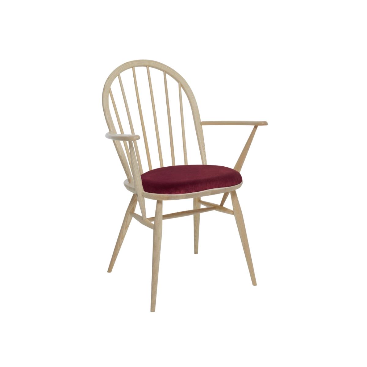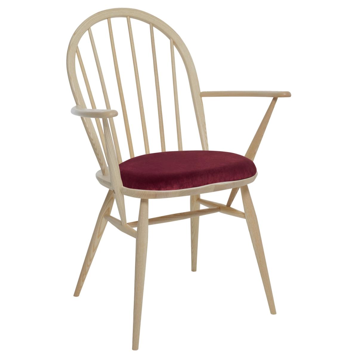 This Windsor chair is proudly made in the UK using solid ash. The gracefully turned legs and spindle details are signature features of the traditional Windsor chair and help to create a wonderfully classic look in any room. While armrests provide added support so that you can enjoy your dinner in. The chair bow is steam bent from a single straight ash rail and then sanded and shaped to give its subtle and elegant profile. Traditional wedge joints, where the legs come right through the seat and a wedge is inserted into a cut, before the leg stump is hand sanded flush with the seat, both provide a lovely design detail and a very strong joint. Finished in a choice of wood finishes that protect the timber and complement decor. For added comfort is the Windsor dining armchair is available with an upholstered seat, fabrics can be chosen from the ercol collection. Shown here with C748 fabric and a Clear Matt (CM) wood finish. FEATURES: Fully assembled. Solid Ash construction Available in several wood finishes Seat pad upholstered in a choice of several fabrics DIMENSIONS: Width: 64cm Depth: 55cm Height: 92cm Unpacked Weight: 6kg Seat Height: 49cm Seat Depth: 40cm Seat Width Arm To Arm: 41cm Arm Height: 69cm All screens vary in colour reproduction and whilst every effort has been made to display the colour as accurately as possible it is for guidance only.