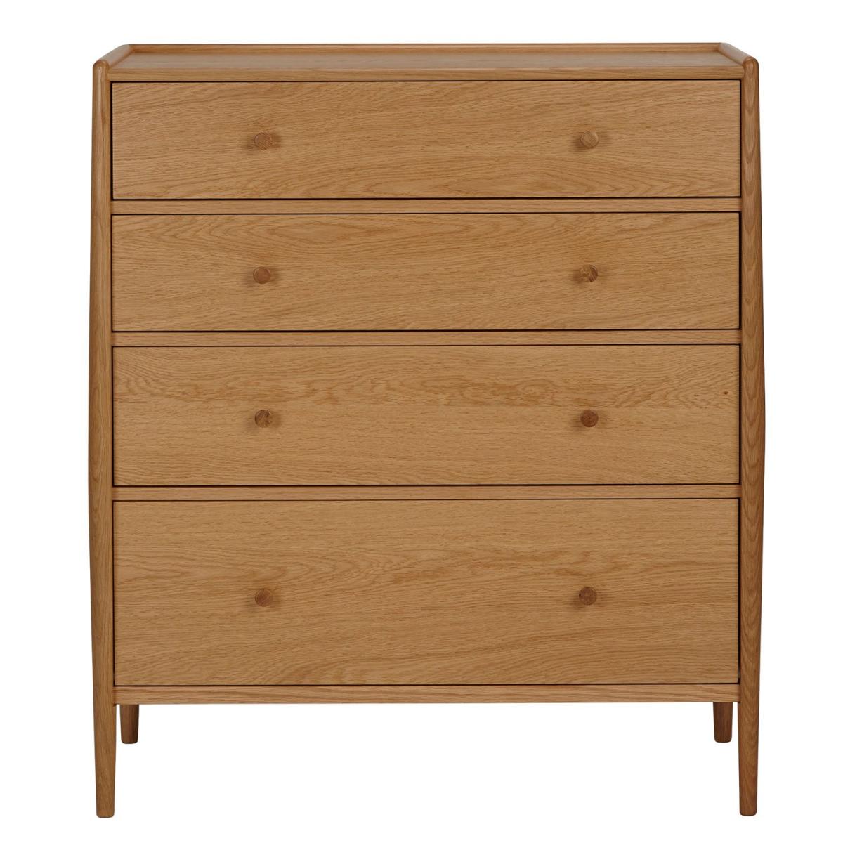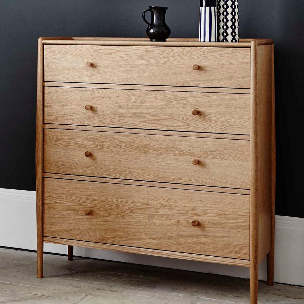 I love this piece for its clean, minimalist aesthetic and natural oak finish, which makes it versatile for a range of interiors-from Scandi-inspired schemes to more contemporary or traditional spaces. Its compact size and practical four drawers make it an excellent choice for bedroom storage without overwhelming a room. To style it effectively, consider pairing it with simple accessories like a ceramic vase or a stack of books on top, keeping the look uncluttered. It works well in bedrooms, hallways, or even living rooms as a multi-use storage solution. For added warmth or personality, you might introduce soft textiles or metallic accents nearby, but the piece itself remains elegantly understated, making it a timeless addition.