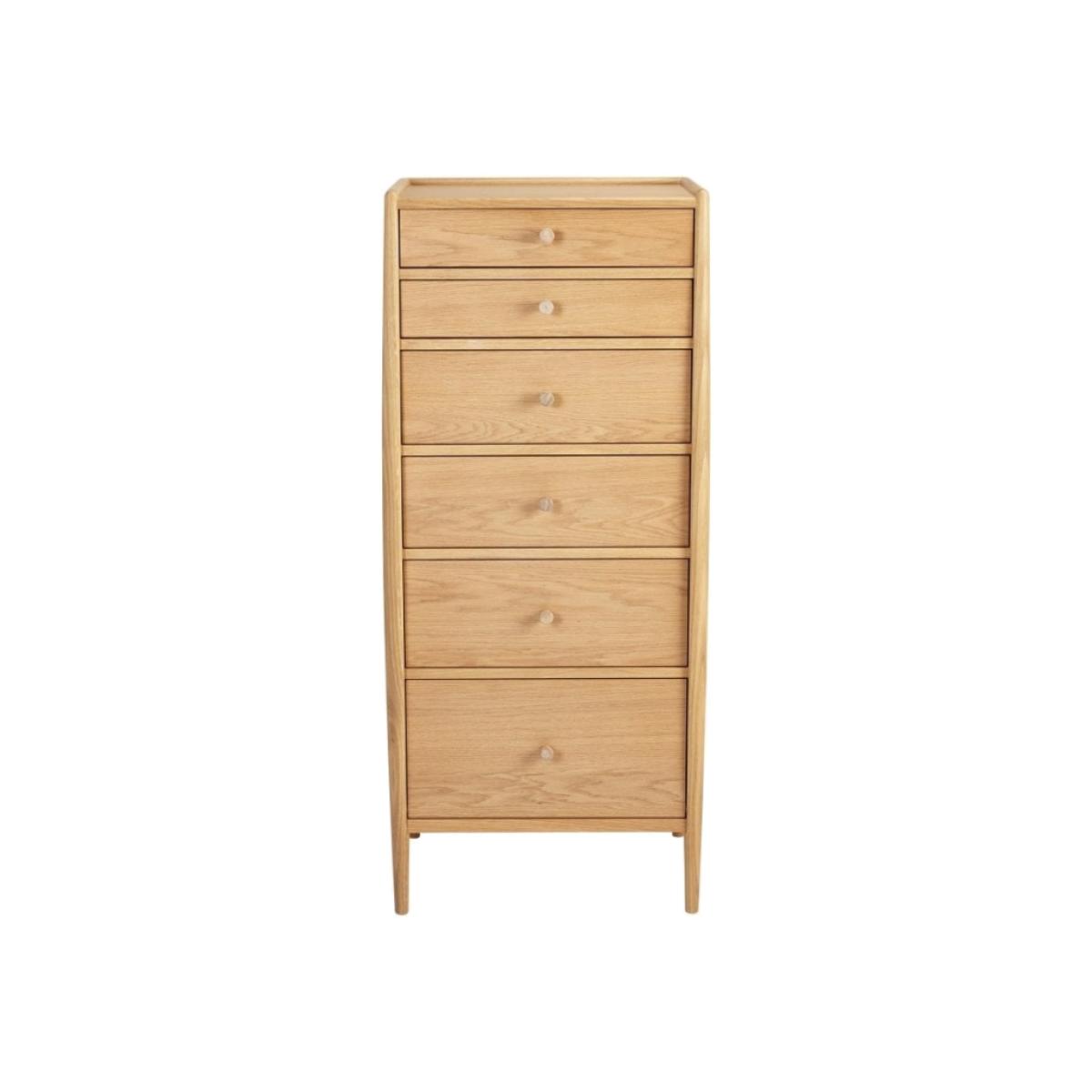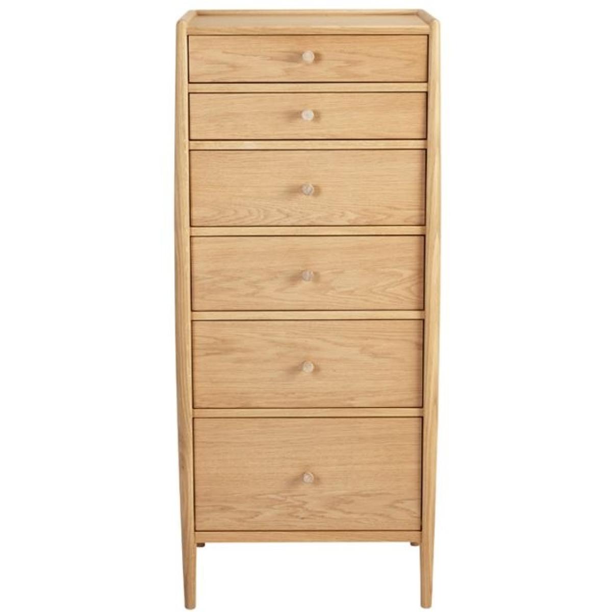 The Ercol Winslow 6 drawer tall chest has a large drawer at the base of the unit with medium in the middle and smaller drawers at the top. Inspired by a dressing table designed in 1956 by the ercol founder, Lucian Ercolani, Winslow harnesses ercol's design heritage to create a range that has tapering legs, oak spindles, and plenty of storage. Beautifully crafted from solid oak and oak veneers, it is finished in a contemporary matt lacquer finish and features traditional dovetail joints on drawers and finger joints for extra strength. Winslow is elegantly timeless. Practical and stylish, this contemporary tall chest of 6 drawers is ideal for keeping your personal possessions organised and within easy reach. FEATURES: Fully Assembled Turned wooden handles Solid Oak and Veneers Dovetail jointed drawers Finished in a Clear Matt lacquer DIMENSIONS: Width - 57cm Depth - 44cm Height - 129cm All screens vary in colour reproduction and whilst every effort has been made to display the colour as accurately as possible it is for guidance only.