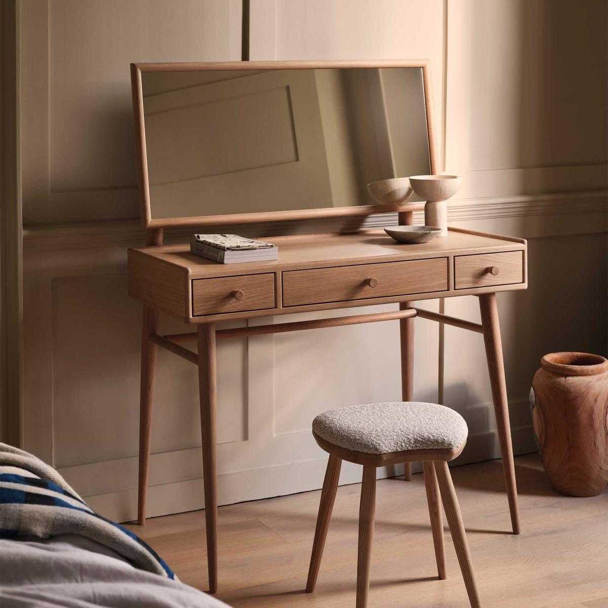 I love the Ercol Winslow dressing table for its clean, timeless design and neutral oak finish, which makes it versatile across various interior styles. It works particularly well in Scandi or mid-century modern bedrooms where understated elegance and function are key. Practical styling tips include keeping the surface clutter-free by using are organisers or small baskets, and adding a large mirror above to create a sense of space while making the most of natural light. Its slim drawers are perfect for storing everyday accessories like jewellery, makeup, or hair tools, keeping the area neat. Overall, it's a great piece that balances practicality with a refined aesthetic, making it a stylish yet functional addition to your bedroom.