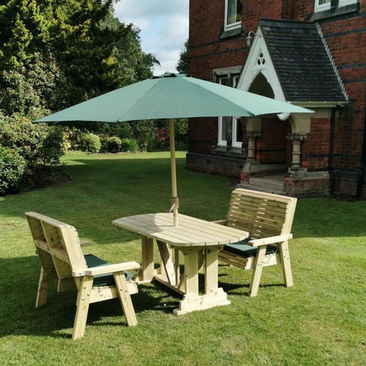 An attractive and high quality table accompanied by 2 of our 2 seater benches. Which are ergonomically designed with lumbar support. All furniture is built with approved, premium quality pressure treated timber which will prevent rot for up to 20 years.