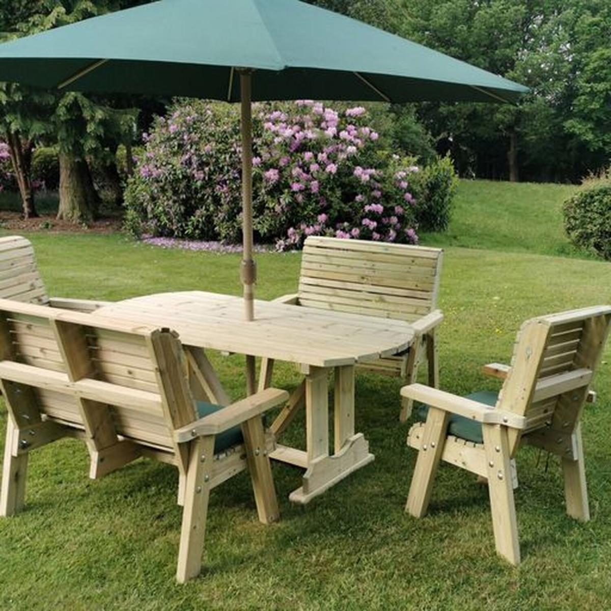 An attractive and high quality table accompanied by 2 garden chairs, and 2 of our 2 seater benches. Which are ergonomically designed with lumbar support. All furniture is built with approved, premium quality pressure treated timber which will prevent rot for up to 20 years.