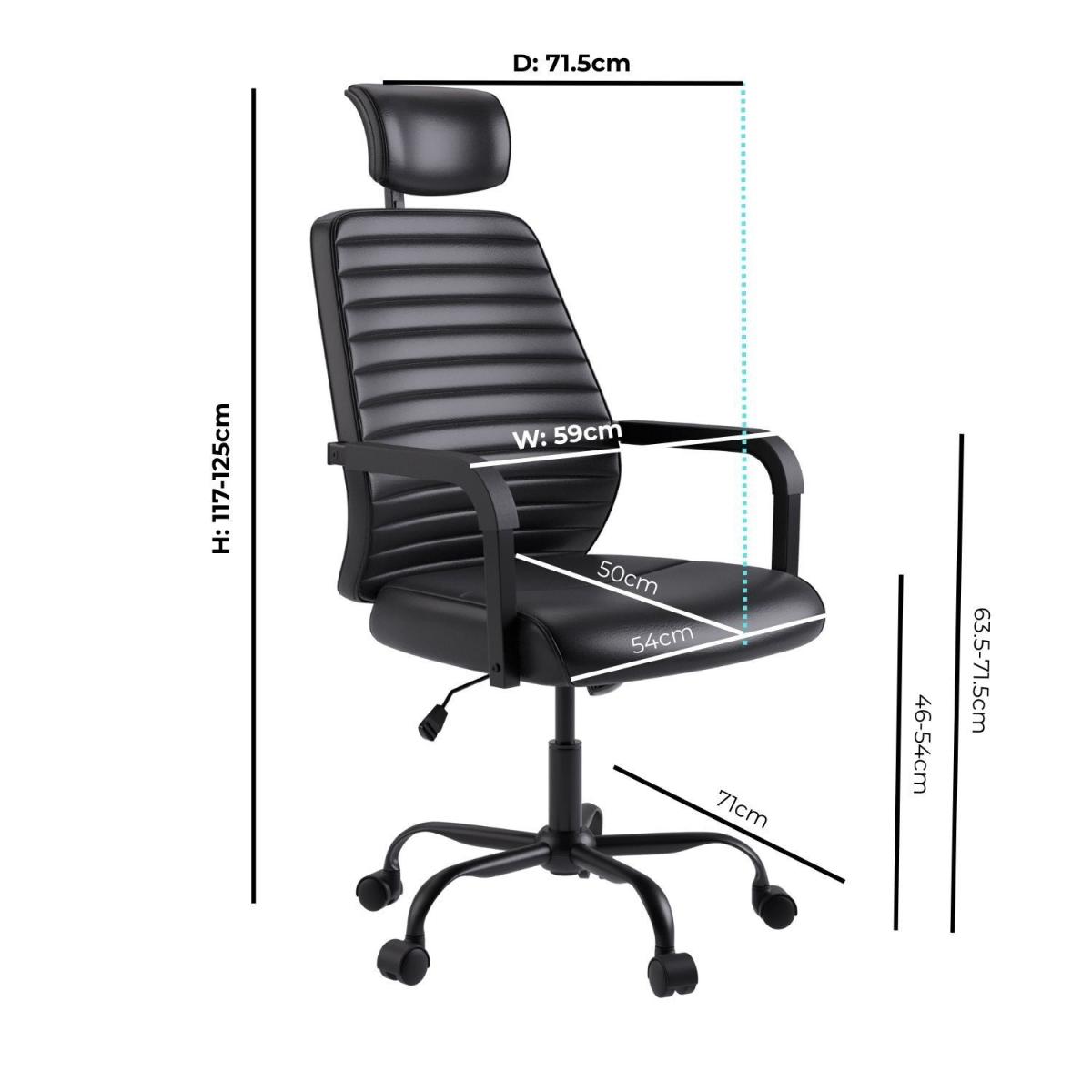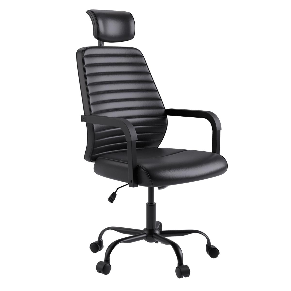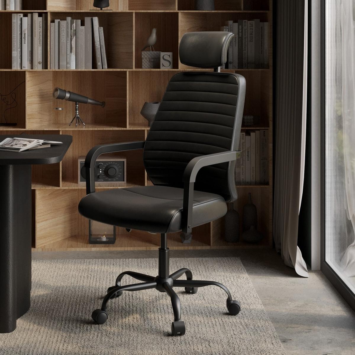 Upholstered in classic black faux leather with sleek ribbed detailing, the Emmanuel chair brings a refined, professional look to any office or home workspace. Emmanuel's contemporary design blends style with everyday functionality, making it a versatile choice for both professional and home settings. Featuring a tall backrest, supportive foam cushioning and padded armrests, the Emmanuel office chair promotes good posture and provides lasting comfort through long working hours. The integrated headrest offers added comfort for the neck, while the high backrest provides exceptional back support for improved posture. With a height-adjustable seat, smooth castor wheels and a 360° swivel function, it ensures easy mobility and adaptable comfort throughout the day. Elevate your workspace with the sleek style and professional comfort of the Emmanuel Swivel Office Chair, featuring a high backrest. Upholstered in soft and durable black faux leather with refined ribbed detailing, it adds a modern, professional touch to any room. The ergonomic design, high backrest, and integrated headrest deliver excellent support for posture and comfort, while padded armrests provide extra ease during long working hours. With adjustable height, castor wheels, and a 360° swivel, it offers freedom of movement and everyday flexibility, whether you’re working or relaxing.