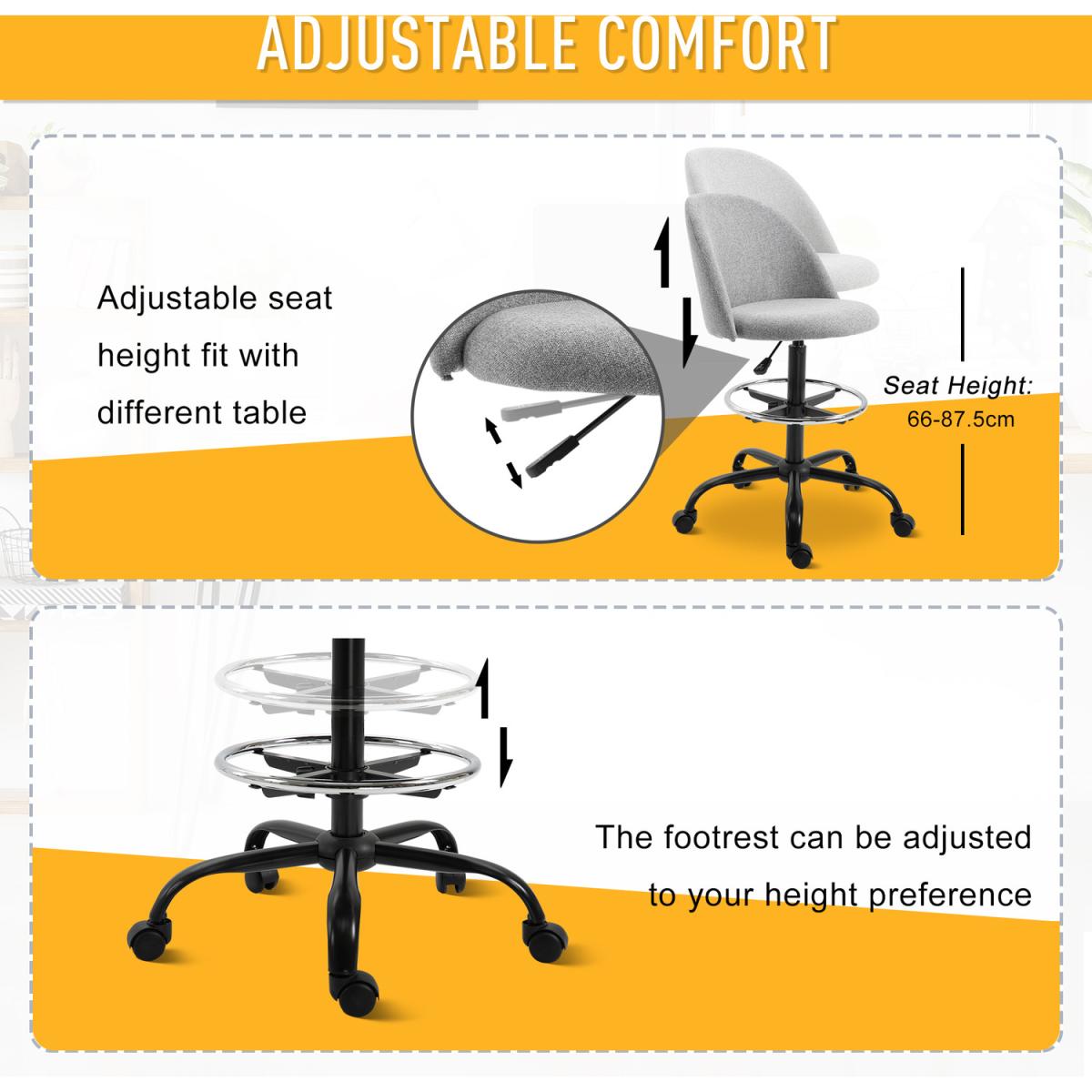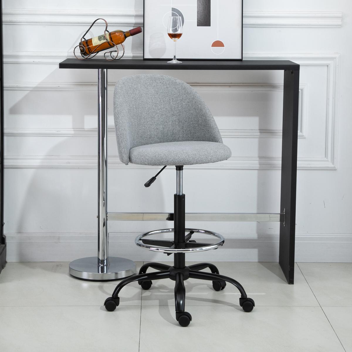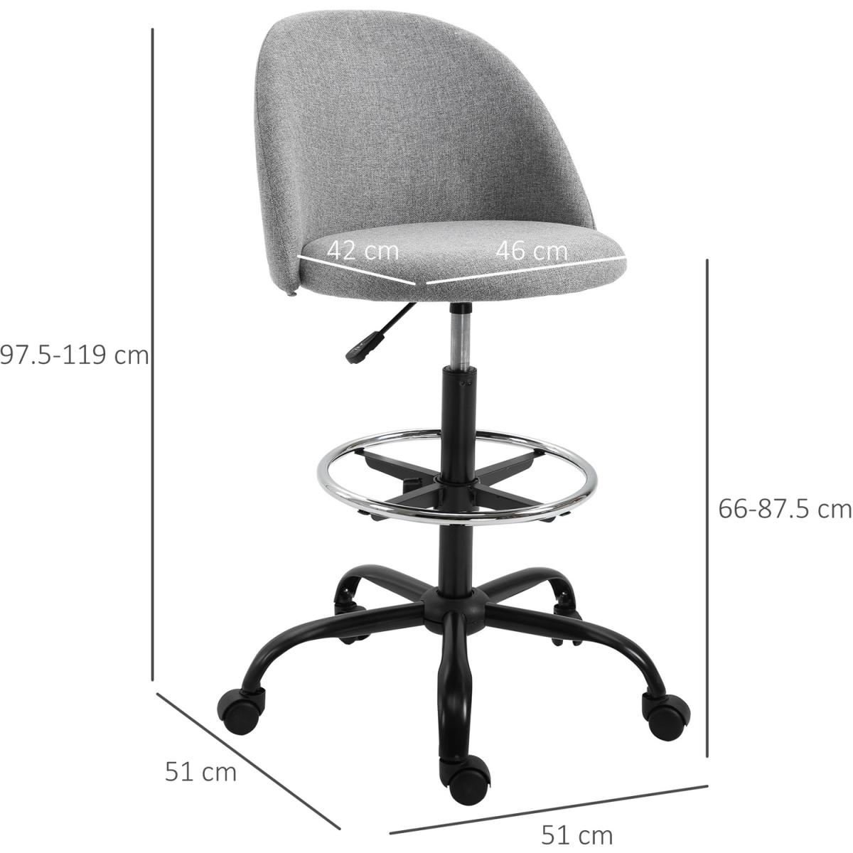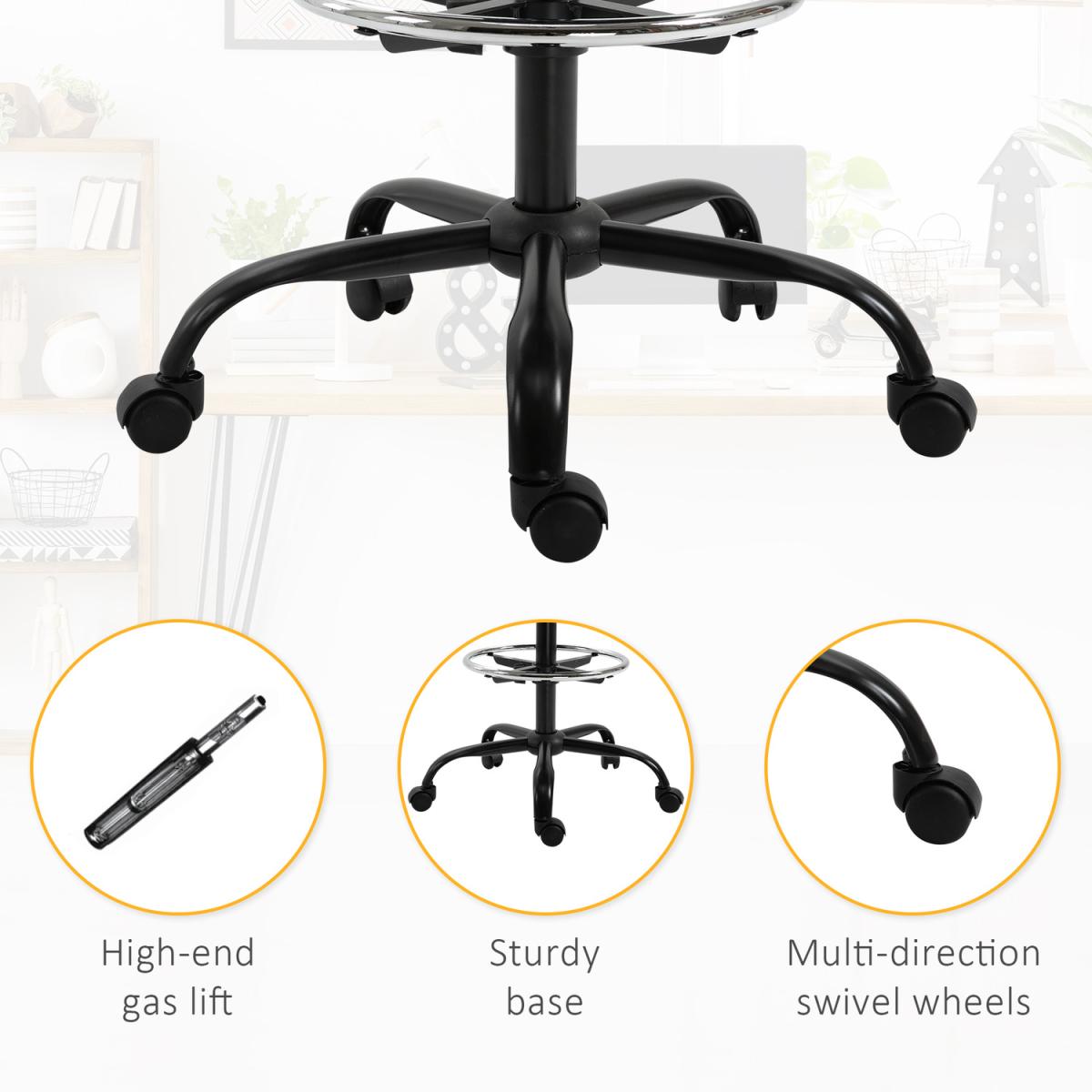 Reach even the highest of worktops with this draughtsman chair from HOMCOM. Sitting between 97.5-119cm in height, it is made with many ergonomic features: a large seat with a high and supportive back, all over padding, a footrest and an adjustable frame, allowing you to set to a height which is correct and comfortable for you. It's finished with a 360 degree swivel base and five castor wheels to allow you to move the room freely and easily. Ideal for homes and small businesses, leaving no surface to tall to work from again.
