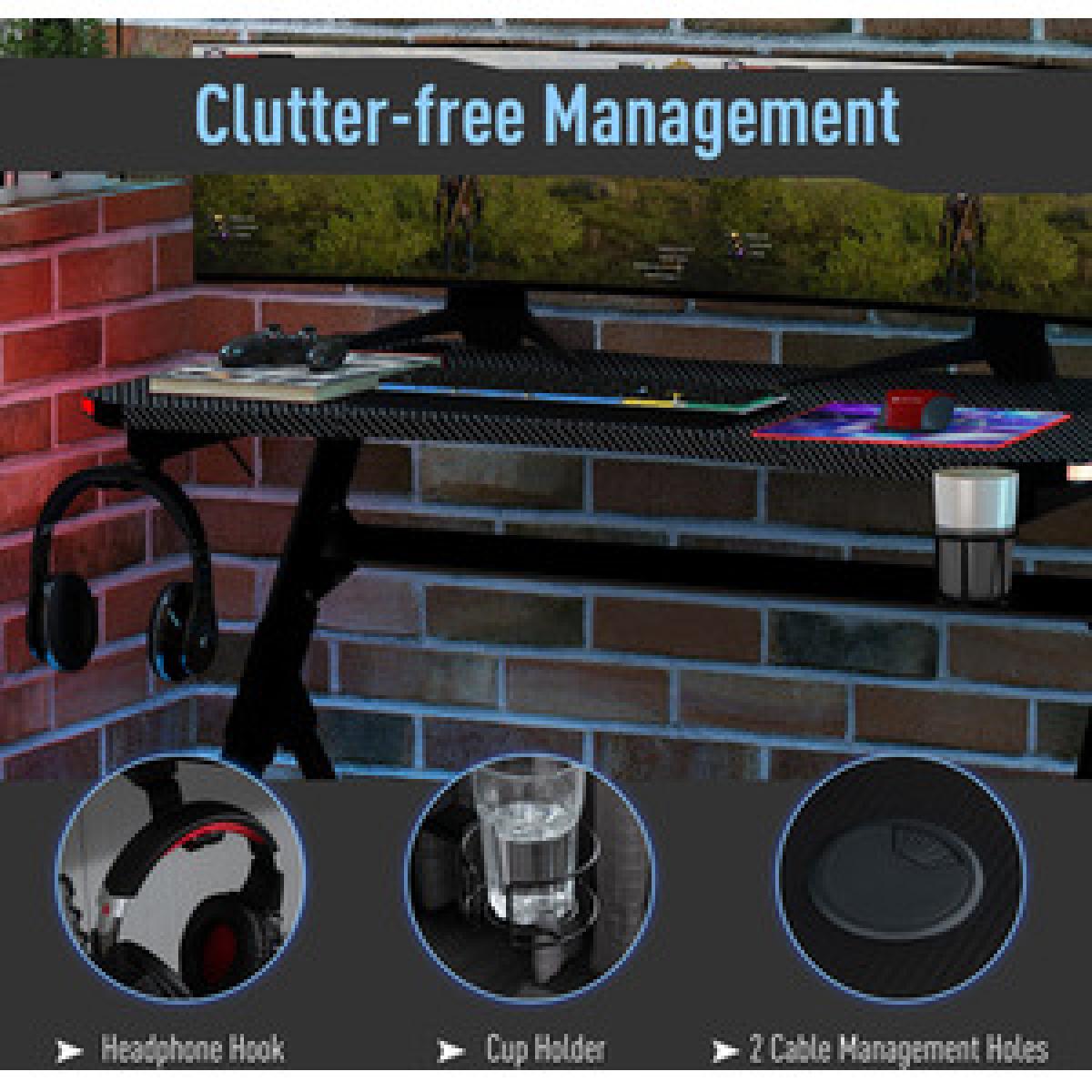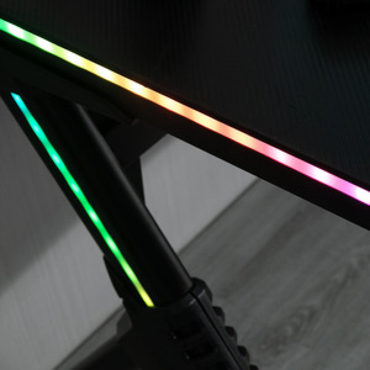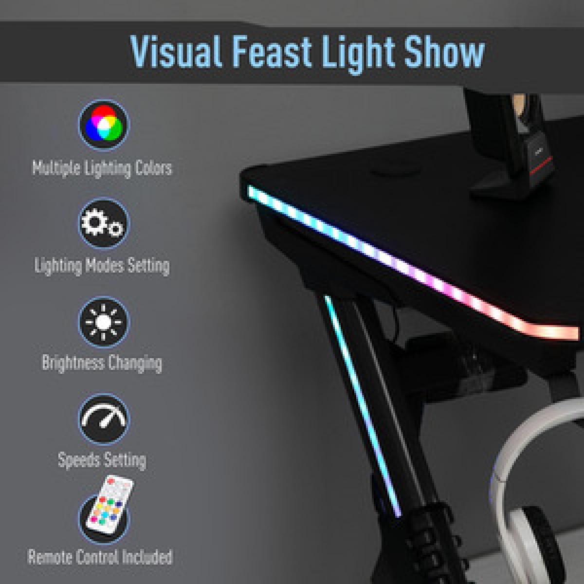 High-performance gaming needs a high-performance gaming desk. Come with spacious desktop, stable powder-coated steel frame, built-in RGB LED lighting, and versatile storage solution, this gaming desk provides everything you need for high-performance gaming. Ergonomically contoured edges and attached foot pads enhance the comfort of long hours of play in your gaming office.