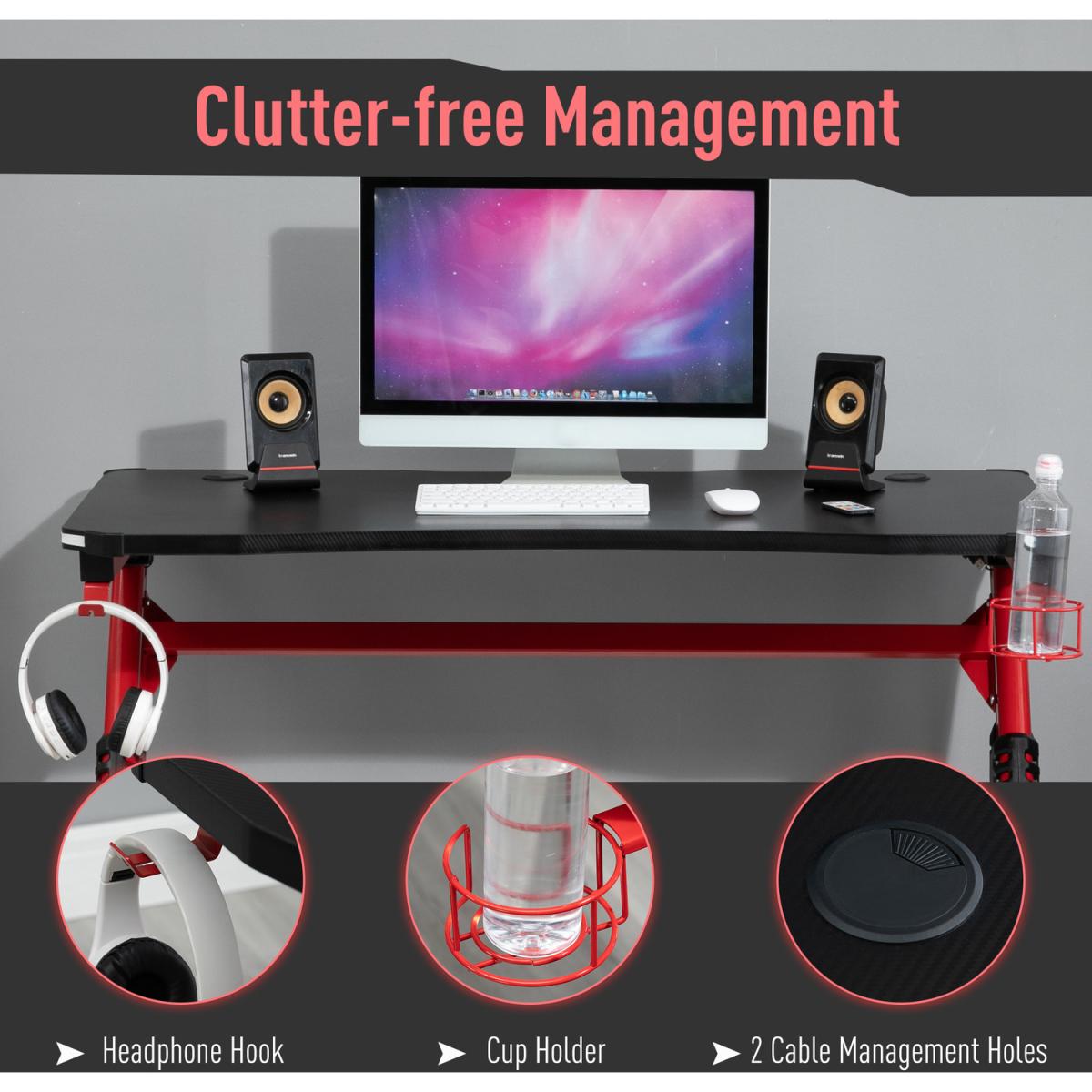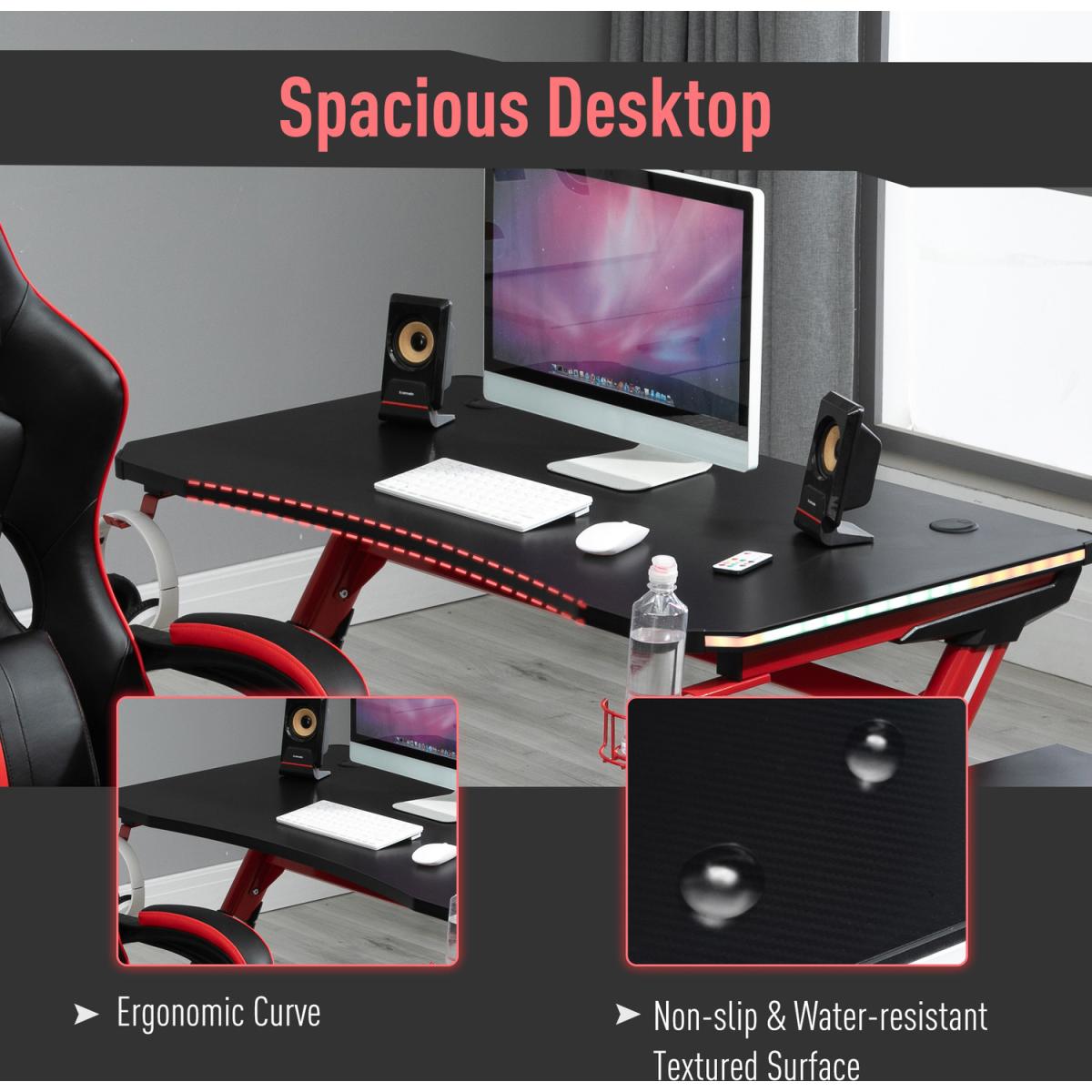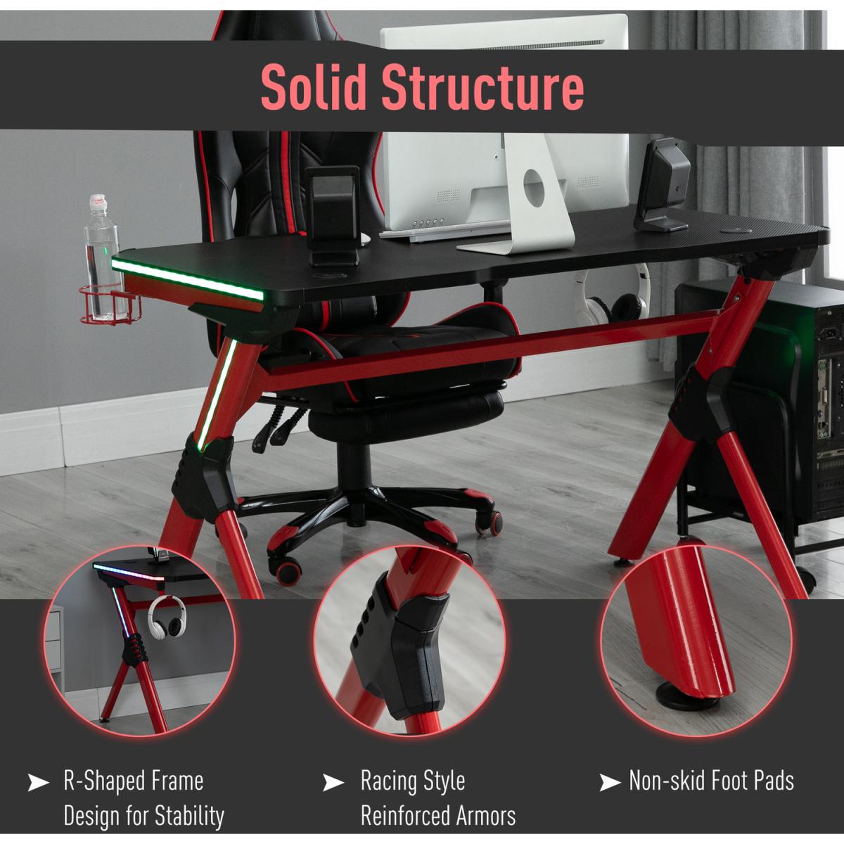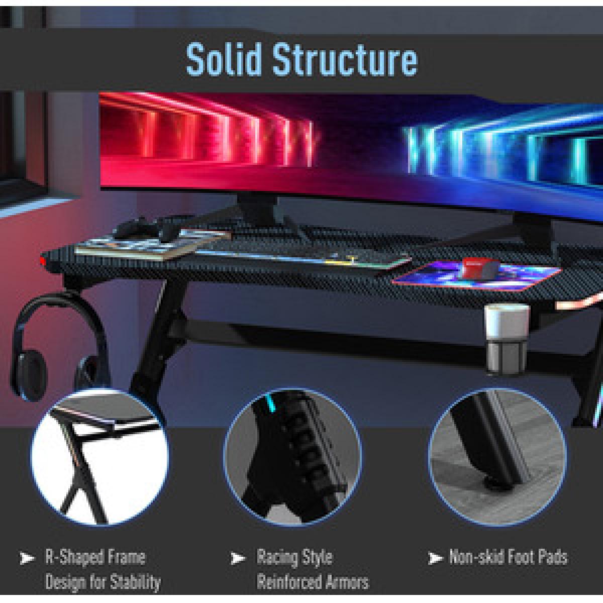 High-performance gaming needs a high-performance gaming desk. Come with spacious desktop, stable powder-coated steel frame, built-in RGB LED lighting, and versatile storage solution, this gaming desk provides everything you need for high-performance gaming. Ergonomically contoured edges and attached foot pads enhance the comfort of long hours of play in your gaming office.