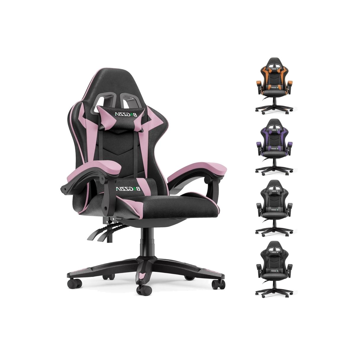Upgrade your setup with this stylish ergonomic gaming chair in black and pink. Designed for comfort during long sessions, it features a high back, adjustable height and recline, plus removable lumbar and headrest cushions. Crafted from durable faux leather and metal, it supports your spine while adding flair to your space. Perfect for gaming, working or relaxing in style.