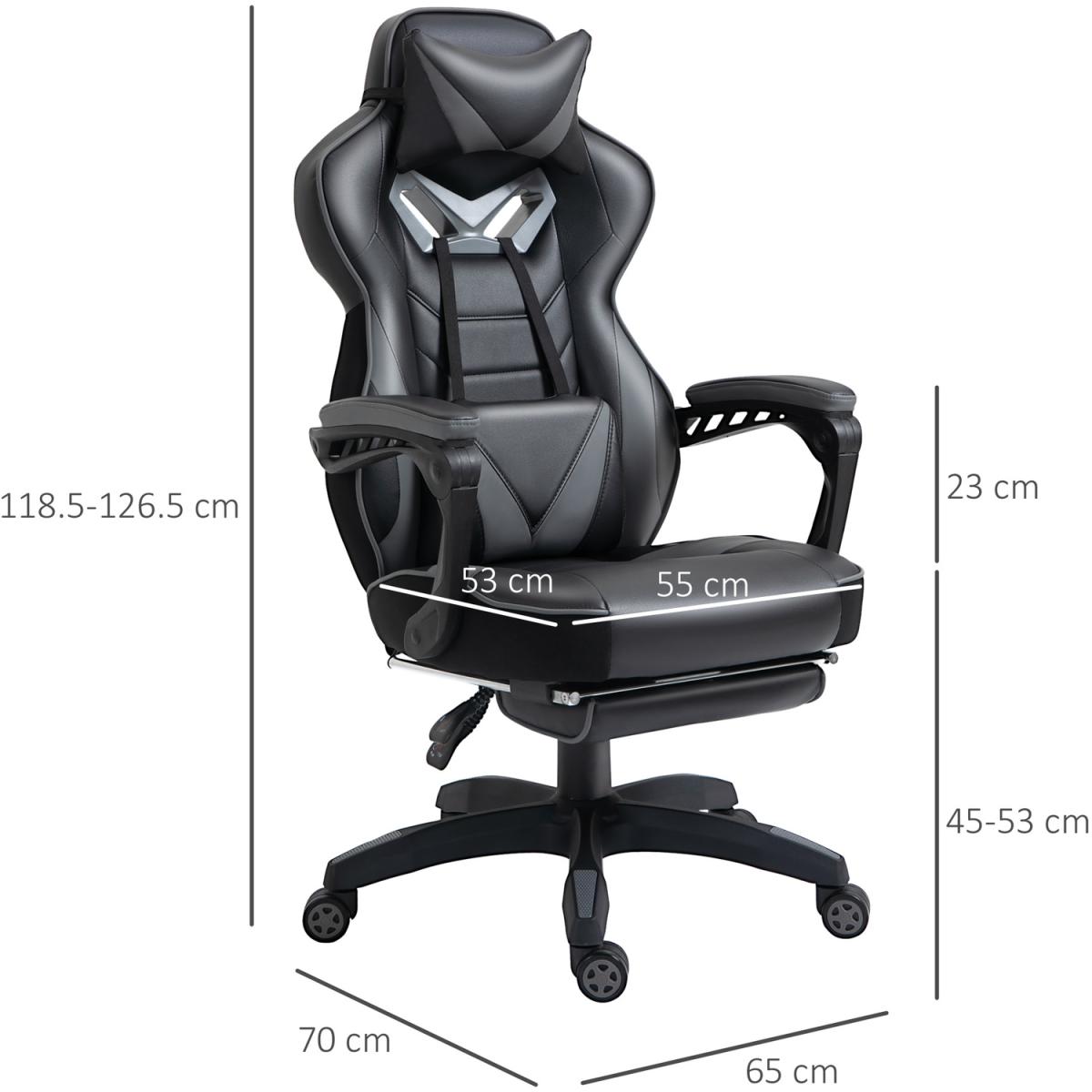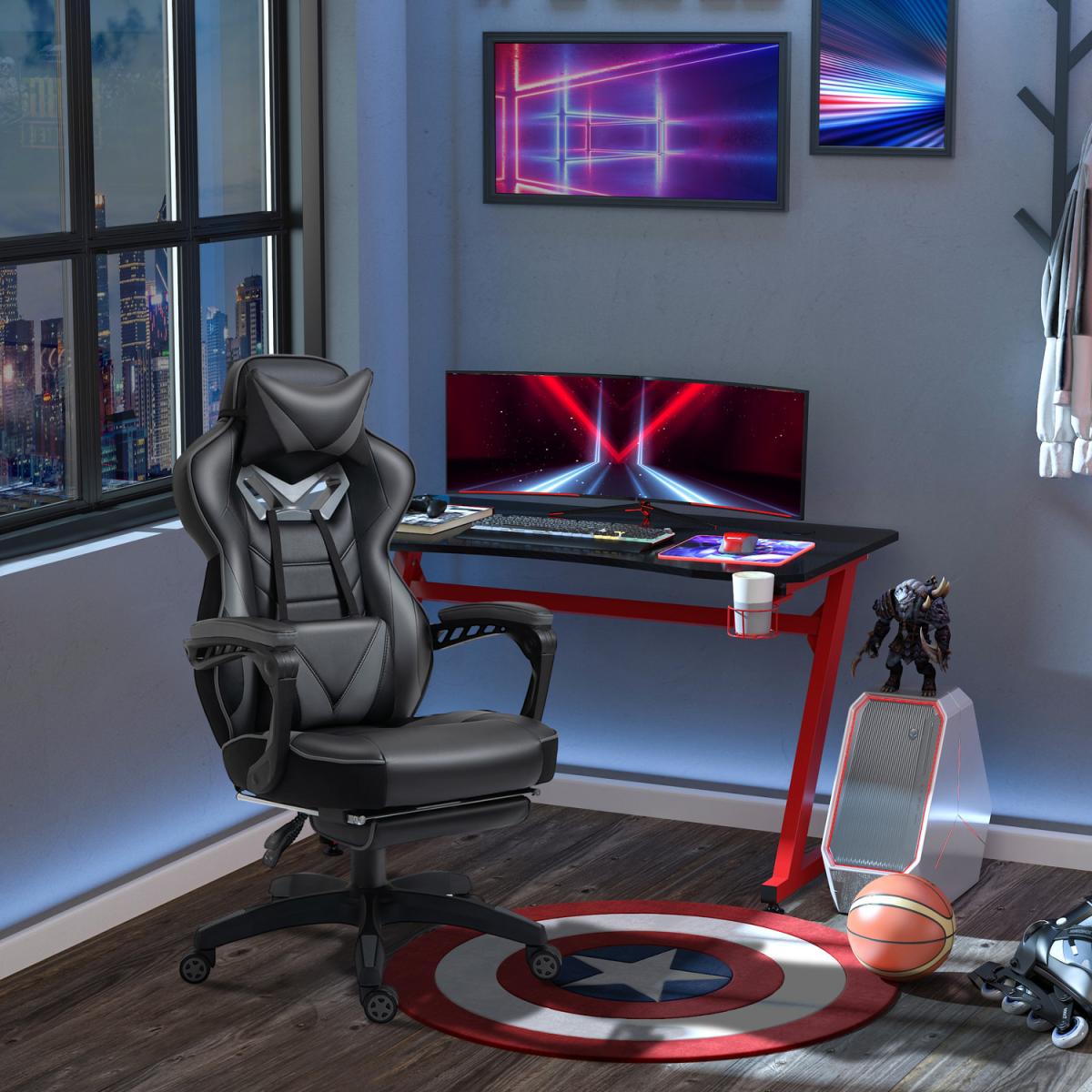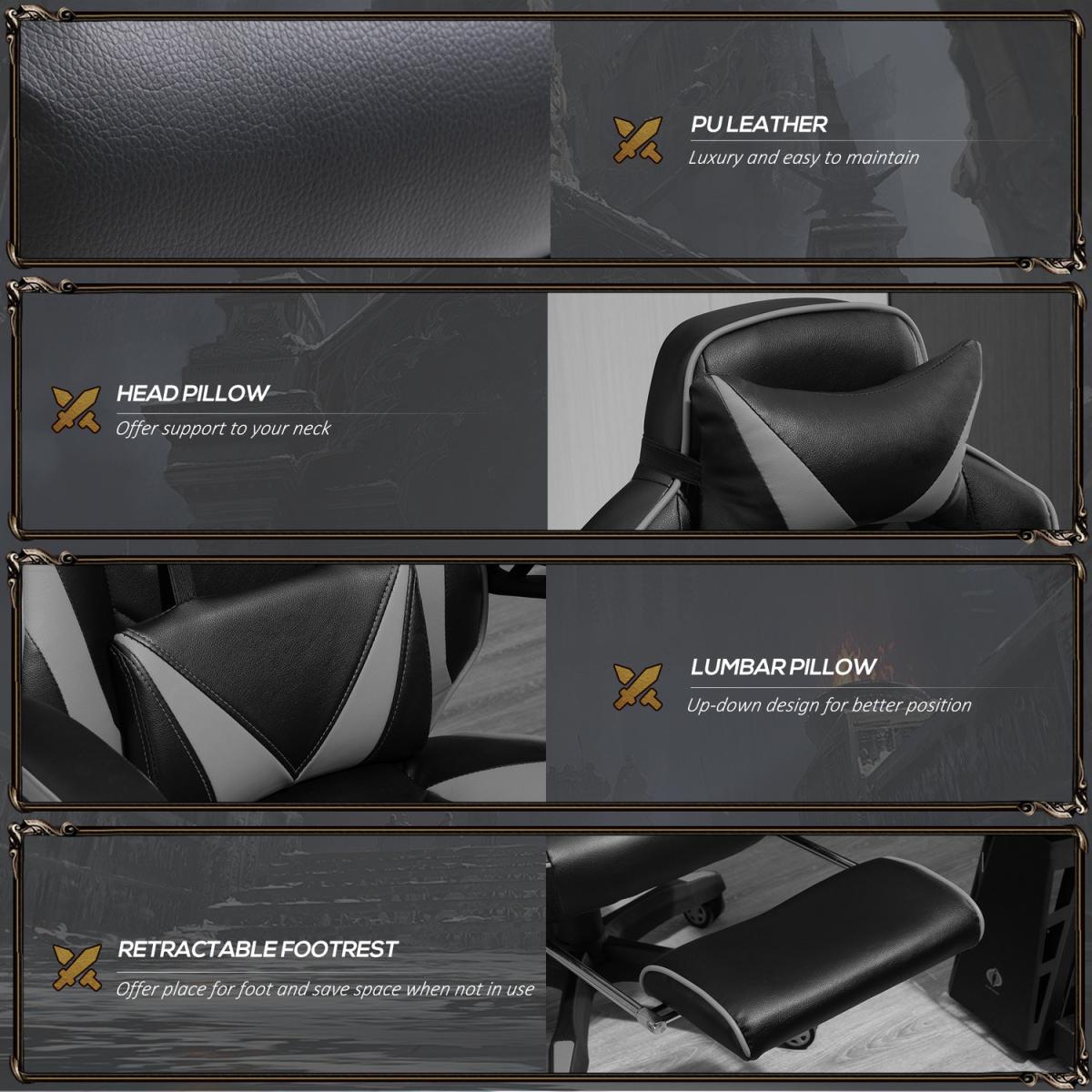 Fulfil your need for some serious style with this gaming chair from Vinsetto. It's fitted with thick foam for comfort and wrapped in black PU leather with cool blue panels. Ergonomic in design, it features a high back, armrests, a five-wheel base and the chair can swivel around 360 degrees. It is also equipped with a manual retracting footrest, which is perfectly paired in sync with the reclining back when you want to take a rest. Whether it's work or play, this chair is the seat to do it all in.