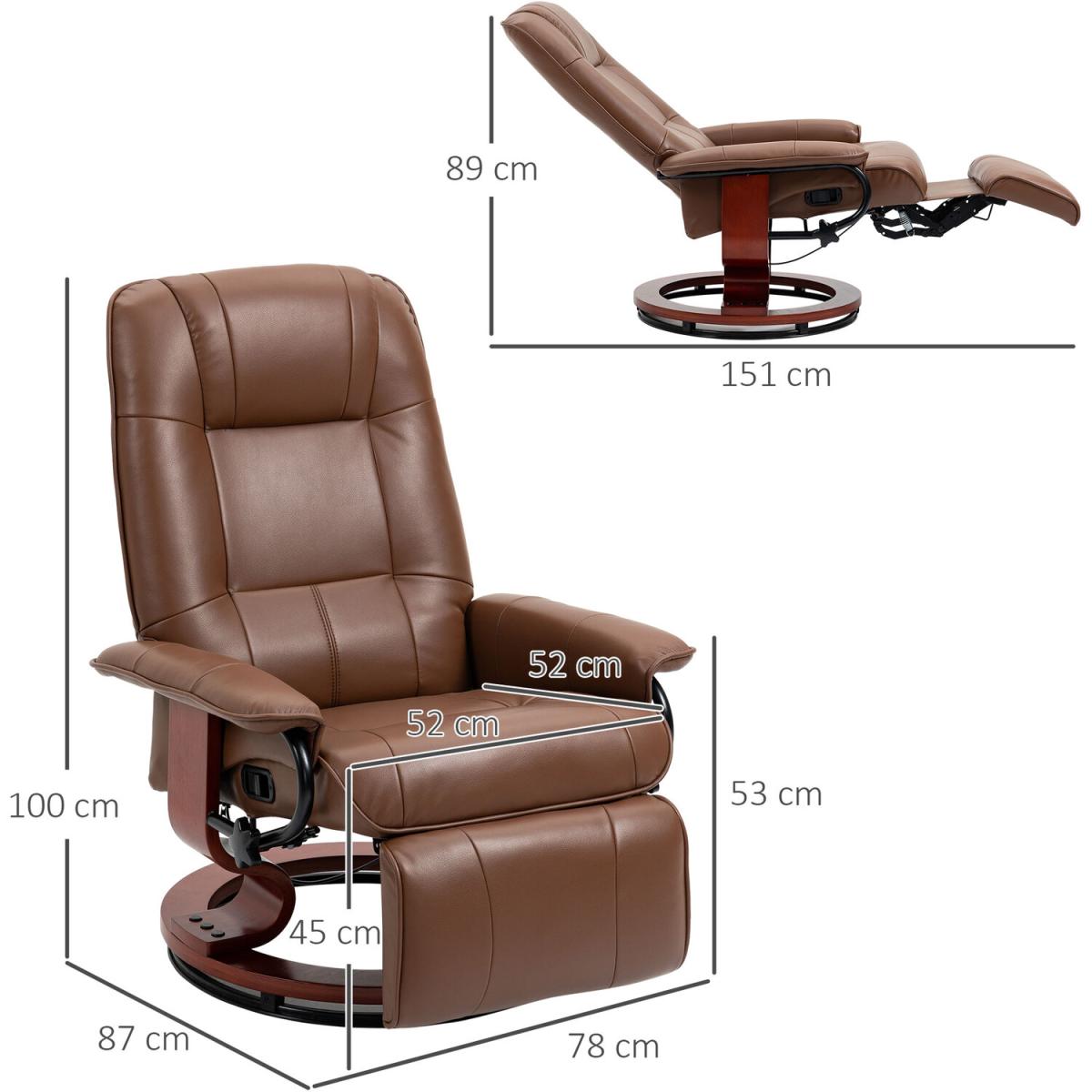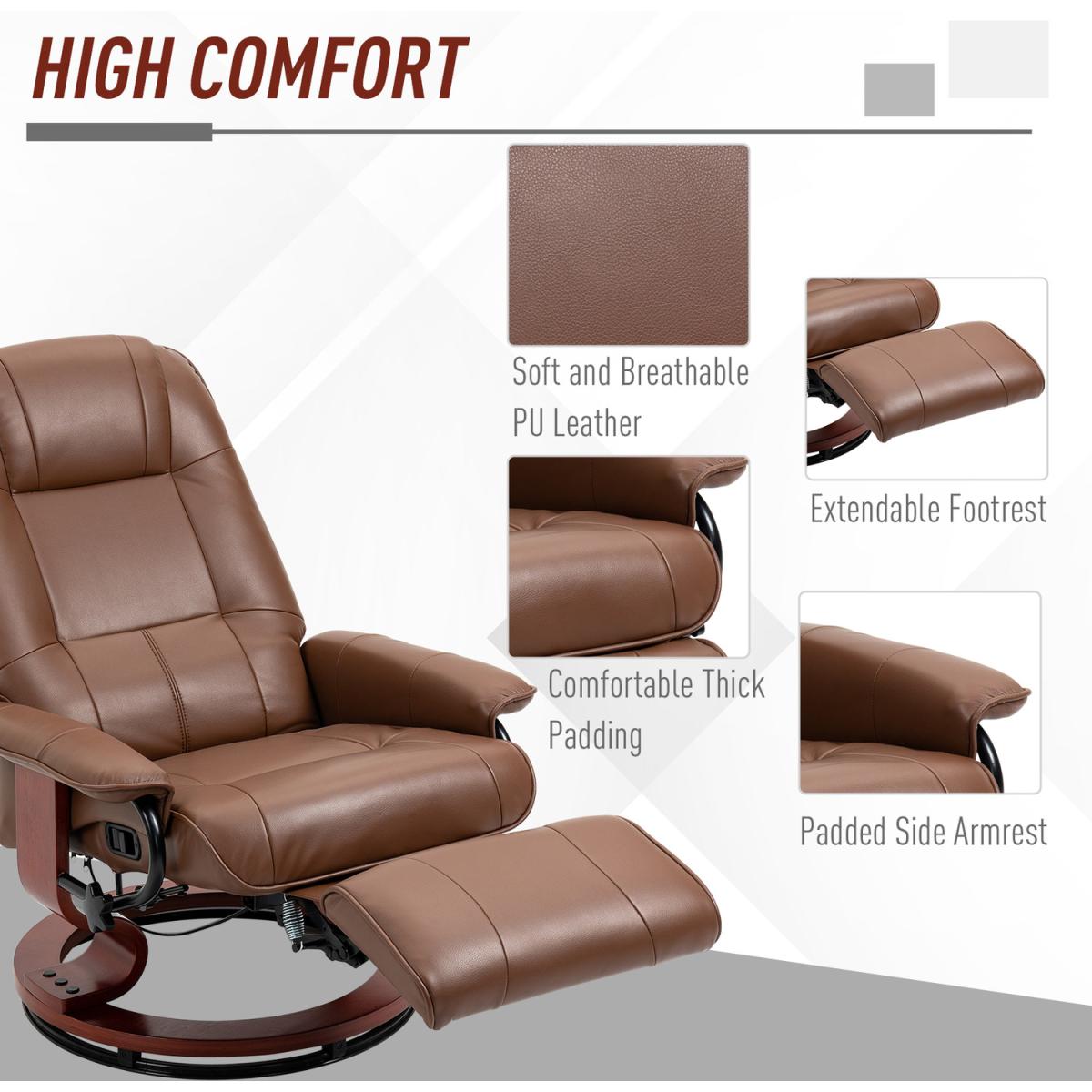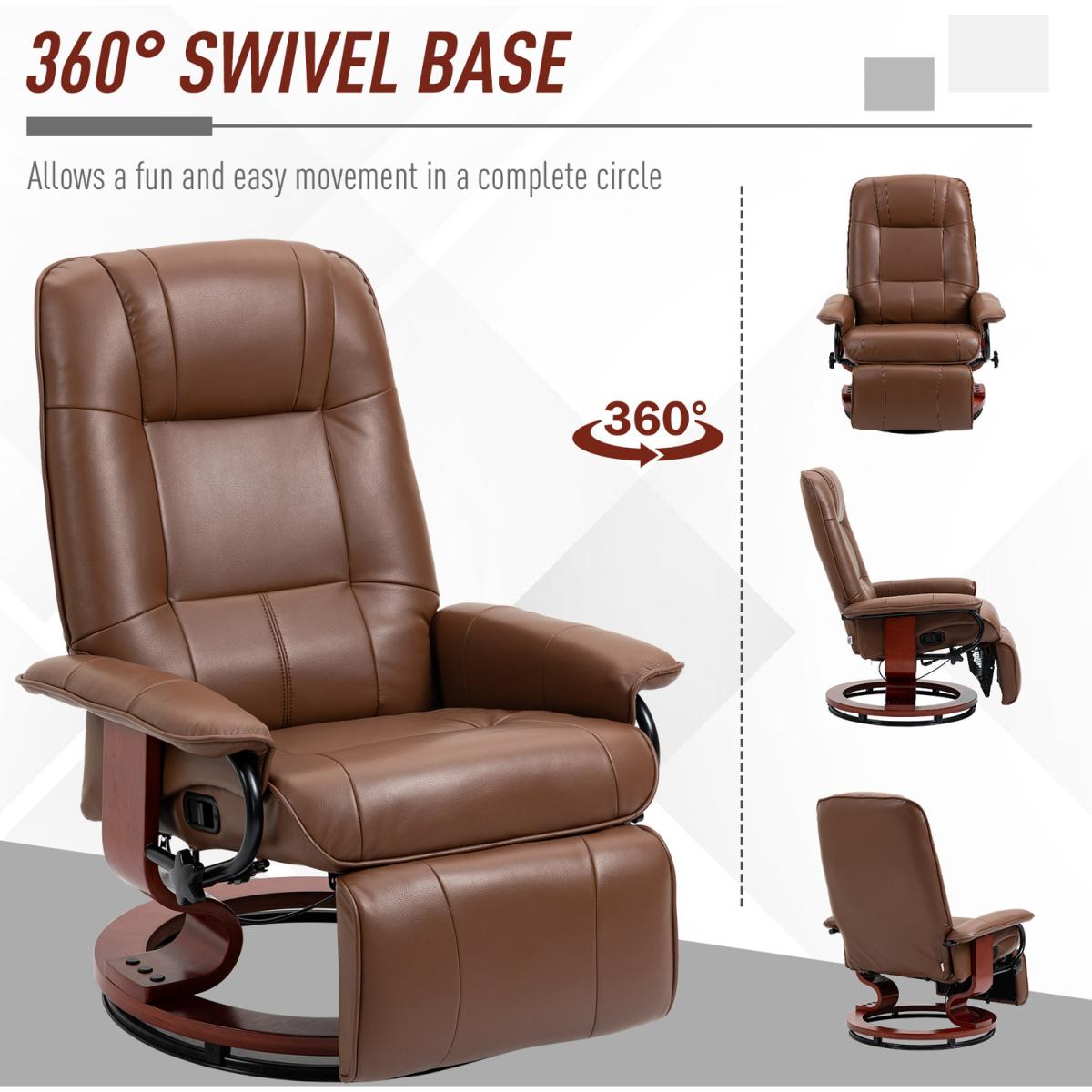Relaxing after a long and hard day at work has never been so comfortable, thanks to this HOMCOM recliner armchair. A full 360 swivel base for full mobility, made from wood to keep you supported and round in size for balance. Padded all over to sink into, with a reclining back and manual footrest to allow you to truly relax into. Completed with soft faux leather upholstery, beautiful and stylish.