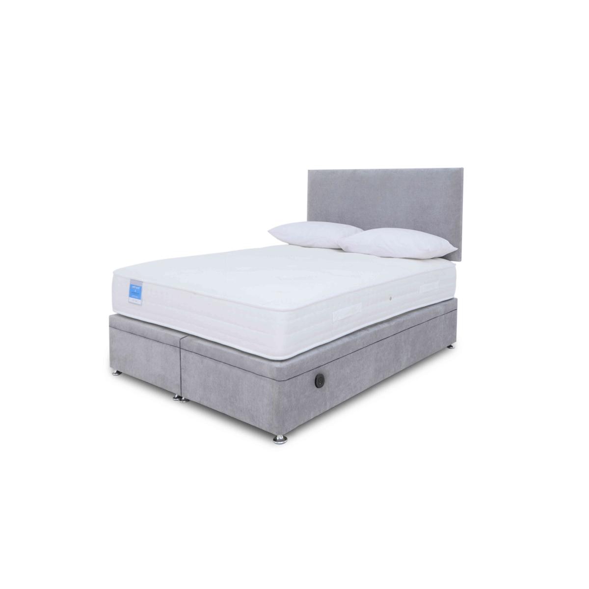 With the beds and mattresses in the Sleep Story Ergosense range, you’ll experience total comfort and support. The medium-feel mattresses in the collection have 1000 individually pocketed springs in king size that ensure correct spinal alignment while you sleep while layers of medical-grade Ergosense foam provide body-responsive comfort. The range also includes a wide choice of divan sets with beautifully upholstered divan bases that come with space-saving drawer and ottoman storage options including an electric-powered ottoman divan base. The great-value Sleep Story Ergosense range is made in Britain by Highgrove exclusively for Furniture Village. This ottoman divan set is electric-powered for easy access to the storage compartment and comes with a fabulous medium-feel pocket spring mattress. Effortless comfort at a great-value price. Why you'll love it Electric ottoman divan set includes a luxurious tufted mattress with a high-performance foam layer. Tradition meets technology at a great-value price. The ultra-sensitive Ergosense foam layer reacts immediately to body weight and shape. Relieves pressure and improves blood circulation. Helps to minimise restless sleep for more refreshed days. AdvantEdge® pocket spring system has 1000 springs in king size. It’s designed to offer total body support across the entire sleep surface. Ensures correct spinal alignment for better quality of sleep. DynamicEdge active side support maximises the sleep surface and prevents roll off. Breathable stretch fabric cover. Hypoallergenic. Platform-top base with spacious end-opening ottoman storage. Electric powered for effortless access to the storage compartment. Available in a wide selection of stylish upholstery fabrics. Made in the UK by Highgrove and exclusive to Furniture Village. This electric ottoman divan set is part of the Sleep Story Ergosense range. Shop the Sleep Story Ergosense range for mattresses, divan sets, electric ottoman beds and more. What you need to know Headboard is an optional extra. Mattress type: Pocket spring. Weight:Small single 16.5 kg, single 19.8 kg, small double 26.4 kg, double 29.7 kg, king 33 kg and super king 39.6 kg. Depth: 25 cm. Firmness: Medium. Springs: 1000 pocket springs in king size. Pillow top: No. Fillings: Medical-grade foam and polyester Cover:Stretch fabric cover. Requires turning: Yes. Base type: Platform top with electric-powered end-opening ottoman storage. Sizes: Small single, single, small double, double, king and super king. Mattress care:Air for 4 hours before using to remove any odour. Allow at least 4 hours for springs to settle and for mattress to attain its full size. Indentations caused by settlement of fillings or body weight are normal and are not considered defects. If used on a slatted bed frame, the space between slats must be no wider than 7.5 cm. Spaces wider than this may cause excess dipping of the mattress and invalidate the guarantee. Always use a mattress protector. Rotate regularly. Divan base care: Clean upholstery weekly using a soft brush or vacuum with the curtain attachment. Professional cleaning advised for oil- and grease-based stains. Be careful care when opening and closing the ottoman base. The ottoman base is powered by mains electricity. Please ensure that you will be able to connect it to a power source before ordering. Ordering a small double, double, king or super king size? Your divan base will be supplied in two halves for easier access.