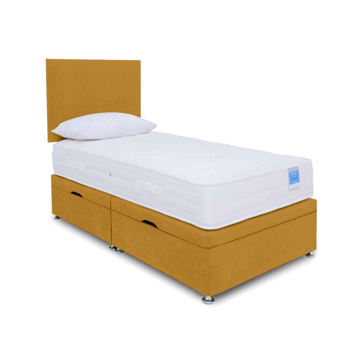 With the beds and mattresses in the Sleep Story Ergosense range, you’ll experience total comfort and support. The medium-feel mattresses in the collection have 1000 individually pocketed springs in king size that ensure correct spinal alignment while you sleep while layers of medical-grade Ergosense foam provide body-responsive comfort. The range also includes a wide choice of divan sets with beautifully upholstered divan bases that come with space-saving drawer and ottoman storage options including an electric-powered ottoman divan base. The great-value Sleep Story Ergosense range is made in Britain by Highgrove exclusively for Furniture Village. The side-opening ottoman storage base in this divan set is perfect for a more compact bedroom, and its medium-feel pocket spring mattress promises better sleep, night after night. Why you'll love it Ottoman divan set includes a luxurious tufted mattress with a high-performance foam layer. Tradition meets technology at a great-value price. The ultra-sensitive Ergosense foam layer reacts immediately to body weight and shape. Relieves pressure and improves blood circulation. Helps to minimise restless sleep for more refreshed days. AdvantEdge® pocket spring system has 1000 springs in king size. It’s designed to offer total body support across the entire sleep surface. Ensures correct spinal alignment for better quality of sleep. DynamicEdge active side support maximises the sleep surface and prevents roll off. Breathable stretch fabric cover. Hypoallergenic. Platform-top base with spacious side-opening ottoman storage compartment. Available in a wide selection of stylish upholstery fabrics. Made in the UK by Highgrove and exclusive to Furniture Village. This ottoman divan set is part of the Sleep Story Ergosense range. Shop the Sleep Story Ergosense range for mattresses, divan sets, electric ottoman beds and more. What you need to know Headboard is an optional extra. Mattress type: Pocket spring. Weight:Small single 16.5 kg, single 19.8 kg, small double 26.4 kg, double 29.7 kg, king 33 kg and super king 39.6 kg. Depth: 25 cm. Firmness: Medium. Springs: 1000 pocket springs in king size. Pillow top: No. Fillings: Medical-grade foam and polyester Cover:Stretch fabric cover. Requires turning: Yes. Base type: Platform top with side-opening ottoman storage. Sizes: Small single, single, small double, double, king and super king. Mattress care:Air for 4 hours before using to remove any odour. Allow at least 4 hours for springs to settle and for mattress to attain its full size. Indentations caused by settlement of fillings or body weight are normal and are not considered defects. If used on a slatted bed frame, the space between slats must be no wider than 7.5 cm. Spaces wider than this may cause excess dipping of the mattress and invalidate the guarantee. Always use a mattress protector. Rotate regularly. Divan base care: Clean upholstery weekly using a soft brush or vacuum with the curtain attachment. Professional cleaning advised for oil- and grease-based stains. Be careful care when opening and closing the ottoman base. Ordering a small double, double, king or super king size? Your divan base will be supplied in two halves for easier access.