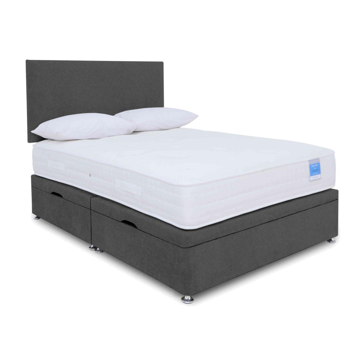 With the beds and mattresses in the Sleep Story Ergosense range, you’ll experience total comfort and support. The medium-feel mattresses in the collection have 1000 individually pocketed springs in king size that ensure correct spinal alignment while you sleep while layers of medical-grade Ergosense foam provide body-responsive comfort. The range also includes a wide choice of divan sets with beautifully upholstered divan bases that come with space-saving drawer and ottoman storage options including an electric-powered ottoman divan base. The great-value Sleep Story Ergosense range is made in Britain by Highgrove exclusively for Furniture Village. The side-opening ottoman storage base in this divan set is perfect for a more compact bedroom, and its medium-feel pocket spring mattress promises better sleep, night after night. Why you'll love it Ottoman divan set includes a luxurious tufted mattress with a high-performance foam layer. Tradition meets technology at a great-value price. The ultra-sensitive Ergosense foam layer reacts immediately to body weight and shape. Relieves pressure and improves blood circulation. Helps to minimise restless sleep for more refreshed days. AdvantEdge® pocket spring system has 1000 springs in king size. It’s designed to offer total body support across the entire sleep surface. Ensures correct spinal alignment for better quality of sleep. DynamicEdge active side support maximises the sleep surface and prevents roll off. Breathable stretch fabric cover. Hypoallergenic. Platform-top base with spacious side-opening ottoman storage compartment. Available in a wide selection of stylish upholstery fabrics. Made in the UK by Highgrove and exclusive to Furniture Village. This ottoman divan set is part of the Sleep Story Ergosense range. Shop the Sleep Story Ergosense range for mattresses, divan sets, electric ottoman beds and more. What you need to know Headboard is an optional extra. Mattress type: Pocket spring. Weight:Small single 16.5 kg, single 19.8 kg, small double 26.4 kg, double 29.7 kg, king 33 kg and super king 39.6 kg. Depth: 25 cm. Firmness: Medium. Springs: 1000 pocket springs in king size. Pillow top: No. Fillings: Medical-grade foam and polyester Cover:Stretch fabric cover. Requires turning: Yes. Base type: Platform top with side-opening ottoman storage. Sizes: Small single, single, small double, double, king and super king. Mattress care:Air for 4 hours before using to remove any odour. Allow at least 4 hours for springs to settle and for mattress to attain its full size. Indentations caused by settlement of fillings or body weight are normal and are not considered defects. If used on a slatted bed frame, the space between slats must be no wider than 7.5 cm. Spaces wider than this may cause excess dipping of the mattress and invalidate the guarantee. Always use a mattress protector. Rotate regularly. Divan base care: Clean upholstery weekly using a soft brush or vacuum with the curtain attachment. Professional cleaning advised for oil- and grease-based stains. Be careful care when opening and closing the ottoman base. Ordering a small double, double, king or super king size? Your divan base will be supplied in two halves for easier access.