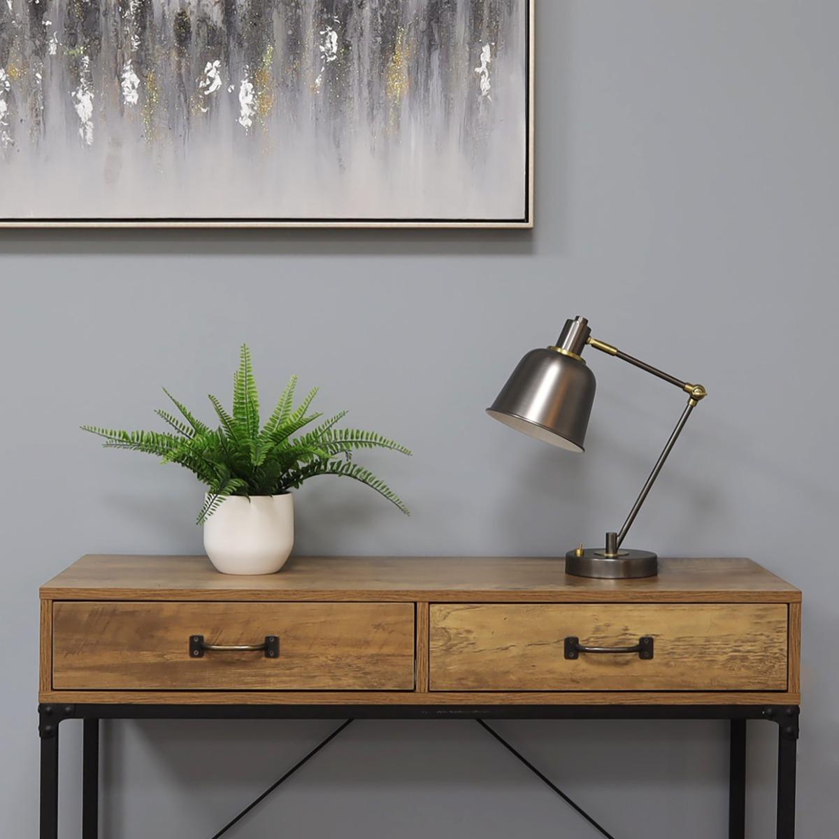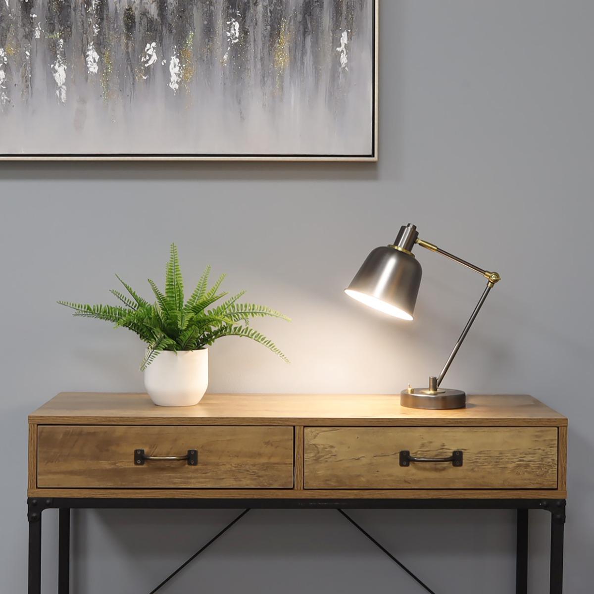 Industrial style table lamp featuring a gunmetal finish. Add an industrial touch to your home with the stunning Erik table lamp. Finished in a distressed gunmetal finish metal base with an adjustable head for an industrial look. This table lamp will complement any room, desk or workspace.