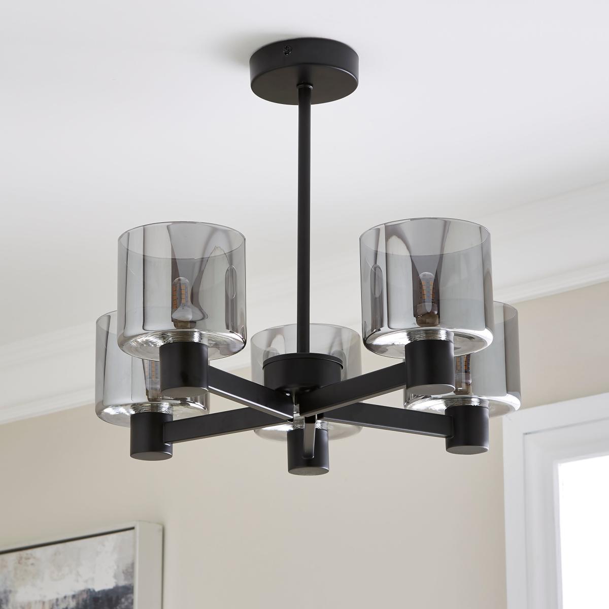 I love this black five-light ceiling fitting for its sleek, modern silhouette that works well in a variety of interiors. It’s especially suited to contemporary or industrial spaces, but can also add a striking contrast in more traditional settings when paired with warm wood tones or softer textiles. Practical styling tips include installing it in a room with high ceilings to make a bold statement, or in a dining area for even, functional lighting. Using clear or smoked glass shades like these helps to soften the light and add visual interest without overpowering the space. Overall, it’s a versatile piece that combines simplicity with a touch of edge, making it a great choice for both minimalist and eclectic schemes.