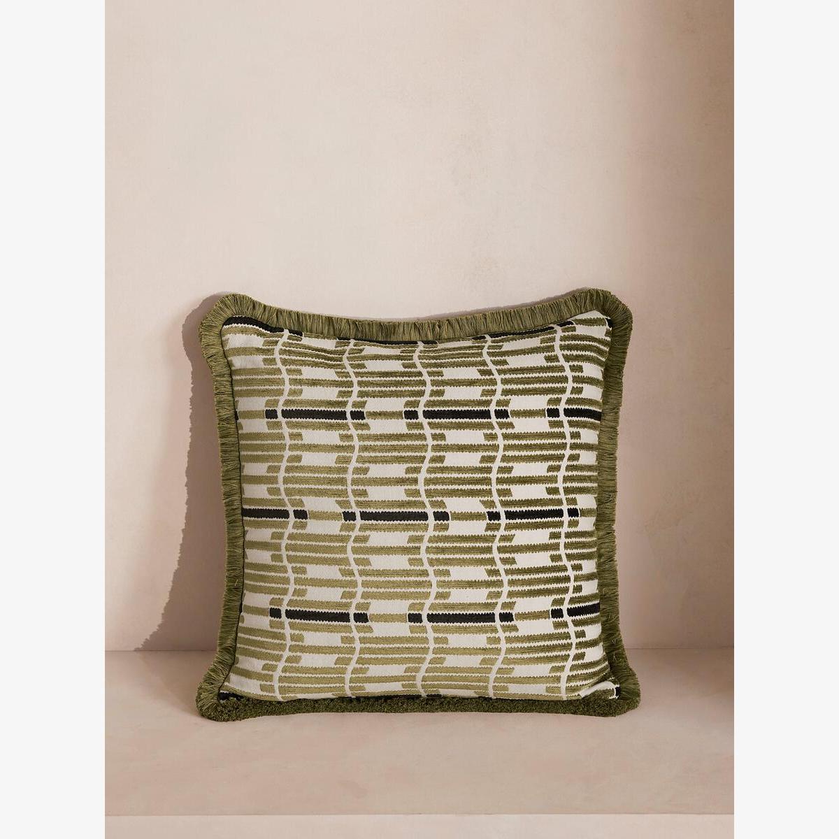 This cushion features a bold jacquard to both sides, designed in-house and woven in Turkey from soft chenille. Solid eyelash fringing complements the olive and black colour palette, inspired by Soho House Rome. Square double-sided design Chenille jacquard woven in Turkey Solid eyelash fringing Feather-filled cushion pad