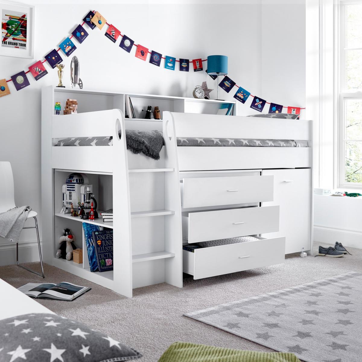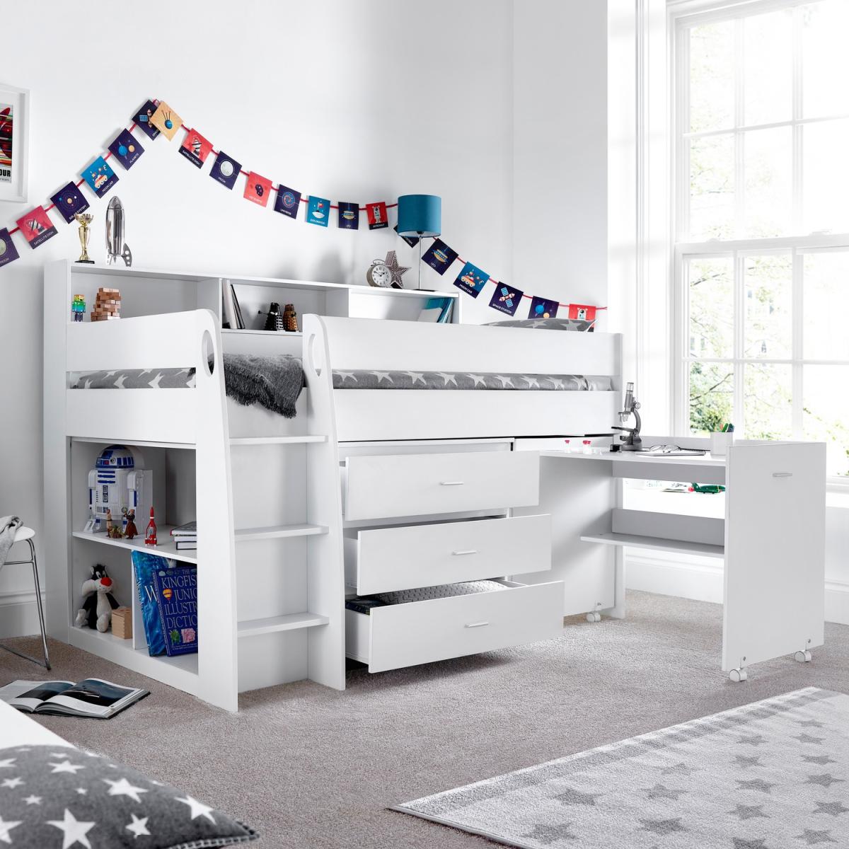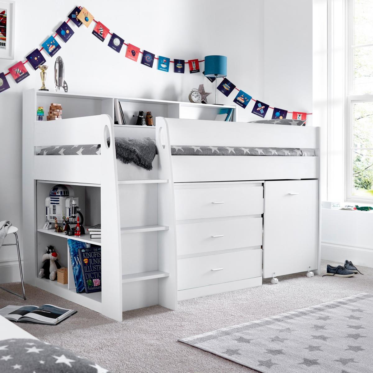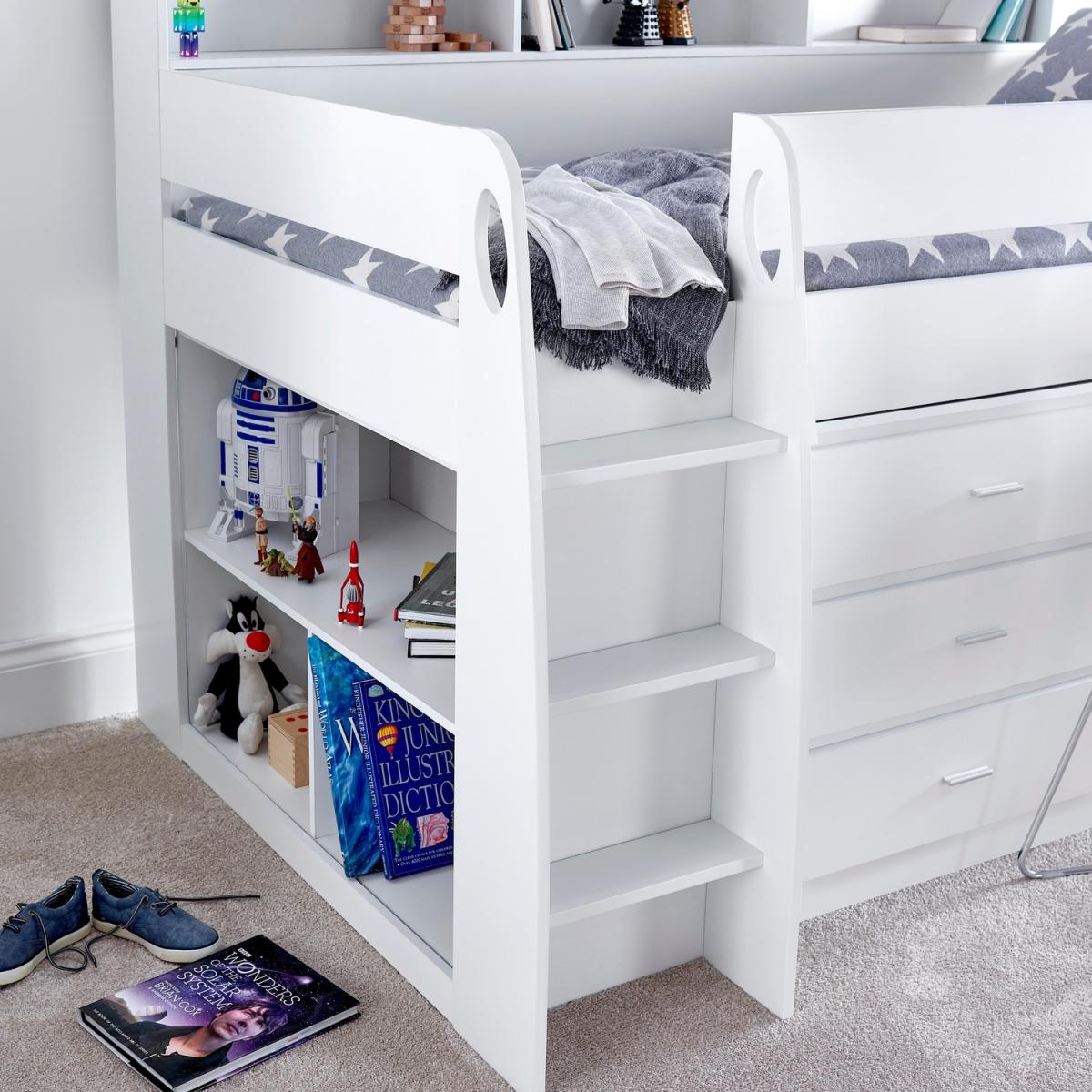 A truly modern mid-sleeper which offers superior design and elegant storage solutions. The pull-out desk and multiple storage units mean this bed combines an entire bedroom solution into one compact space. The bed features a shelving unit with 4 shelves, a cabinet with 3 drawers and a spacious desk. Clean lines, a stylish ladder and built-in shelves will make sure this mid-sleeper transforms your childs bedroom.