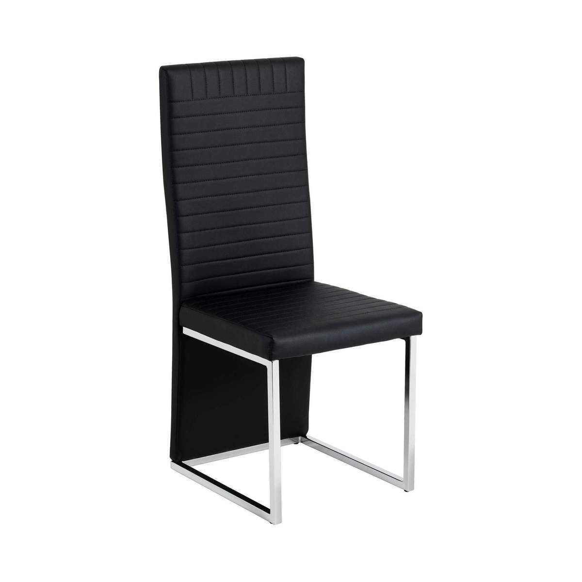 Black faux leather meets polished chrome in a stylish match;Dining chair has high, angled backrest;Fully upholstered in faux leather from top to floor;Striking stitching detail adds visual interest;Sturdy chrome base;Perfect for minimal and modern interiors