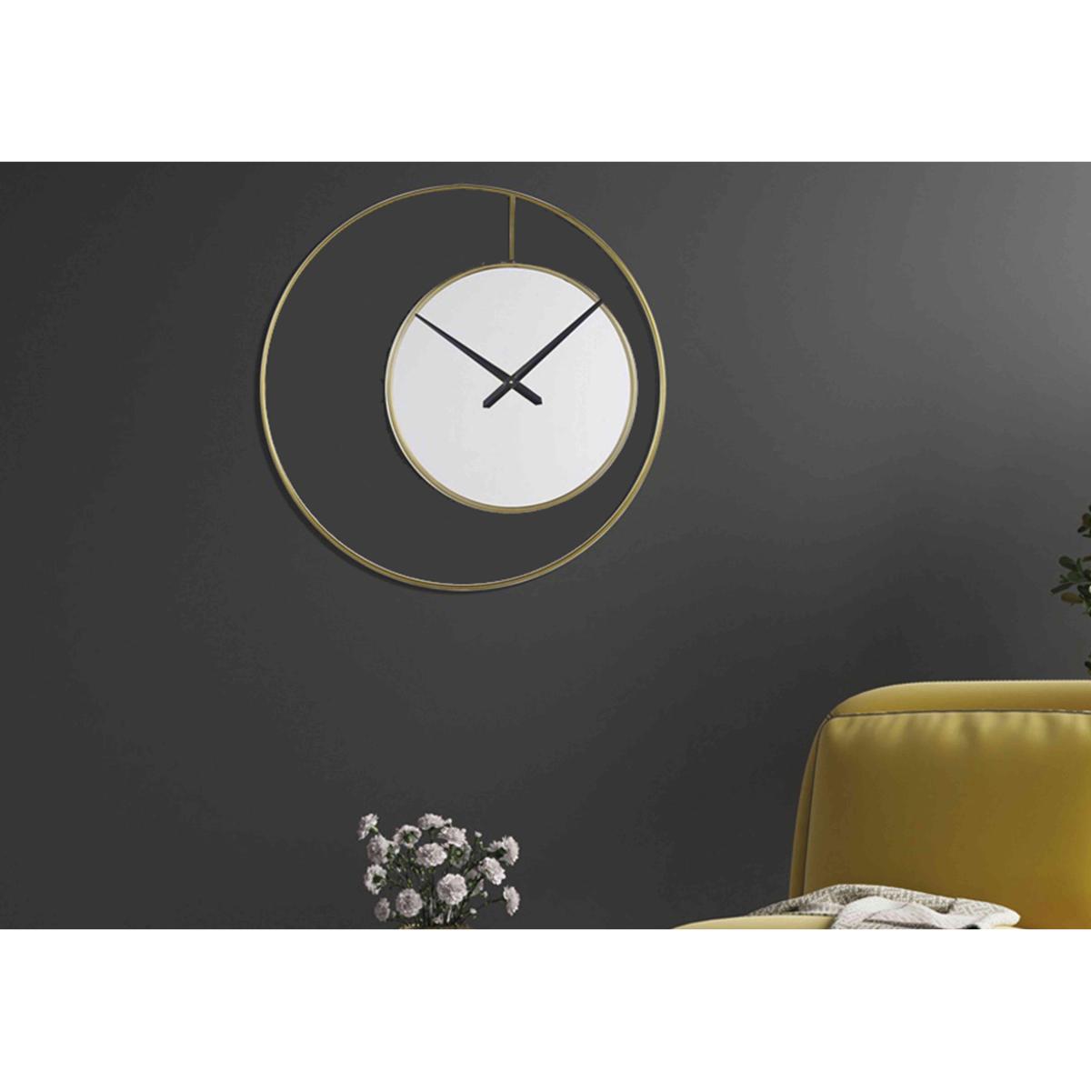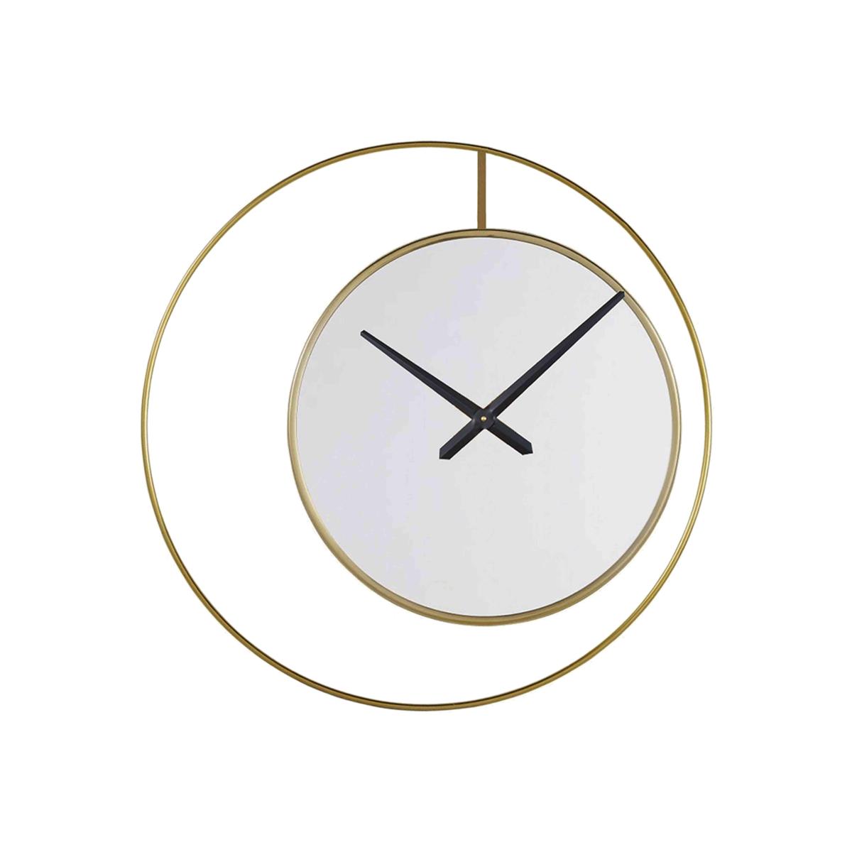 This is a truly unique oversized wall clock featuring a beautiful asymmetric design in a sophisticated on-trend colour palette. Why you'll love it Understated wall clock is suspended within a circular gold-effect frame. Contemporary asymmetric design. Minimal mirrored clock face with simple black hands. Reliable quartz movement. A large and striking wall clock for a feature wall. This wall clock is part of the Furniture Village home accessories collection. What you need to know Gold-effect metal frame. Requires 1 x AA alkaline battery, included. Batteries should be changed twice a year. For indoor use only. To clean, simply dust with a soft, clean lint-free cloth. Dimensions Diameter: 90 cm (36 in). Depth: 2 cm (1 in).