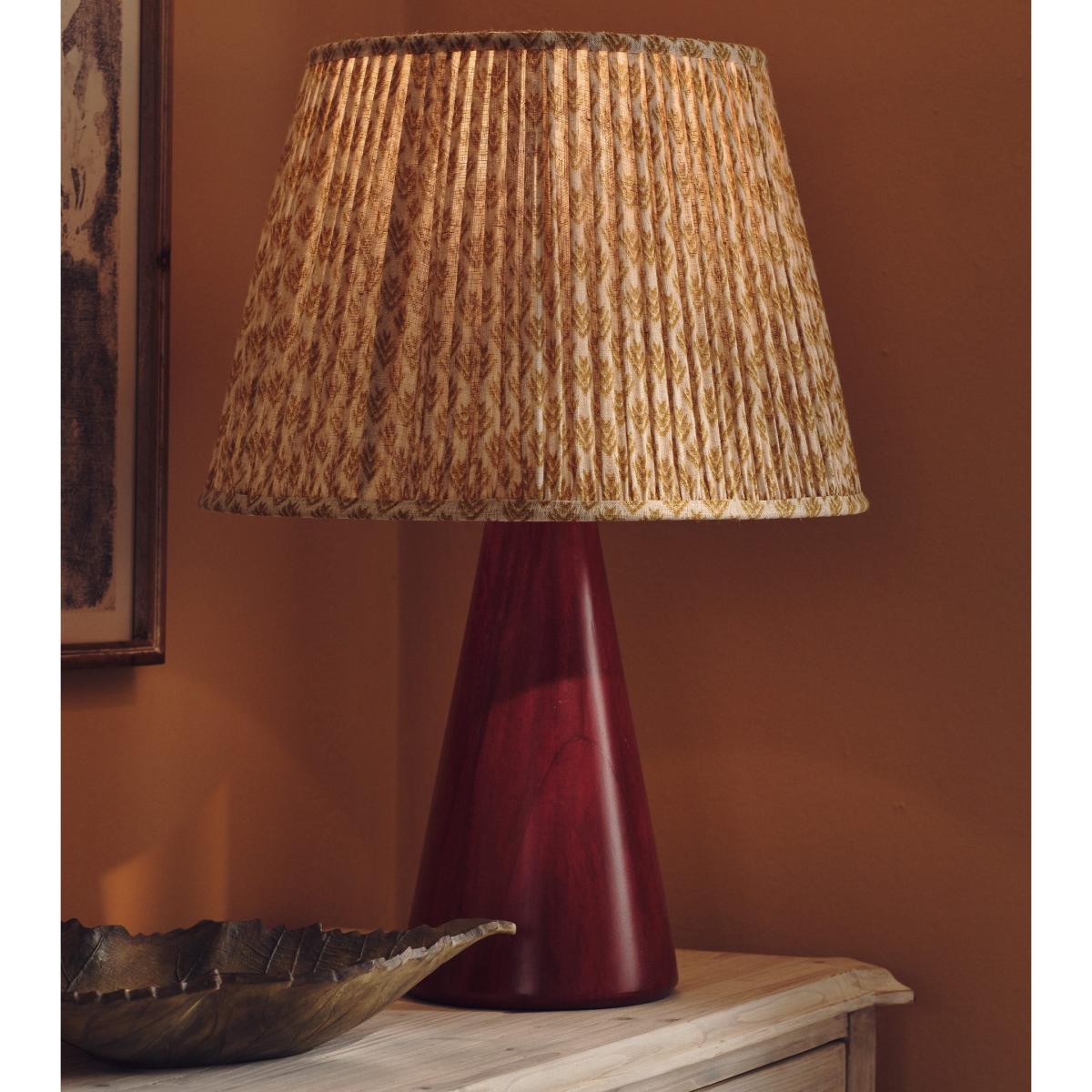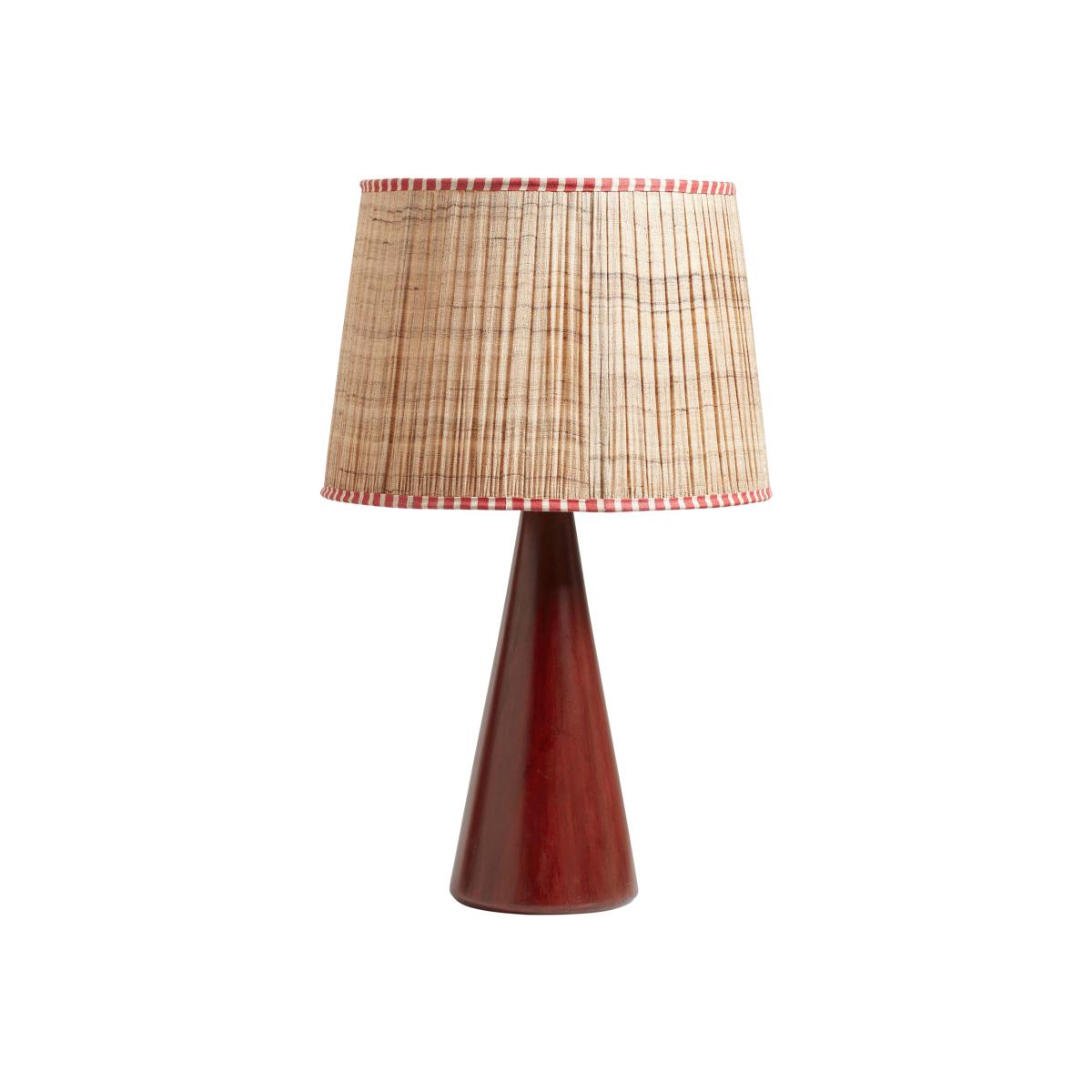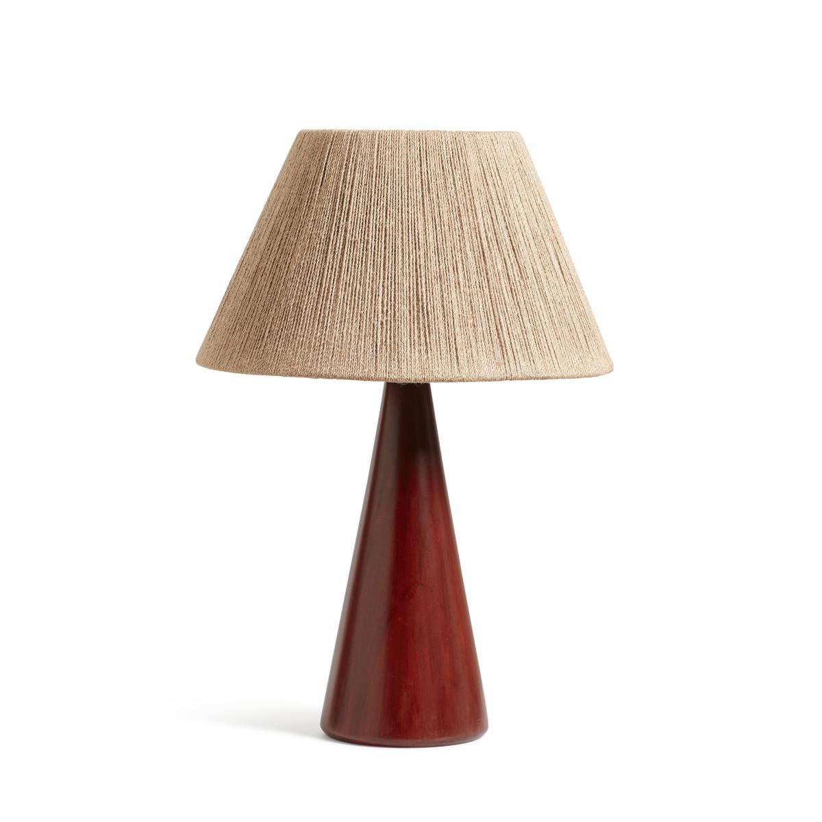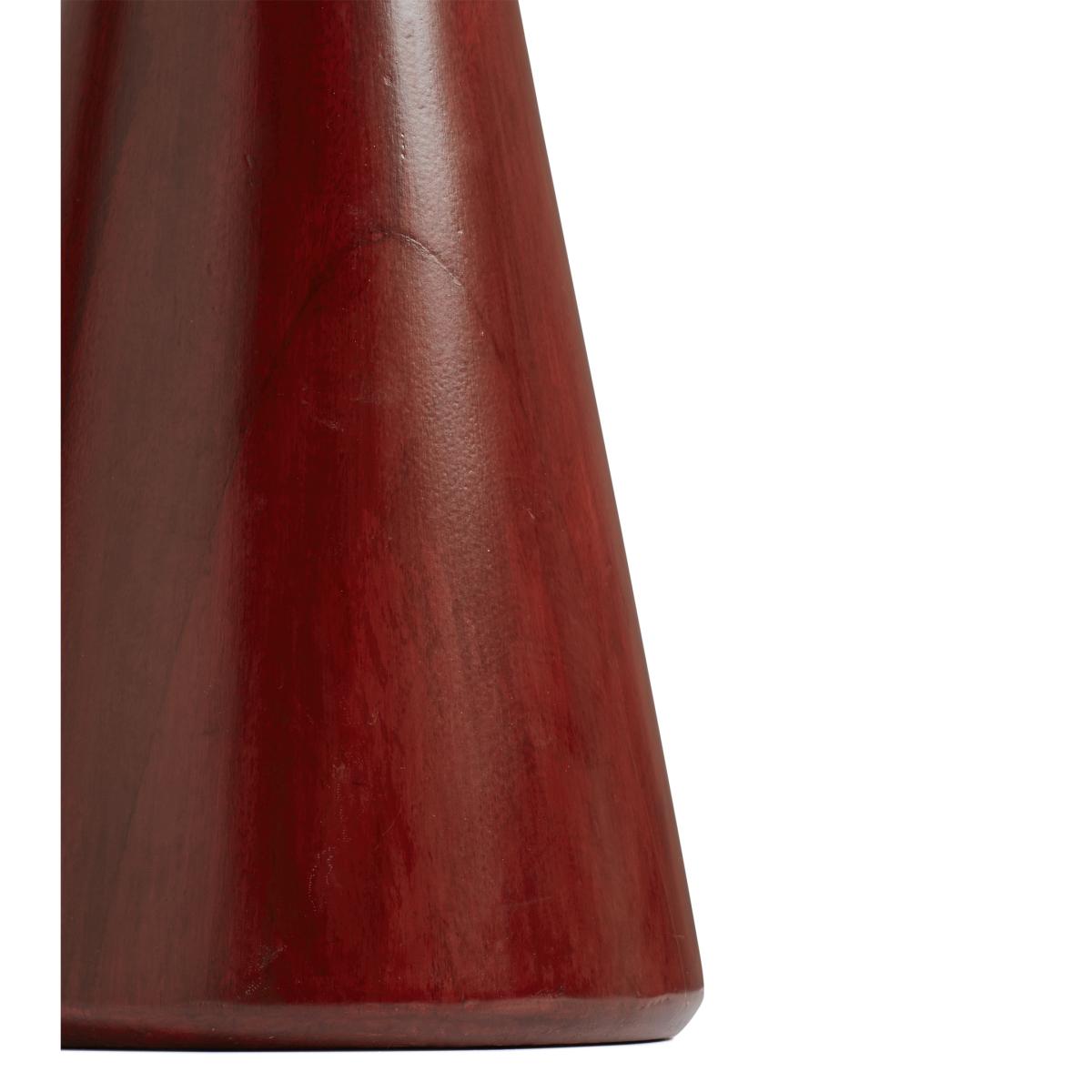 The unique cone shape of our Ernest Table Lamp is hand carved from mango wood. It’s then sanded and stained adeep red colour before being sanded again to create the brushed, matt appearance. The lamp’s texture is partly due to its hand-painted nature and partly a result of the wood’s natural grain and the sanding process. This all creates tonal variation that will be different from piece to piece.