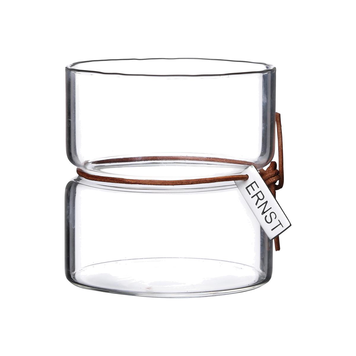 A home is not a home without the calm of the Ernst candle holder H8. 5cm Ø8cm. This candle holder is made from glass and has a simple leather strap, signed by our Ernst Kirchsteiger. Because the lamp is made of clear glass, you can watch the candle burn down as the evening draws to an end.