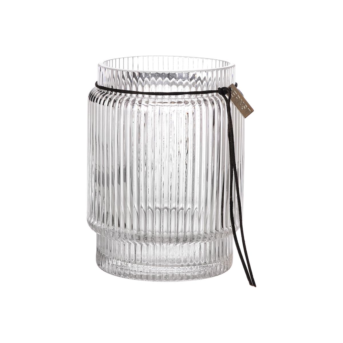 The Ernst ribbed clear glass vase is made of glass in a cylindrical design, and is decorated with a thin leather strap at its tapered mouth. The vase is perfect for a beautiful flower arrangement to bring life and joy into your home, in the true Ernst Kirchsteiger spirit. The glass vase is an eye-catching feature that can be placed on the dining table, or on a bookshelf in your living room.