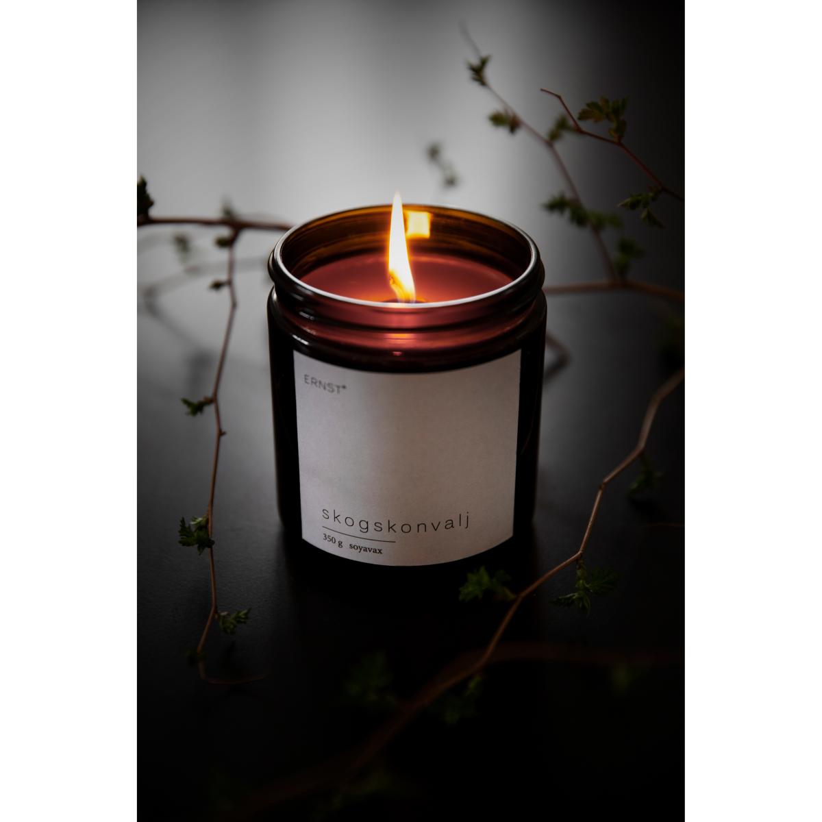 Ernst scented candle in glass with lid Ø7,2 has a lovely soft scent and comes in a minimalistic brown glass holder with a white lable and black metal lid. The scented candle is made from soya wax, which offers a long burn time without releasing any harmful substances. Put the Ernst scented canlde in a well-chosen place and enjoy the delightful scent that it spreads throughout your home.
