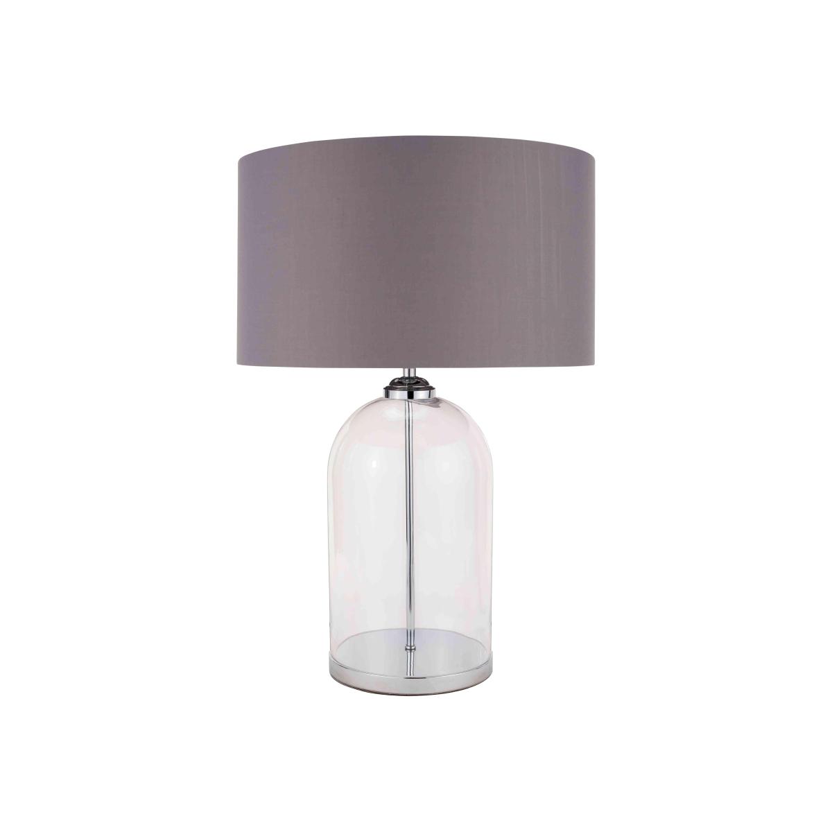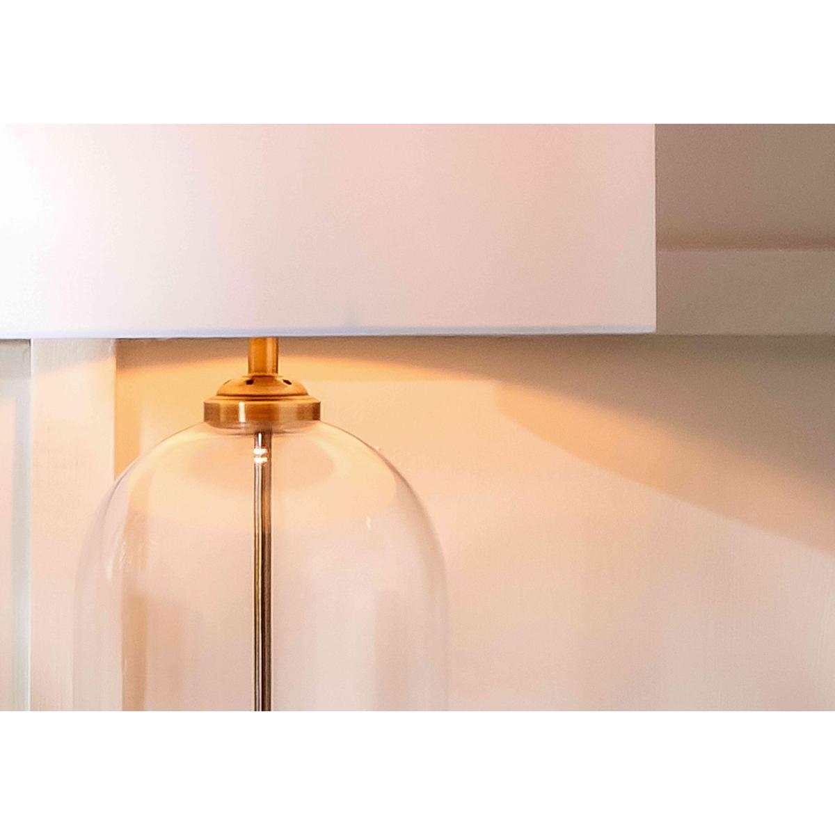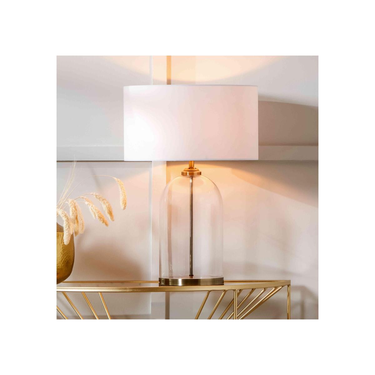 With its dome-shaped glass base and elegant fabric lampshade, this table lamp is the essence of understated style. The glass base is mouth-blown, and the lamp is available in two colourways. Why you'll love it Elegant glass-base table lamp with stylish exposed fittings. Contemporary handcrafted style. Dome-shaped mouth-blown glass base. Choose polished nickel or antique brass-effect plinth and fittings. Supplied with a coordinating fabric lampshade. A Furniture Village online exclusive. This table lamp is part of the Furniture Village lighting collection. What you need to know Glass lamp base. Poly cotton lampshade. Supplied with 250 cm cable. Inline switch. Requires 1 x E27 max. 60W bulb (not included). Dust with a soft, clean cloth. Unplug while cleaning. Dimensions including lampshade Height: 60 cm (23 in). Diameter: 41 cm (16 in).