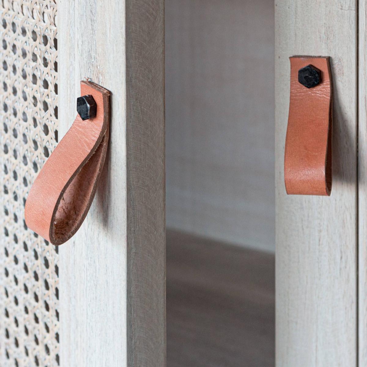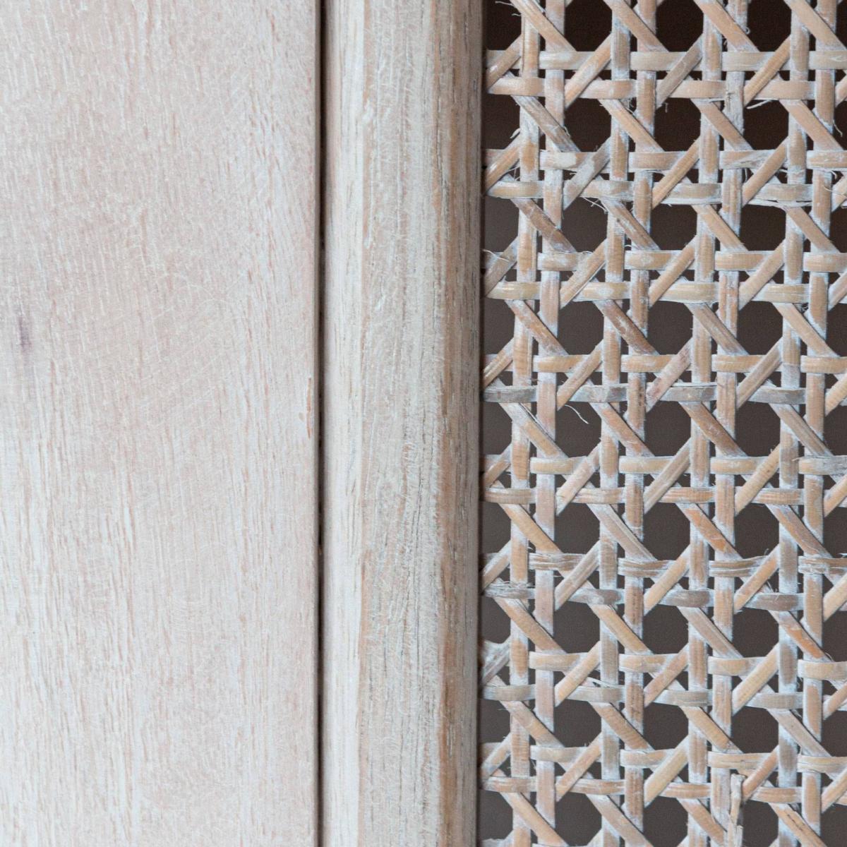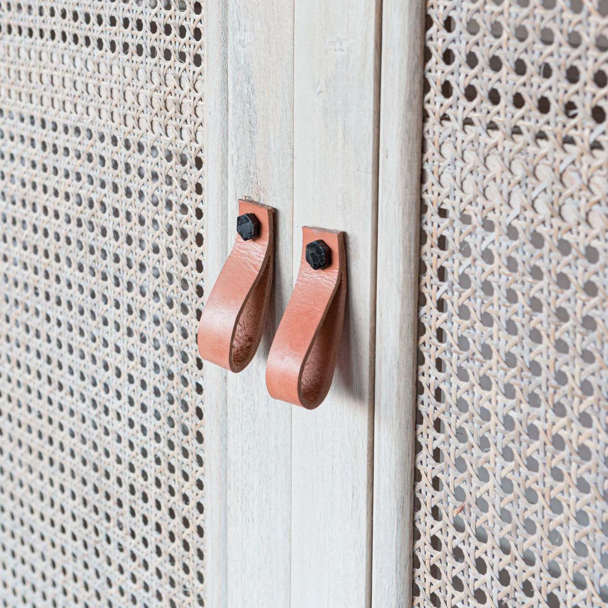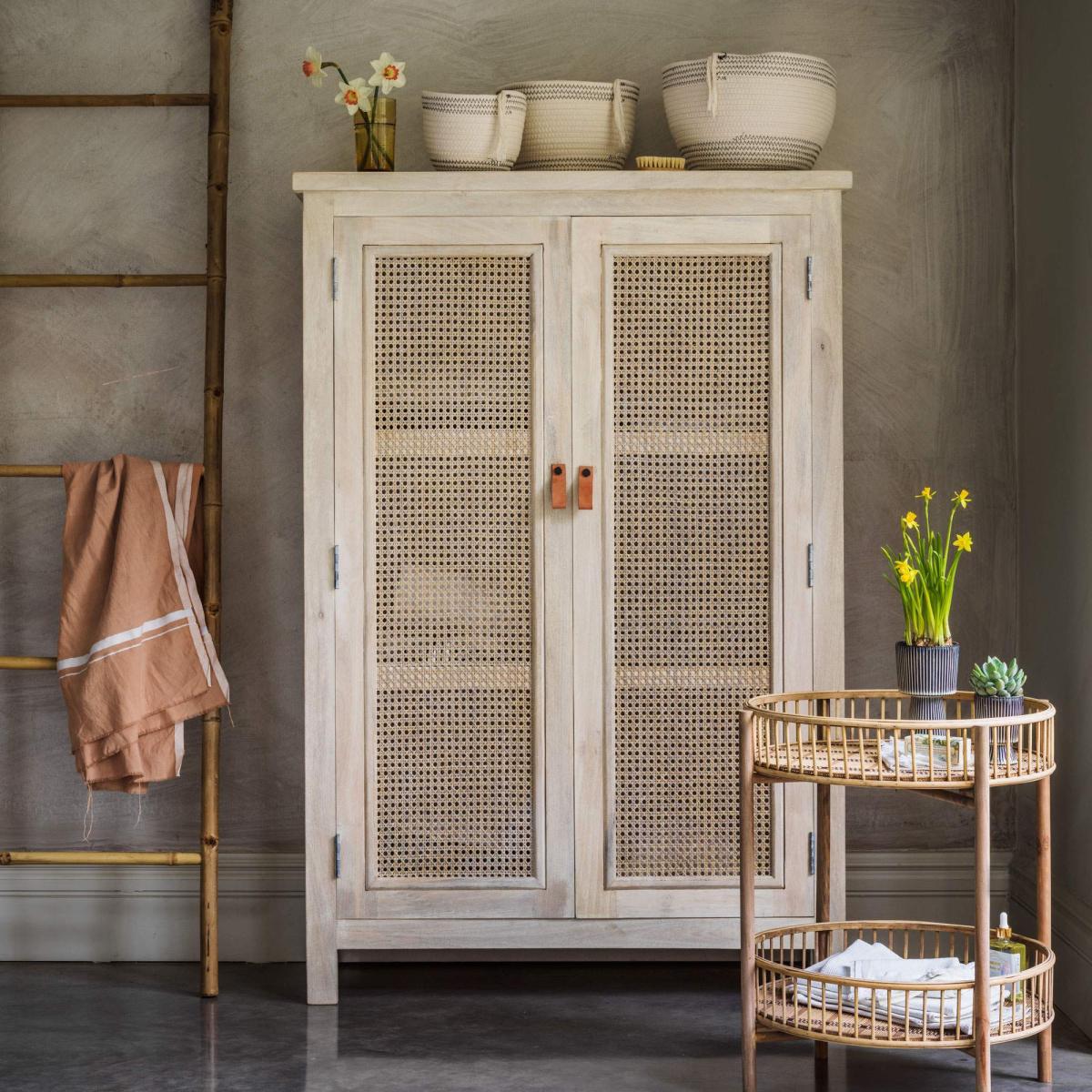 This simple elegant cabinet, crafted from sustainable mango wood in a classic whitewash, has rattan detailing, leather handles, and will add Scandinavian glamour to any room.