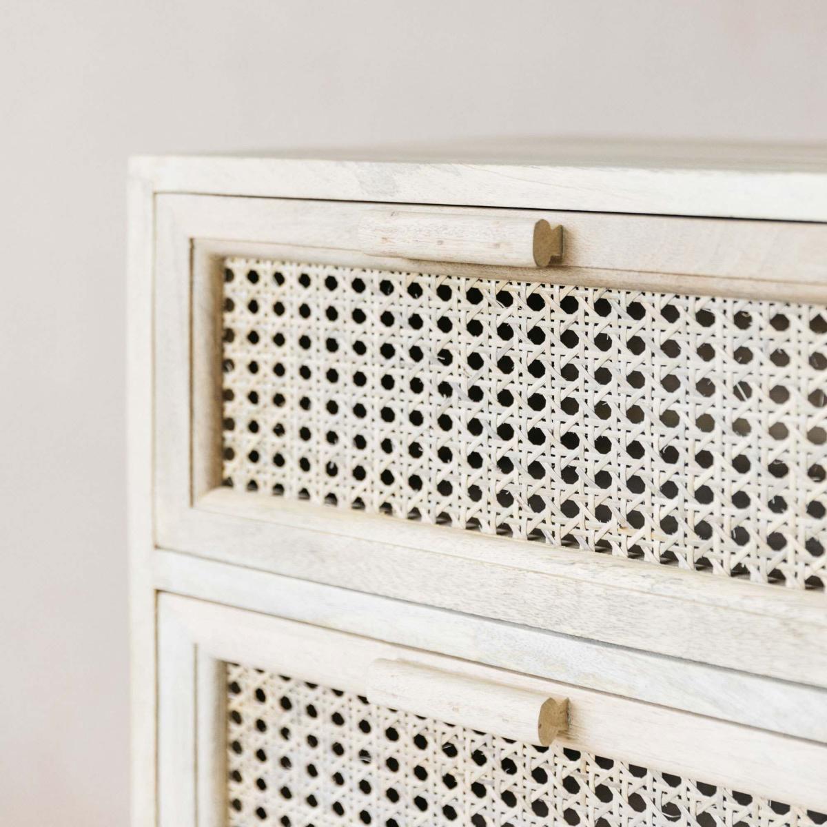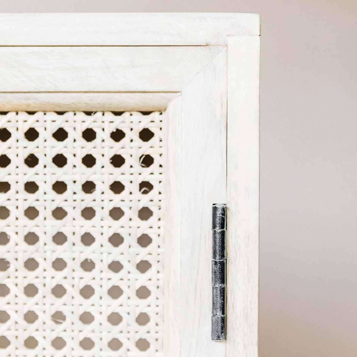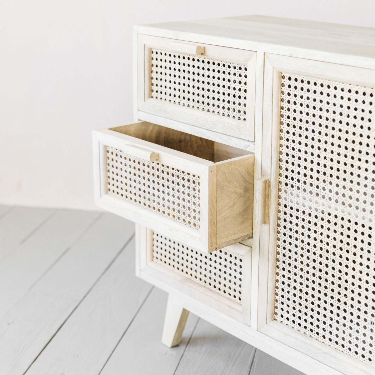 An unmistakable seventies revival, our Esben cabinet is handcrafted from solid mango wood with a white patina finish and a distinct retro-inspired webbed cane front. Featuring three deep drawers and two shelves hidden behind a single door, this handsome cabinet perfectly combines style and functionality.