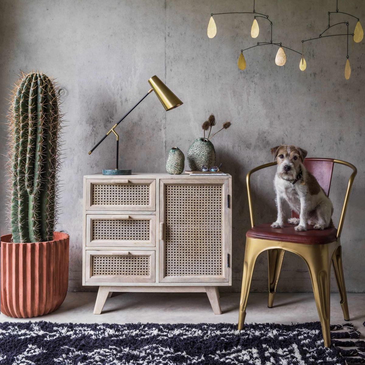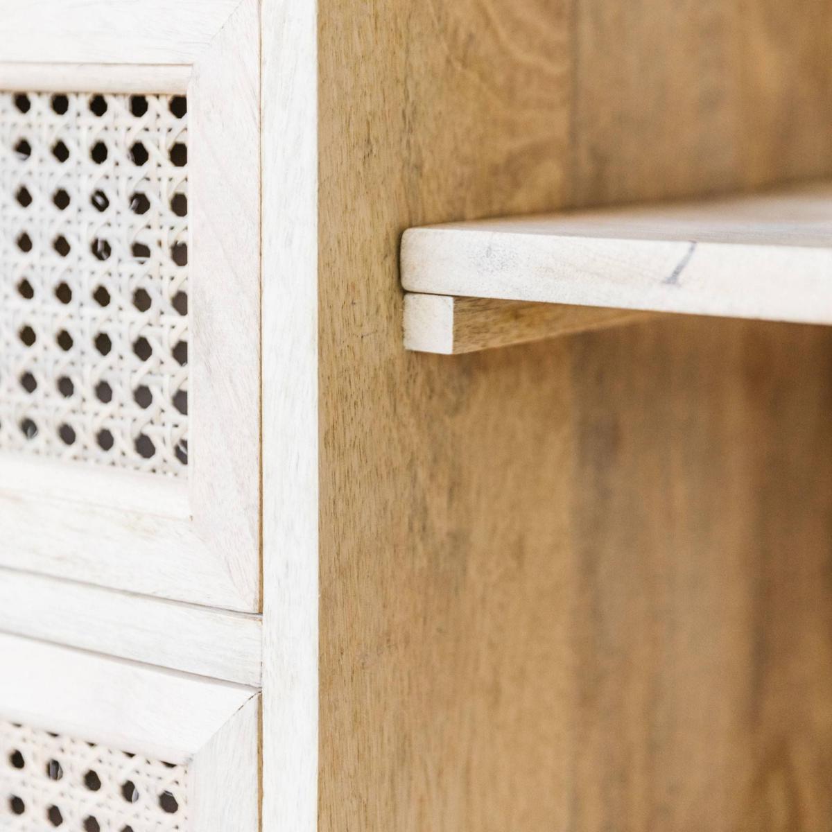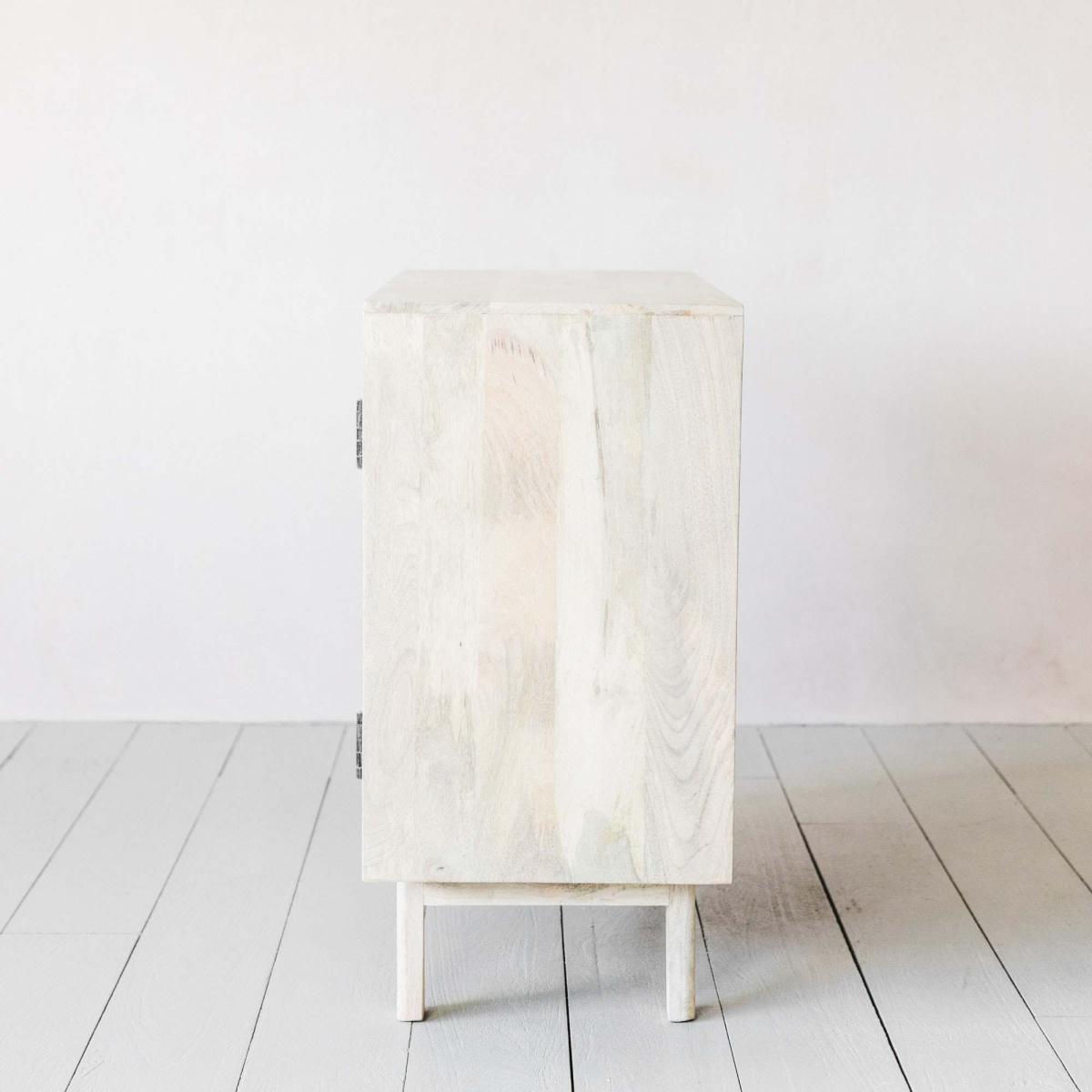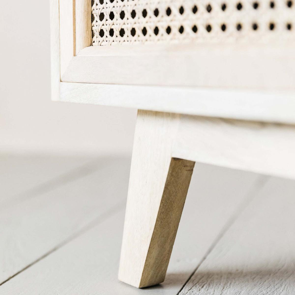 An unmistakable seventies revival, our Esben cabinet is handcrafted from solid mango wood with a white patina finish and a distinct retro-inspired webbed cane front. Featuring three deep drawers and two shelves hidden behind a single door, this handsome cabinet perfectly combines style and functionality.