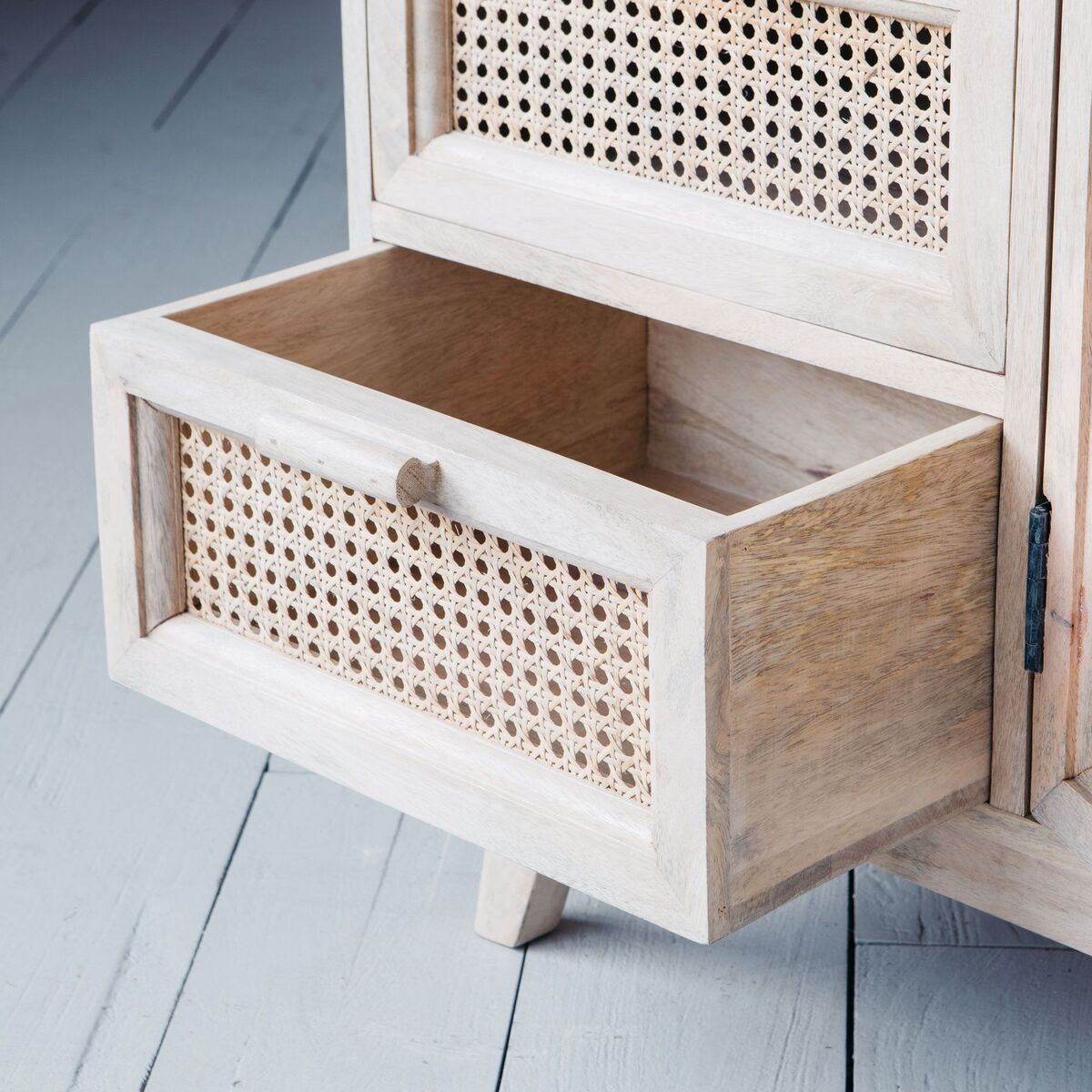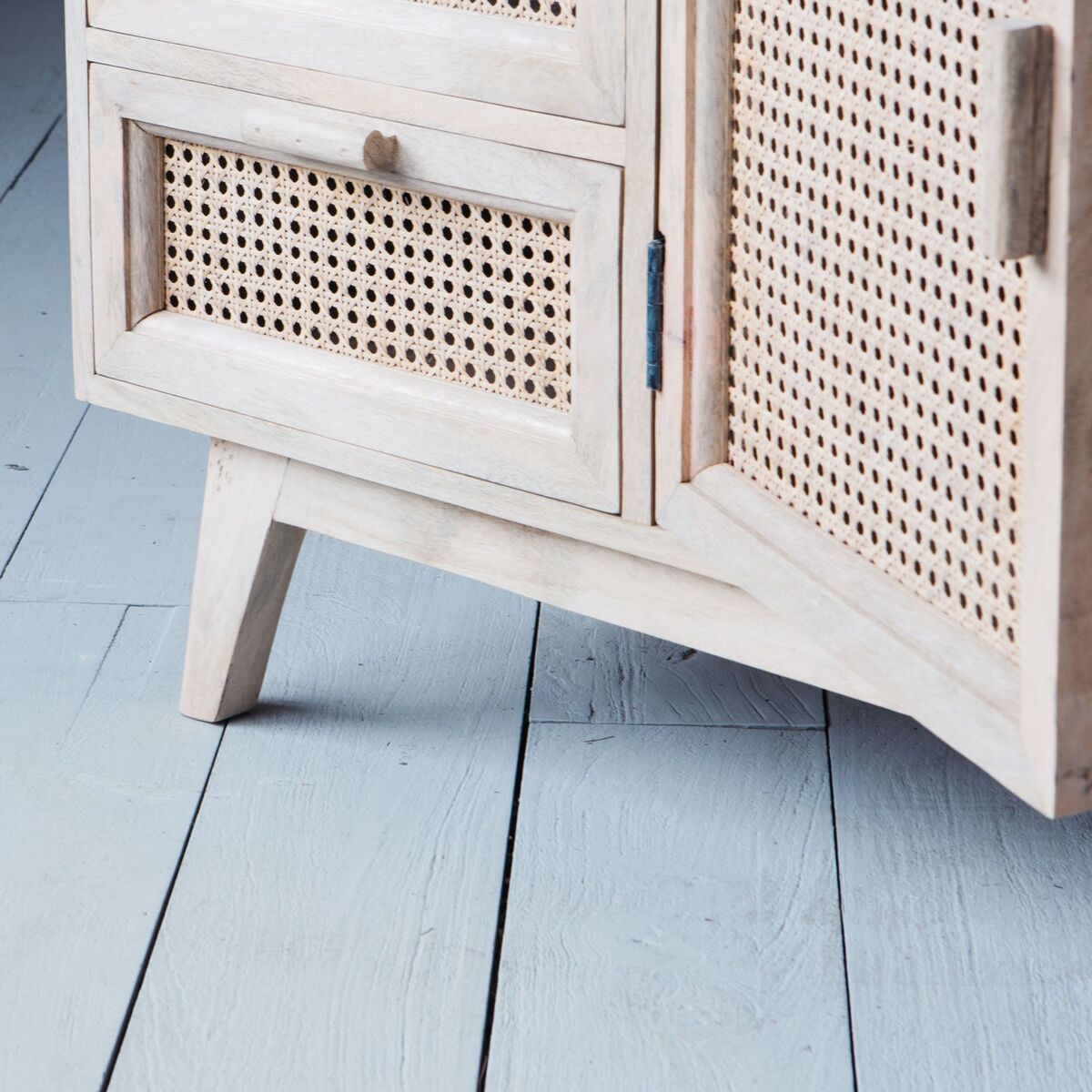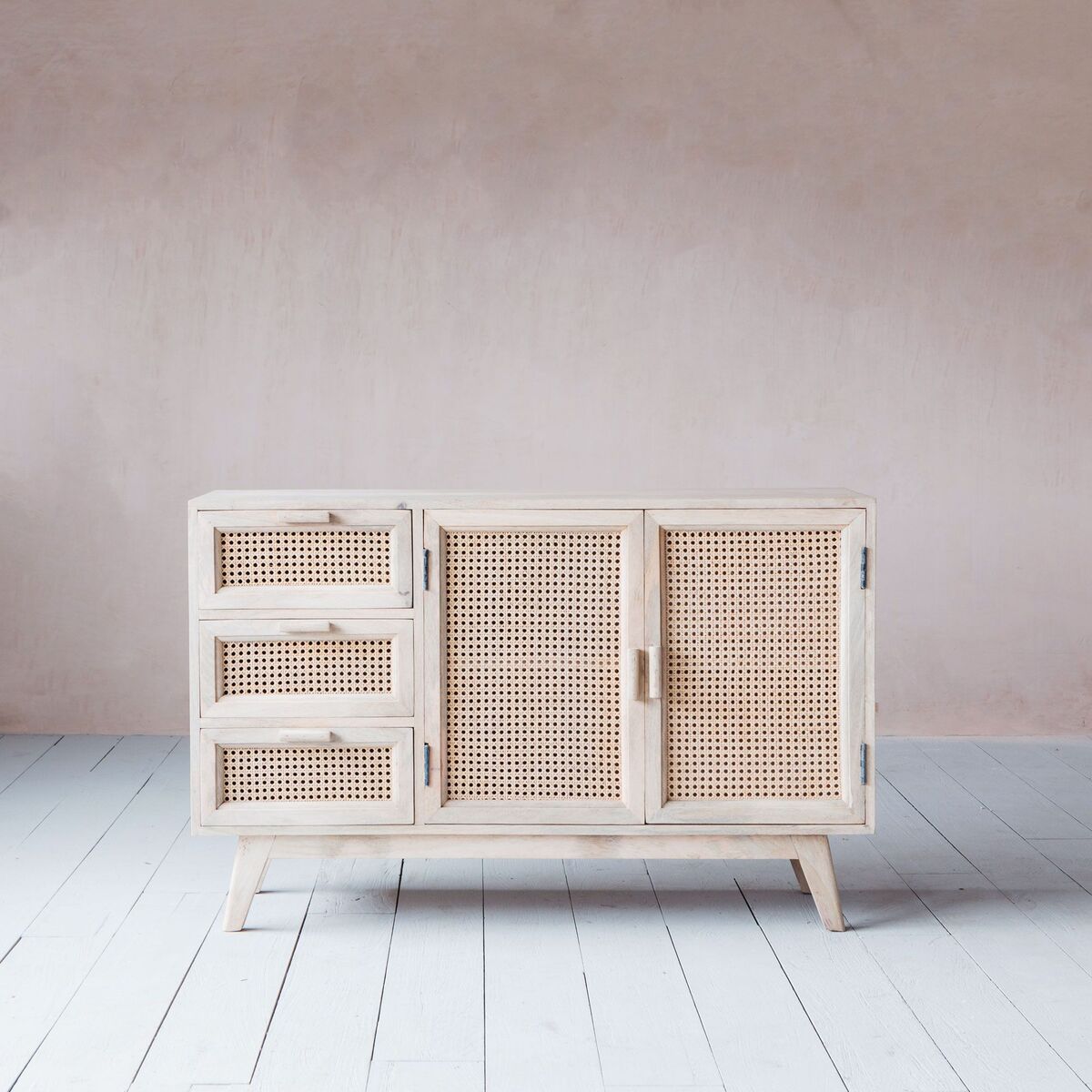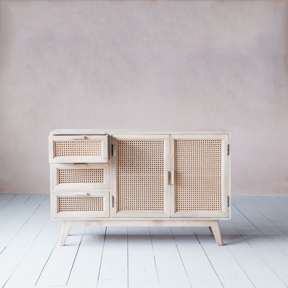 An organic natural sideboard that stylishly transcends the seventies era it draws inspiration from. Handcrafted from mango wood with a subtle patina and cane detailing, three useful drawers and shelving inside provide plenty of storage for a cool laidback addition to your home.