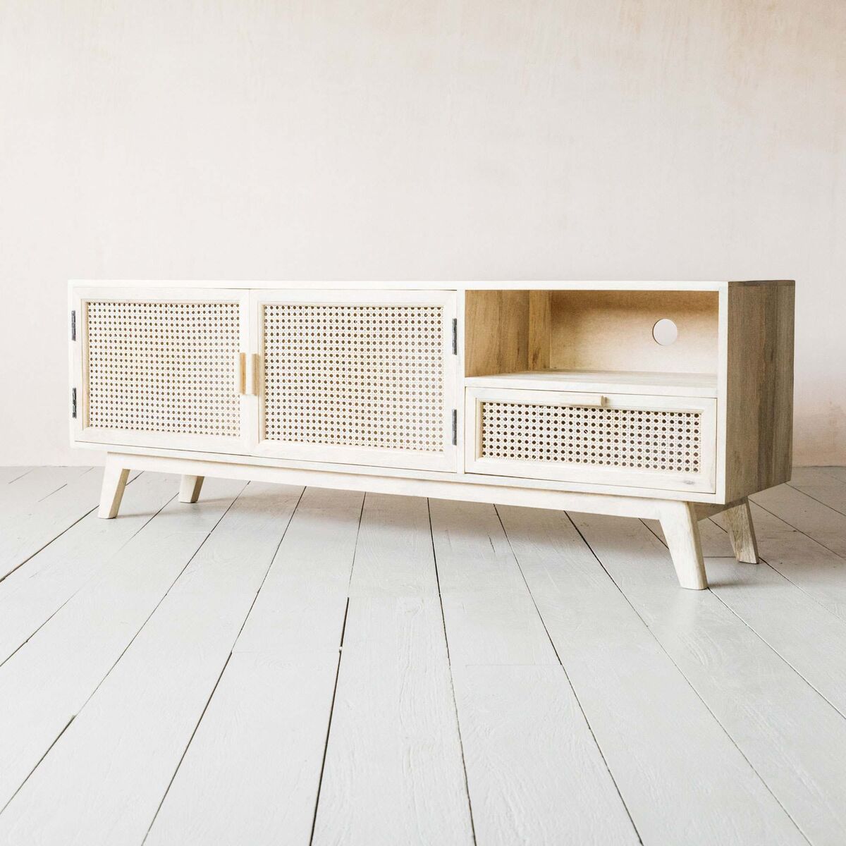 Seventies-inspired with a Scandinavian twist, our Esben TV stand is a must-have this season. Crafted from solid mango wood with a subtle white patina finish and a cane webbed front, this stylish storage solution features two doors and one drawer providing ample space for consoles and media devices.