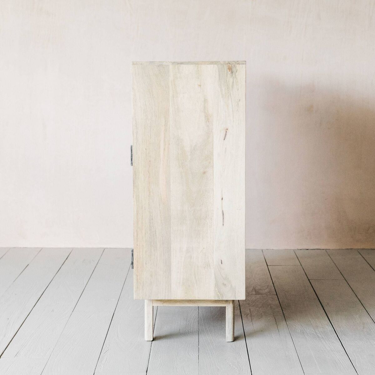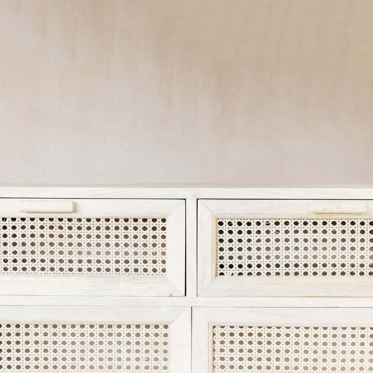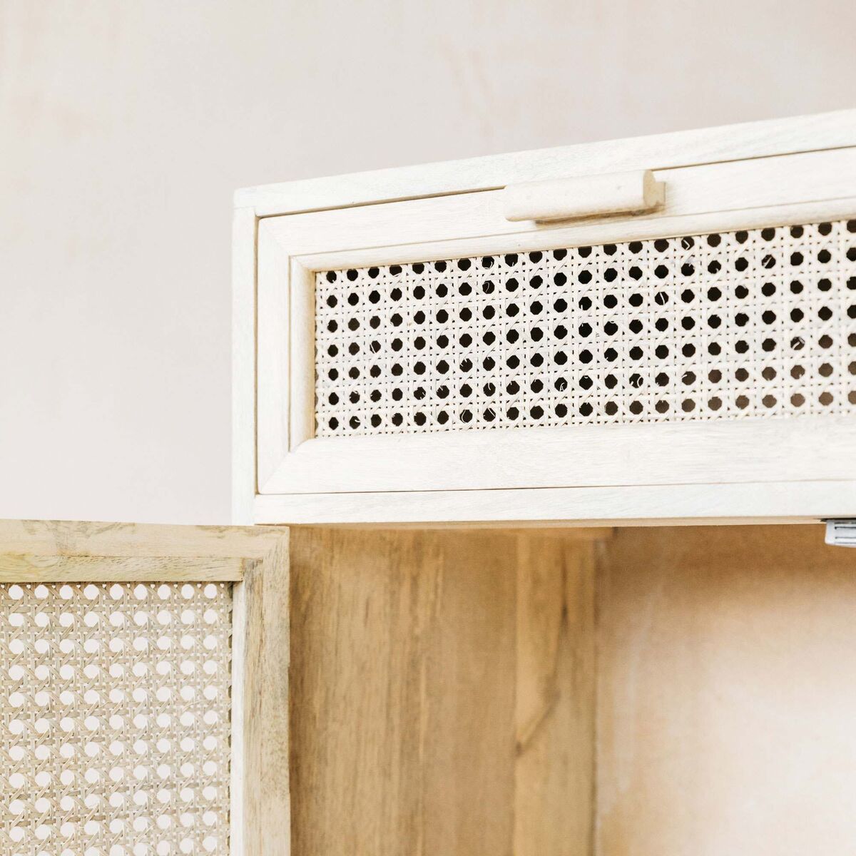Bring a natural and organic texture to your space with our statement Esben sideboard. Handcrafted from mango wood with a subtle white patina finish and a seventies-inspired cane webbed front, this timeless piece is the perfect stylish storage option for cool, laid-back interior spaces.
