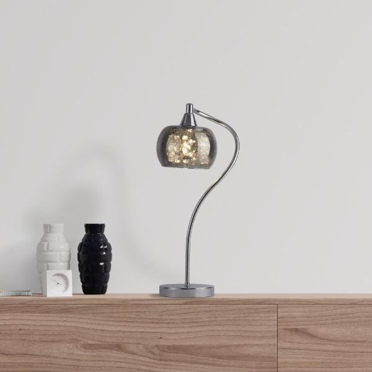 Contemporary table lamp boasting a polished chrome base, complete with a smoked glass shade. A gorgeous addition to your home, this table lamp is part of the Escada range from Pagazzi Lighting. Boasting an elegantly curved, polished chrome base, the lamp has been paired with a smoked glass shade with clear beaded detailing surrounding the light bulb. It is ideal for use as a bedside lamp, in hallways and living rooms. We recommend using our 3w LED G9 capsule bulbs which are a great replacement for standard halogen bulbs. Contemporary table lamp boasting a polished chrome base, complete with a smoked glass shade. A gorgeous addition to your home, this table lamp is part of the Escada range from Pagazzi Lighting. Boasting an elegantly curved, polished chrome base, the lamp has been paired with a smoked glass shade with clear beaded detailing surrounding the light bulb. It is ideal for use as a bedside lamp, in hallways and living rooms. We recommend using our 3w LED G9 capsule bulbs which are a great replacement for standard halogen bulbs.