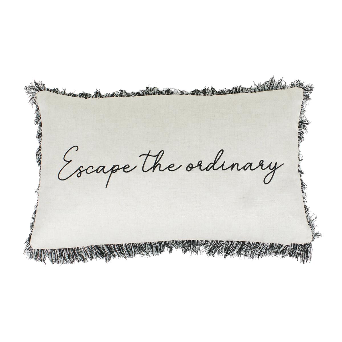 Elevate your home's decor with the Escape Fringed Cushion. It showcases an 'escape the ordinary' lettering along with a monochrome colourway to complement various homes perfectly. With a tactile fringed edge, this cushion effortlessly adds playfulness to dull spaces. Place it on your sofa, bed, or outdoor swing chair to make a subtle style statement.