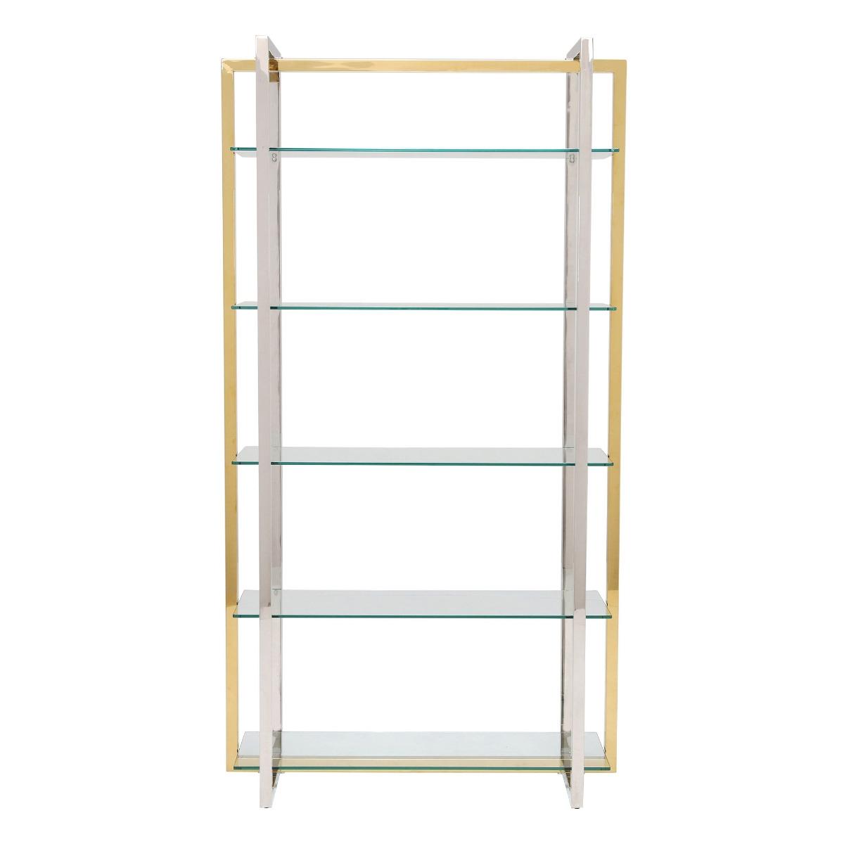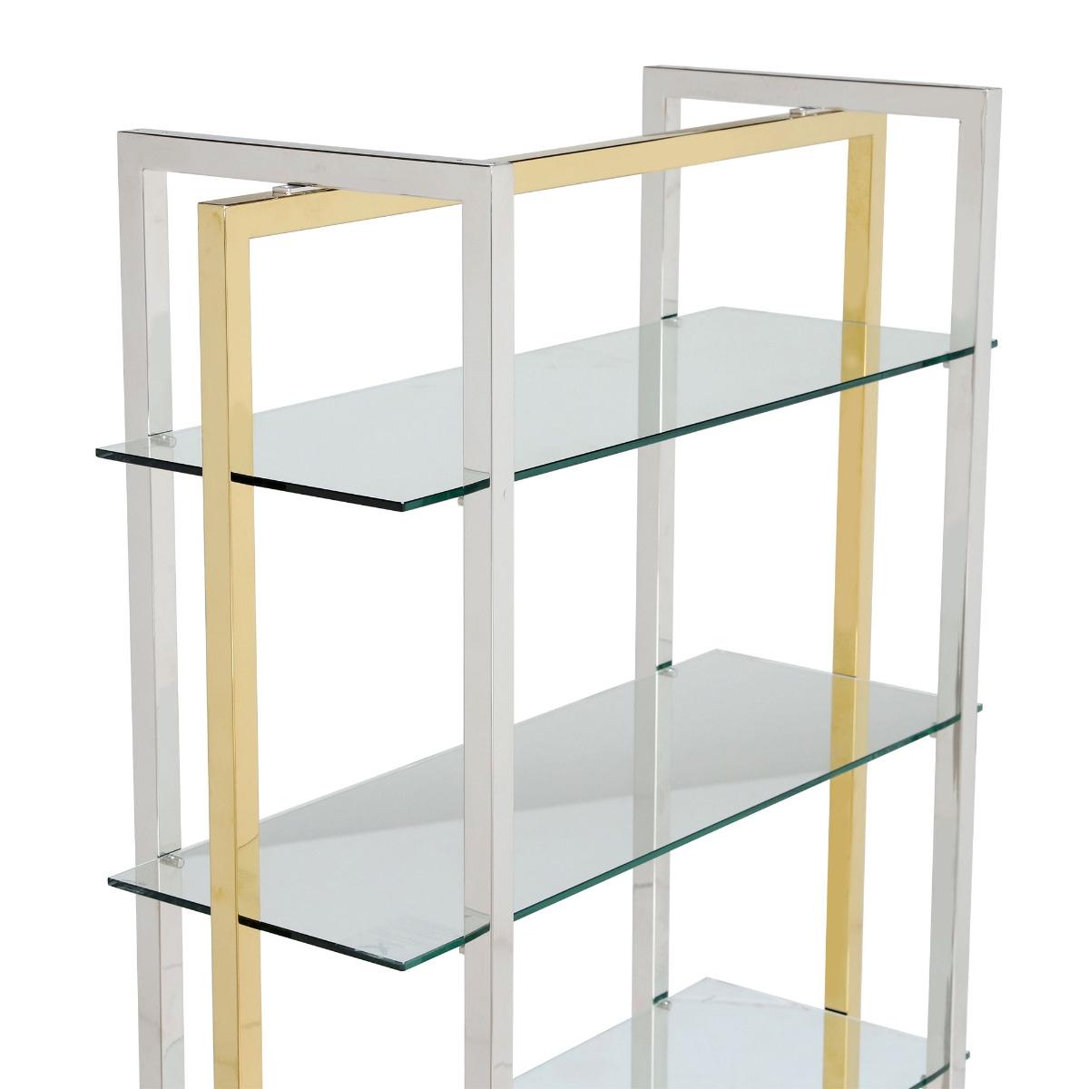 Design. Featuring clear glass shelves for a light, open look and a polished steel frame that’s beautifully reflective, the Escher glass shelving unit is the perfect place to showcase your treasured accessories. Its metallic silver and champagne finishes will complement both warm and cool colour schemes, while the slim, modern design offers ultimate elegance.