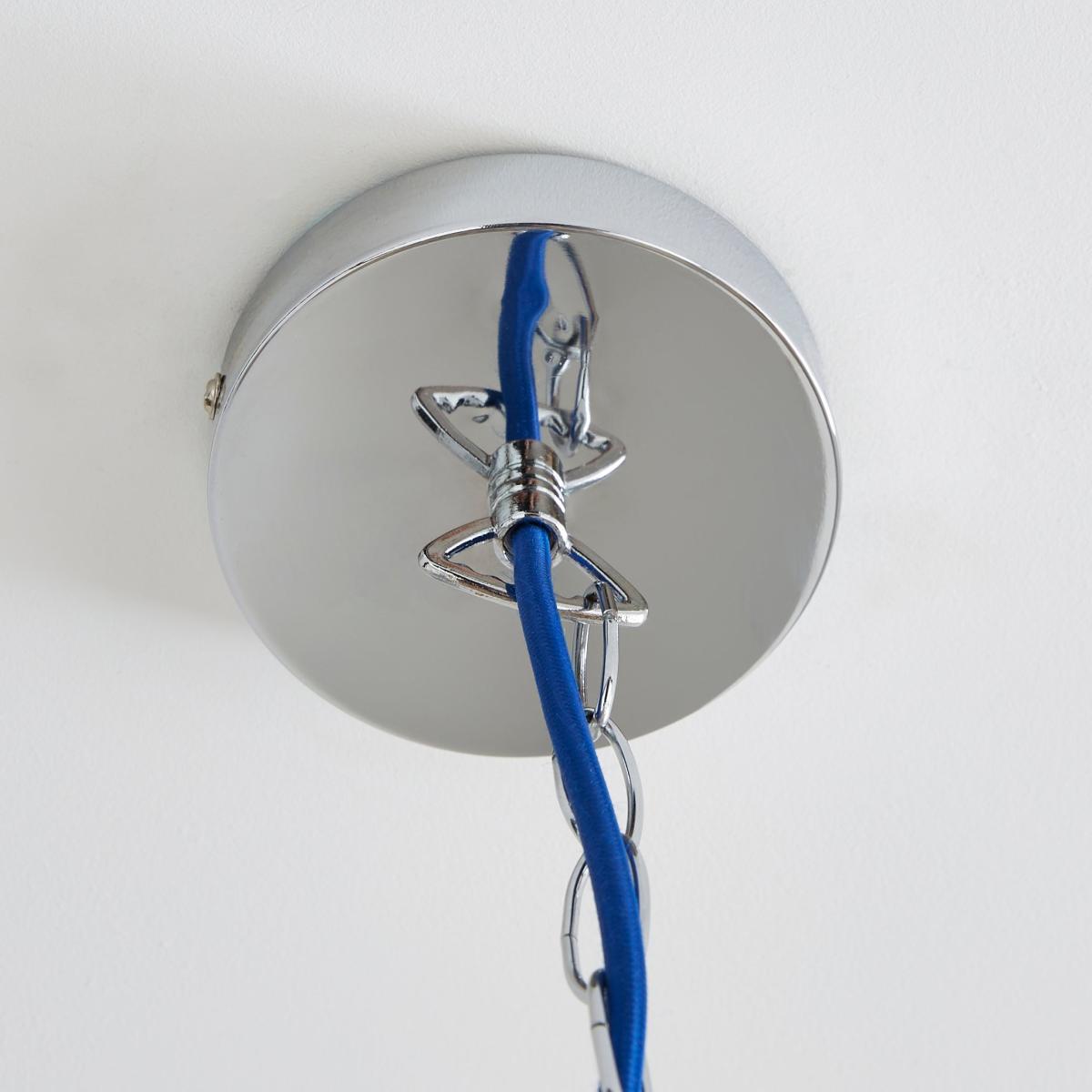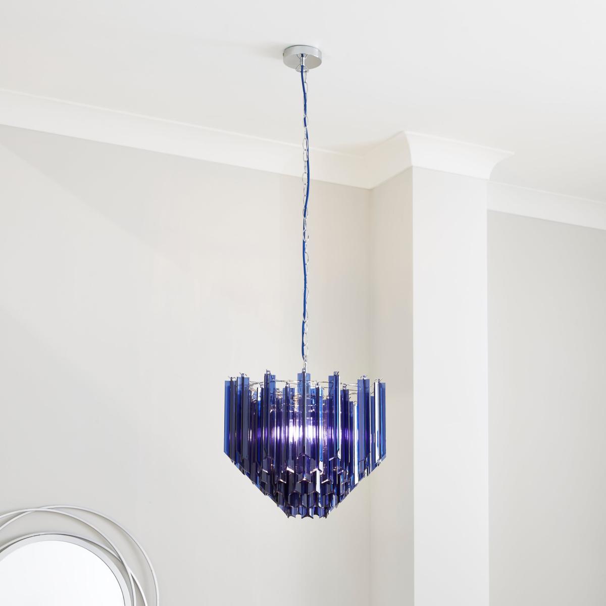 I love this chandelier because of its bold, contemporary design and striking blue finish, which makes it a real statement piece. It works particularly well in modern or minimalist interiors, adding a pop of colour without overwhelming the space. For practical styling, consider hanging it in a room with neutral or monochrome decor to let it really stand out, and ensure the ceiling height is sufficient to appreciate its shape without feeling cramped. Additionally, pairing it with simple, understated furnishings will keep the focus on its architectural appeal, making it a versatile choice for both living spaces and larger hallways.