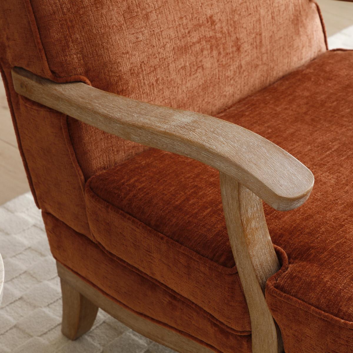 * Contemporary Chair* Curved arms* Cutaway back and cushions This chair features beautifully grey washed curved arms and a unique cutaway design on the back and seat cushion, creating a stylish silhouette that complements any modern interior. Upholstered in luxurious distressed chenille fabric, the Esme Chair offers both a plush seating experience and a sophisticated aesthetic. The seat is foam-filled to ensure maximum comfort and support, making it perfect for lounging, reading, or simply unwinding.