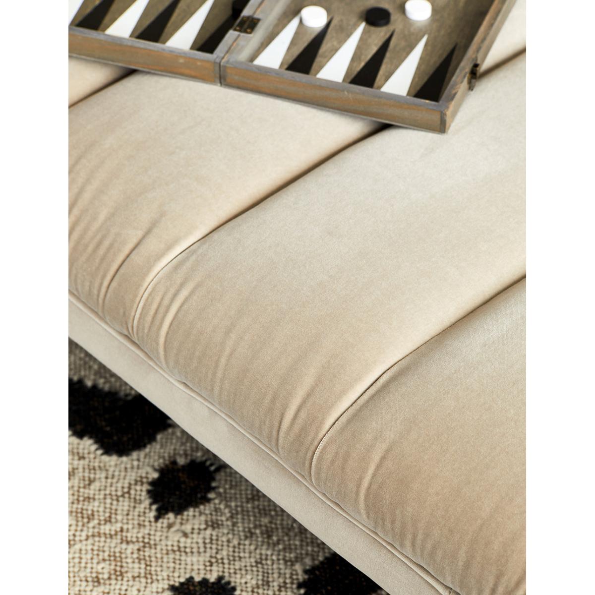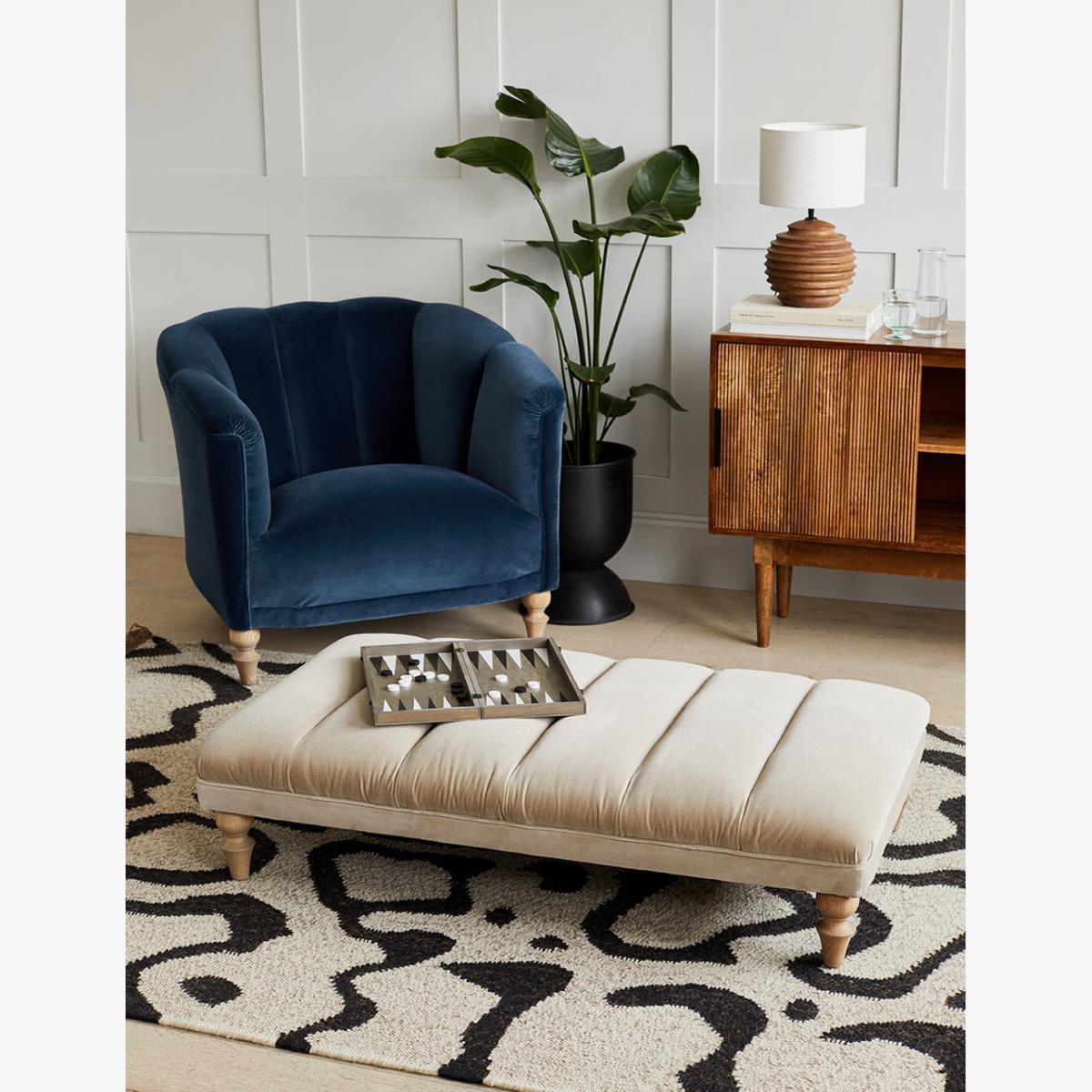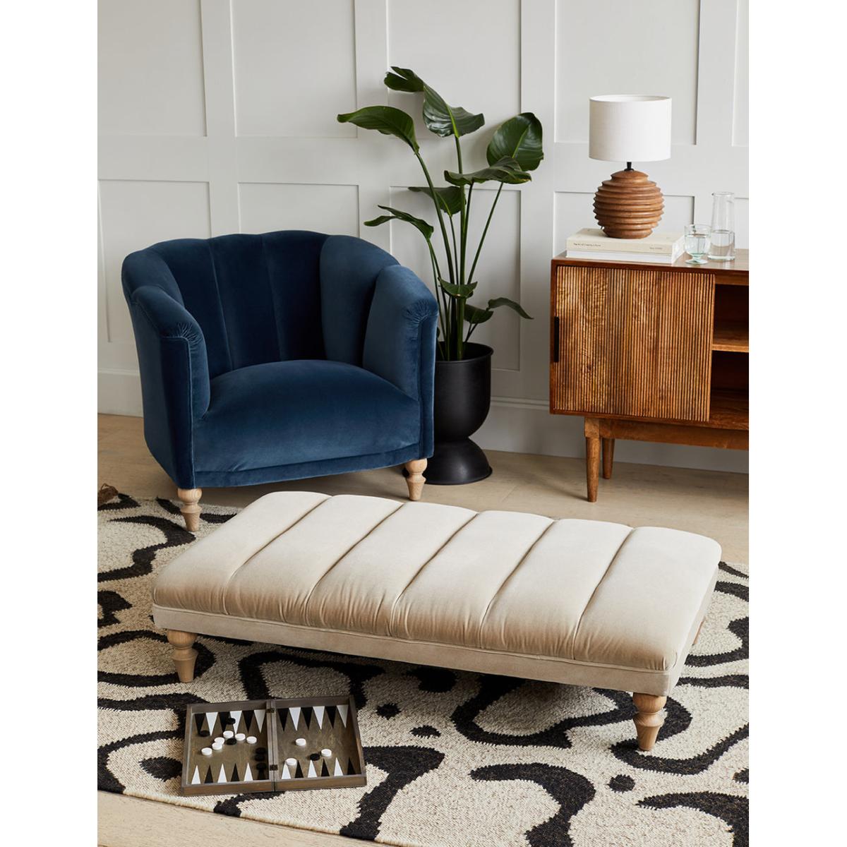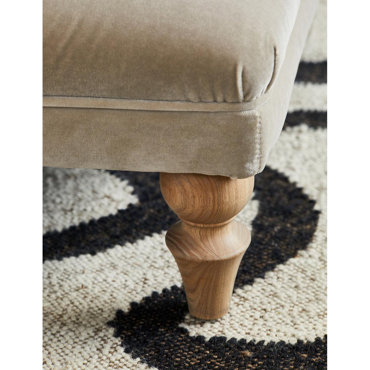 Put your feet up and get cosy on the Esme Footstool. A beautifully sculpted footstool with intricate fluted detail that creates a firm and plump footrest. Crafted from premium, luxurious fabric and handmade in the UK, our large Esme Footstool blends contemporary style with a classic design that brings a sophisticated touch to the room. Perfect for resting your feet at the end of a long day or for styling with a tray filled with your favourite home accessories. The Esme Footstool is part of our made to order furniture collection, select your fabric and leg colour to curate a piece of furniture to perfectly suit your own personal home interior style. Pair with our Rowan corner sofa or Margot chair to complete the look. Photographed here in Velvet Dove. The leg colour in the product image is driftwood. All other images are computer generated as a colour reference with a Driftwood leg. We recommend you order a free fabric swatch to see your chosen material up close before ordering your sofa.
